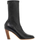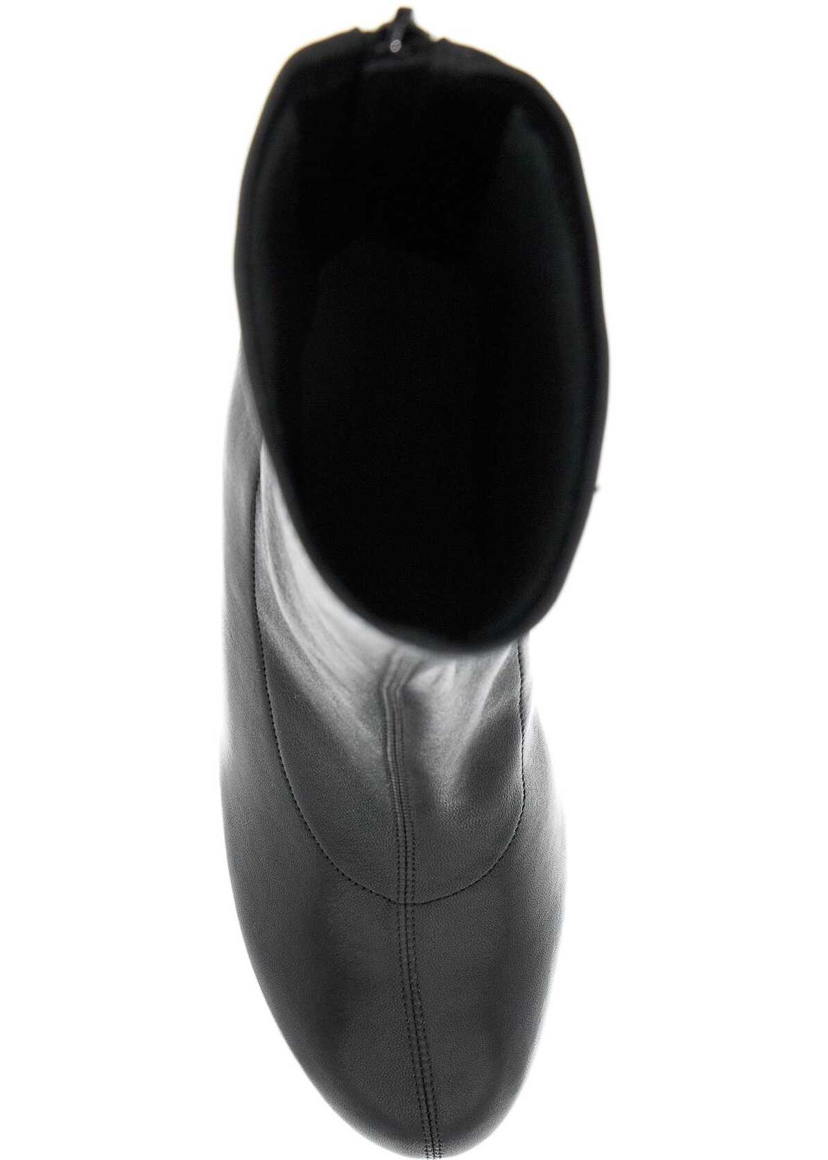 The Khaite Apollo 85 boots are made of stretch nappa leather, with soft lines and a sock-like shaft inspired by classic ballerina shoes. They feature a zip closure at the back, a leather interior, a wide and angled contrasting heel, and a leather sole.