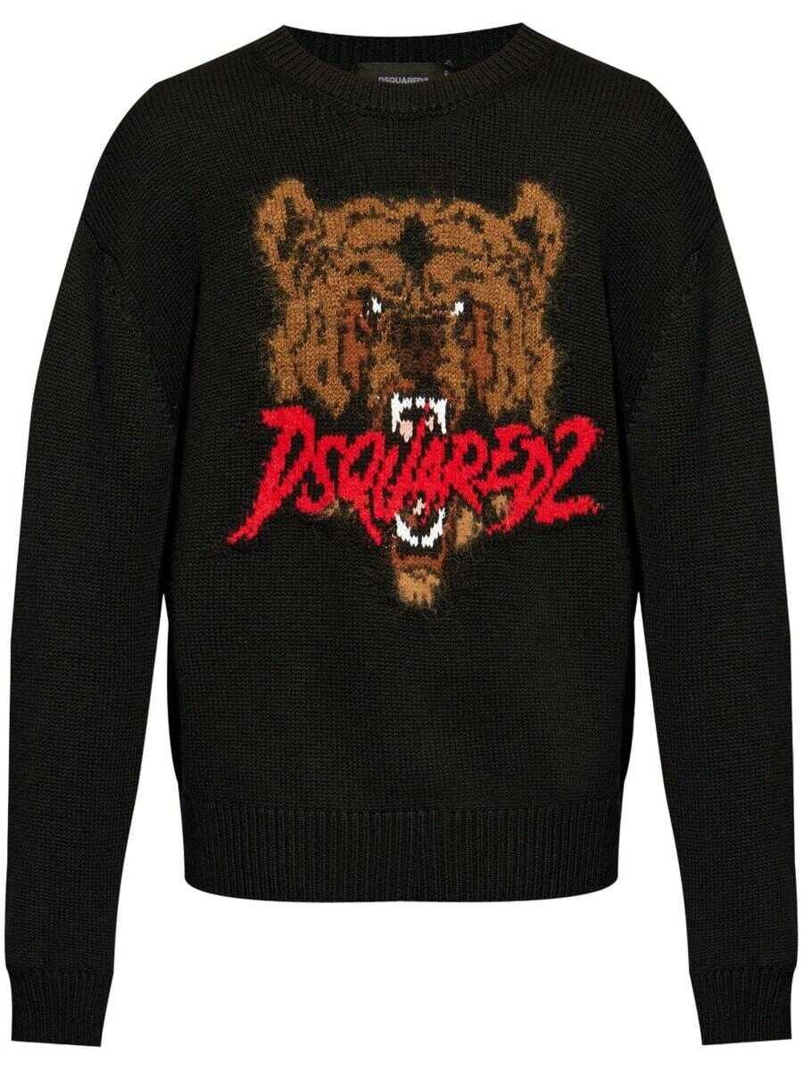 Black wool sweater by Dsquared2. Features a red front logo and embossed frontal bear. Ribbed cuffs, collar, and hem. Crew neck design. - Dsquared2 - Wool - Black - Front logo and bear - Men