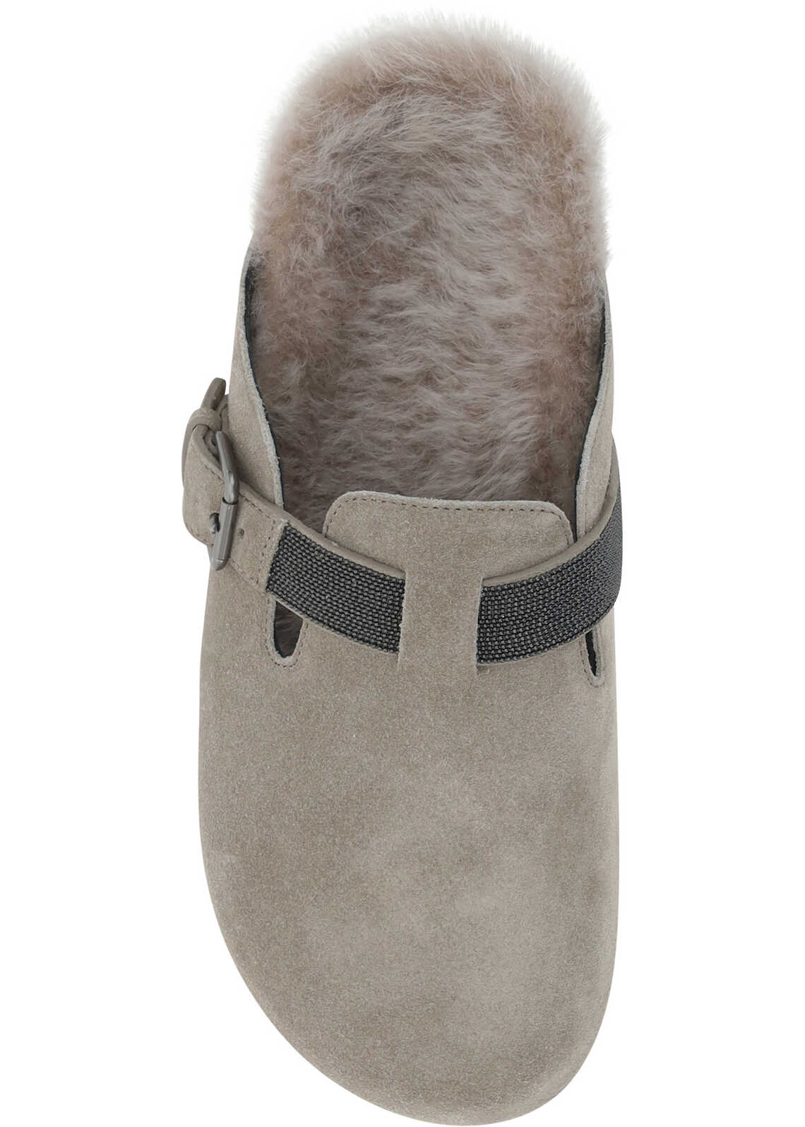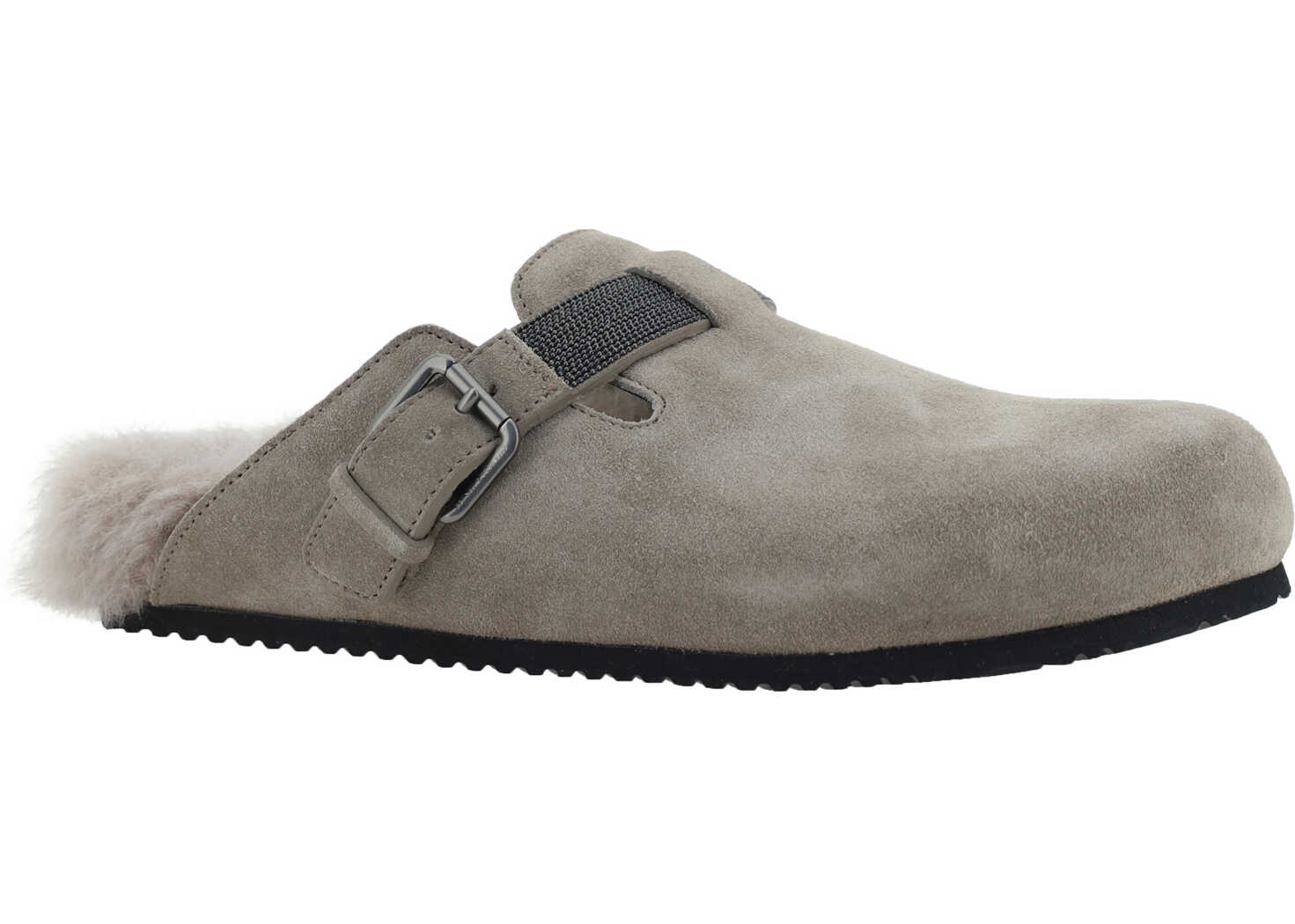 Calfskin Mulesby Brunello Cucinelli, round toe, slip-on style, front applique tray with adjustable buckle, brand's iconic appliqué jewelry detail on front strap, suede leather design.