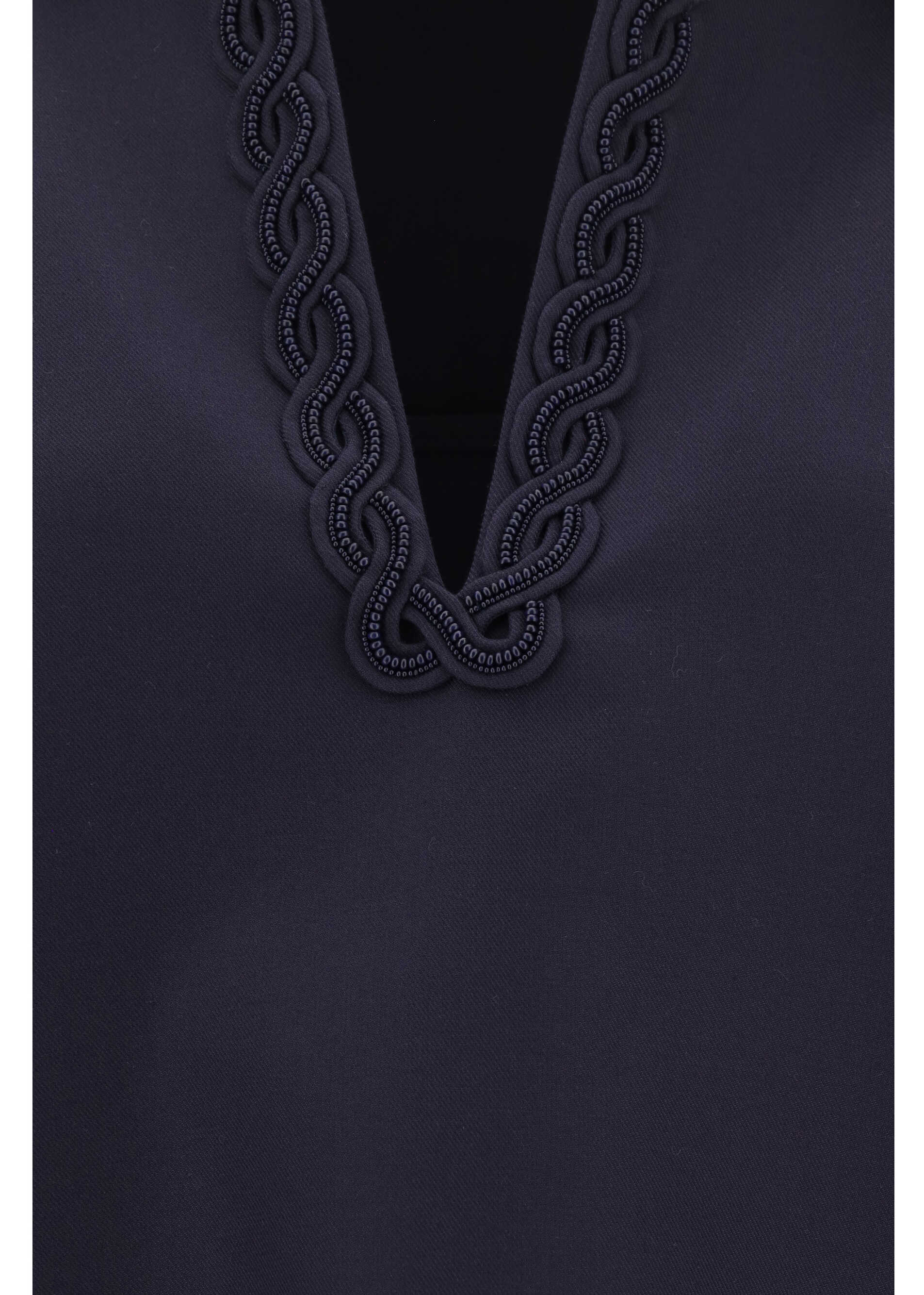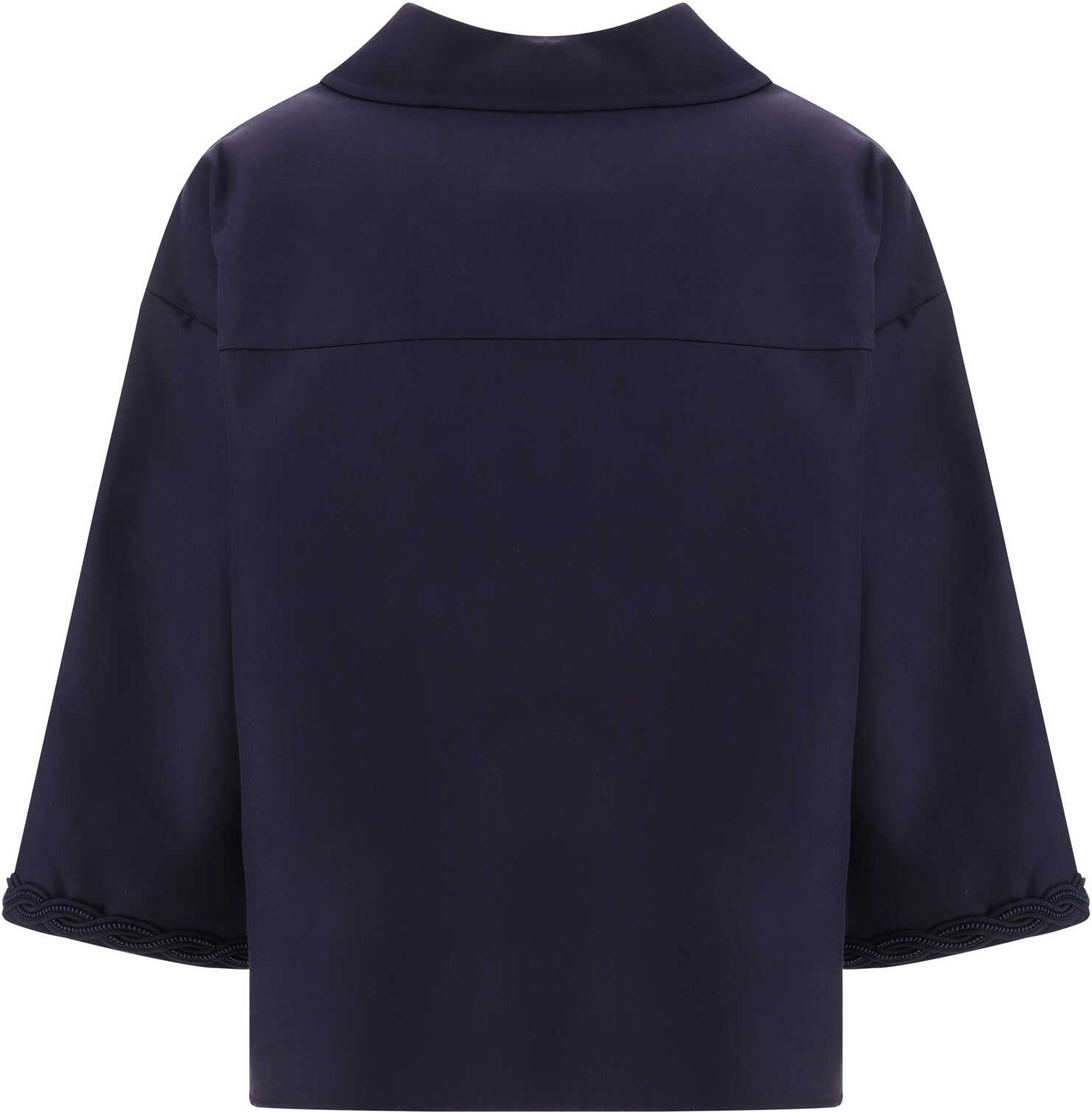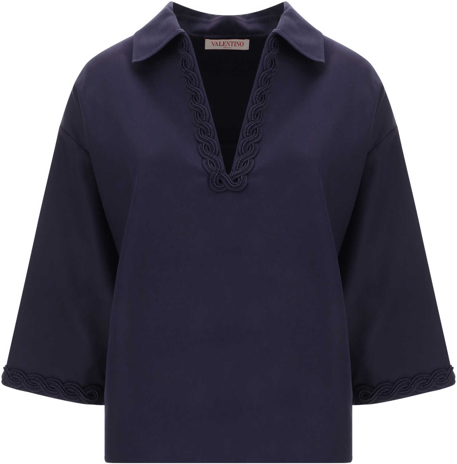 Cotton Blouse by Valentino, featuring classic collar, V-neck front embellished with tone-on-tone braid applique, three-quarter length sleeves with braid detail at hem, two side slits, monochrome pattern, oversize fit.