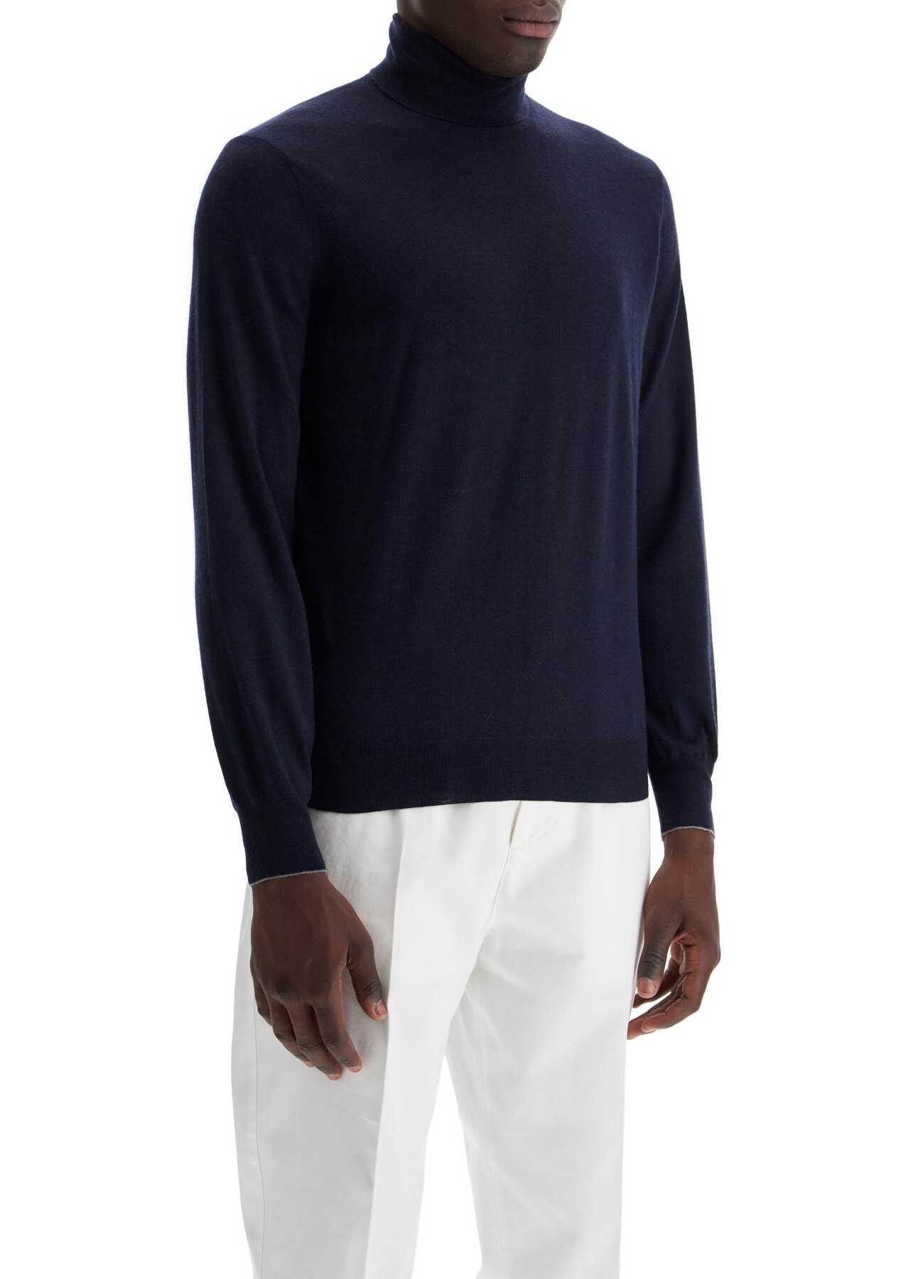 This high-neck pullover by Brunello Cucinelli is made of a lightweight blend of virgin wool and cashmere, with a regular fit. The ribbed edges and cuffs are finished with a contrasting micro border. The model is 187 cm tall and wears size IT 48.