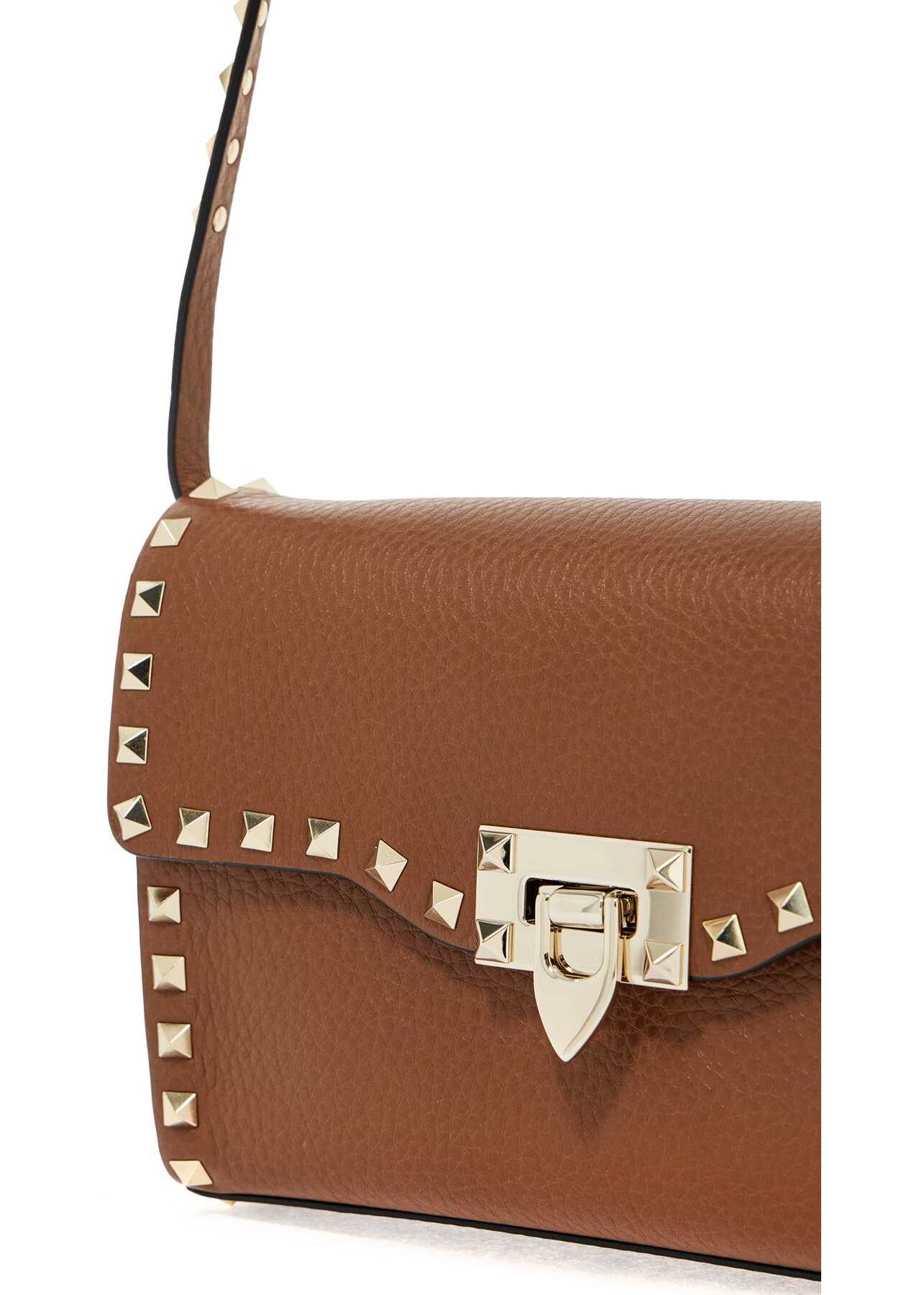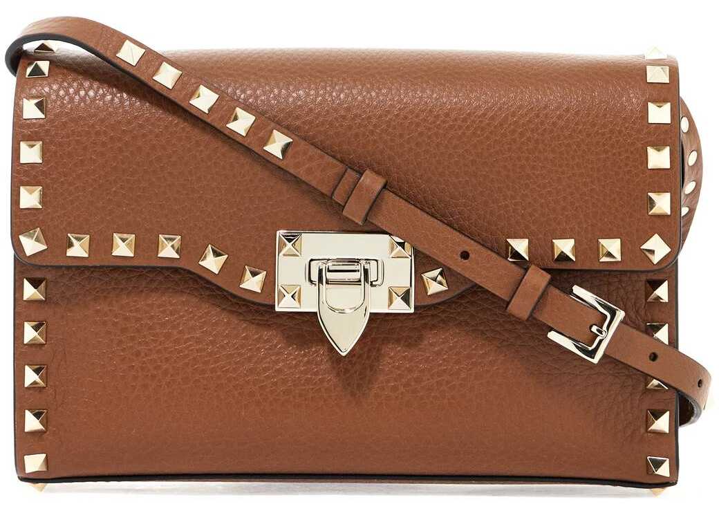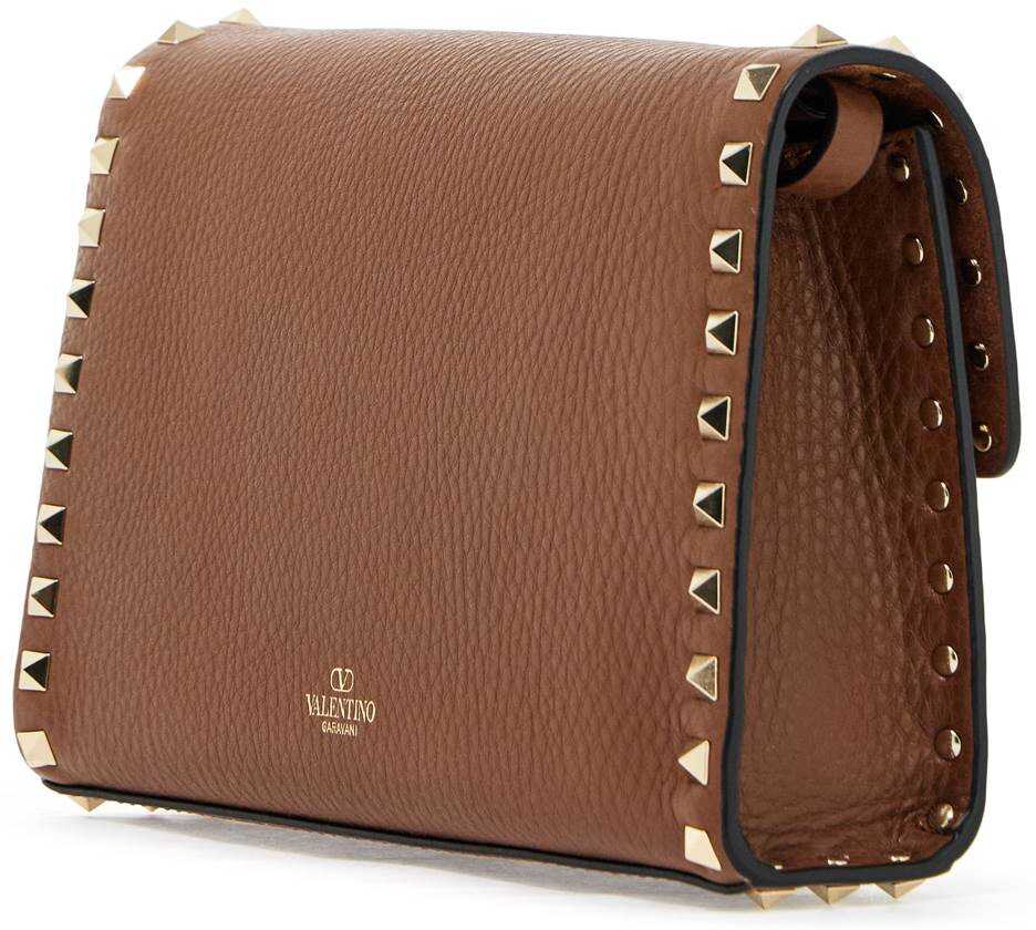 Valentino Garavani small Rockstud bag in grained leather with the iconic pyramid studs along the edges. Removable and adjustable studded shoulder strap, flap with hook closure. Suede interior with a patch pocket. Gold-tone logo print on the back, gold-finished metalware.