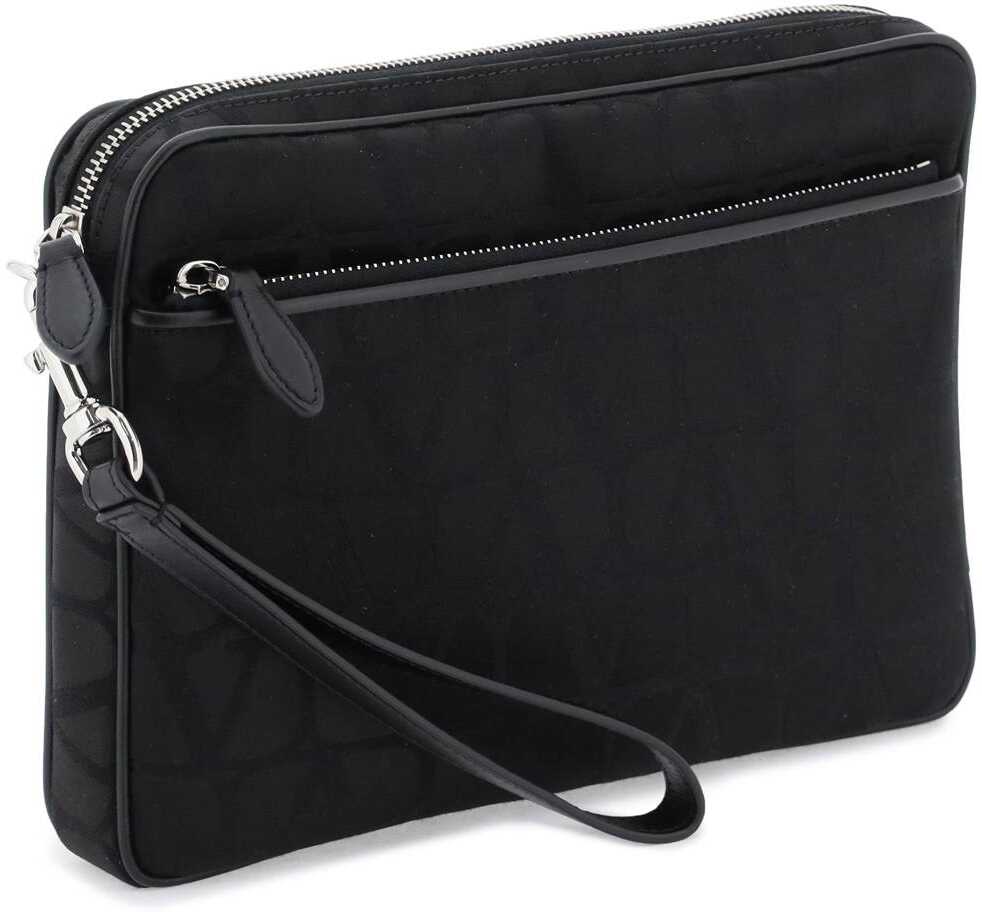 Valentino Garavani pouch made of nylon with Black Iconographe print. Zipper closure, lined interior with one open pocket and between credit card slots, additional front pocket and removable wrist handle. Silver-finished metalware.