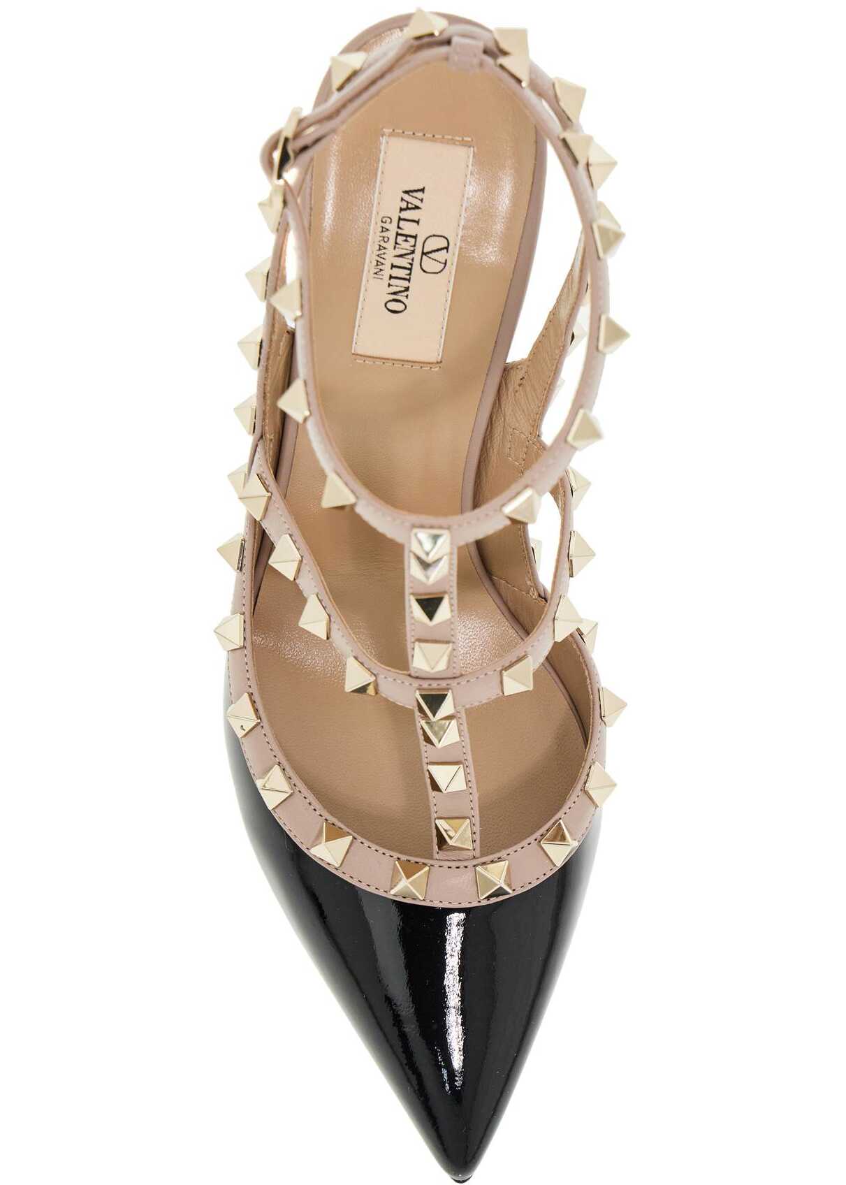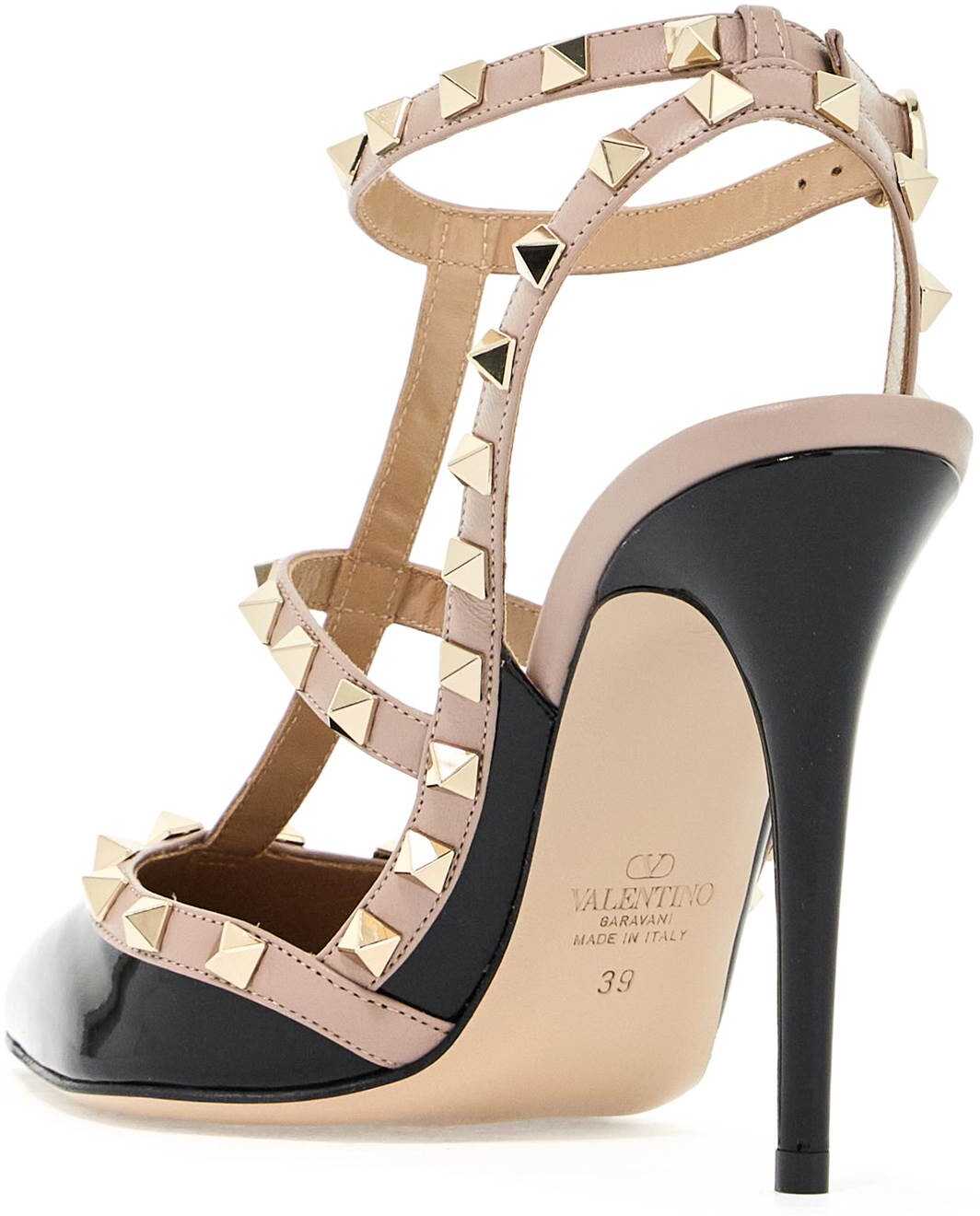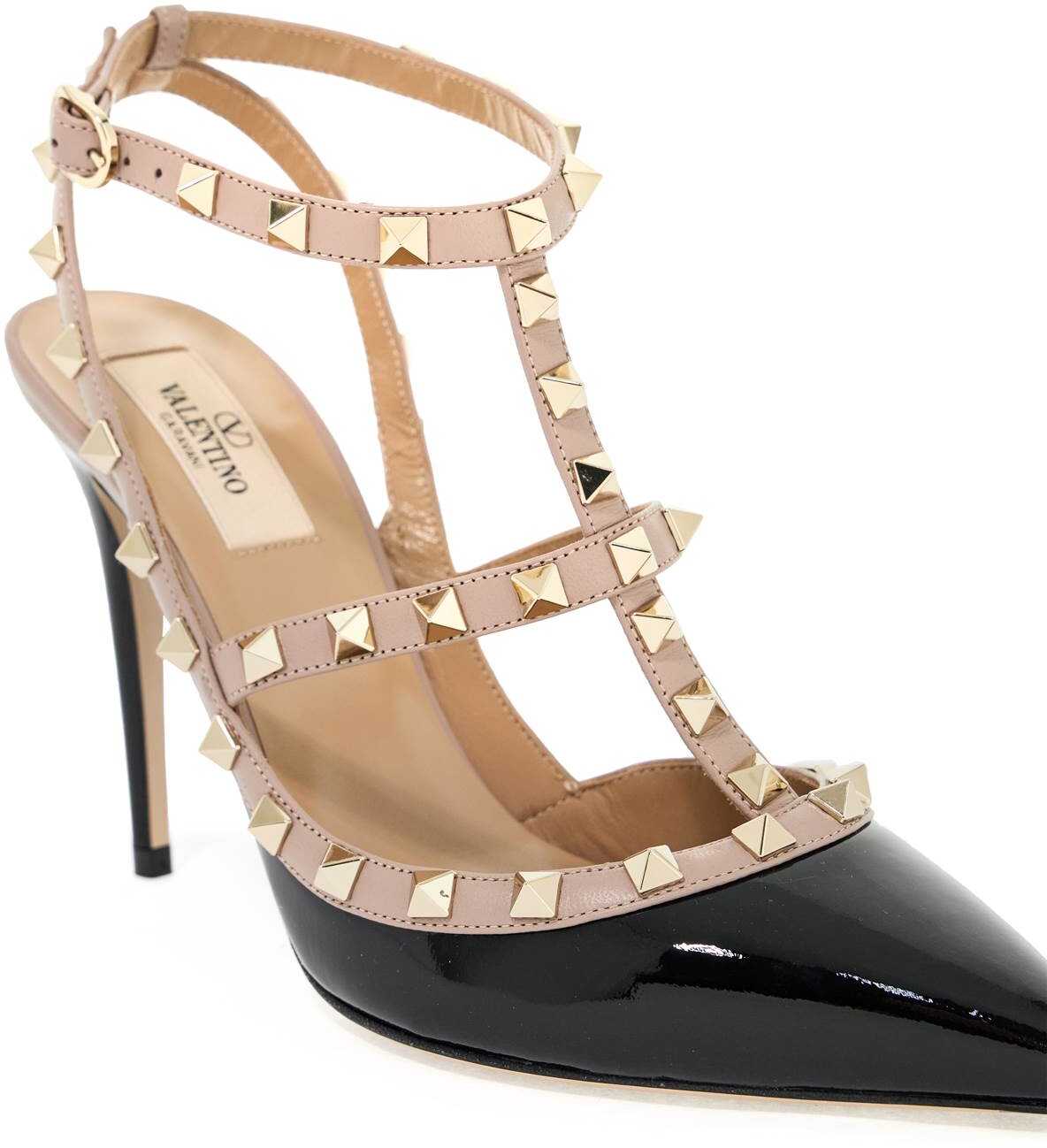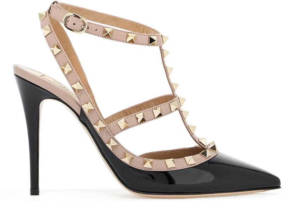 Valentino Garavani slingback in patent leather with profiles and straps decorated with iconic metal studs with platinum finish. Adjustable ankle strap with buckles, leather interior and leather sole.
