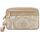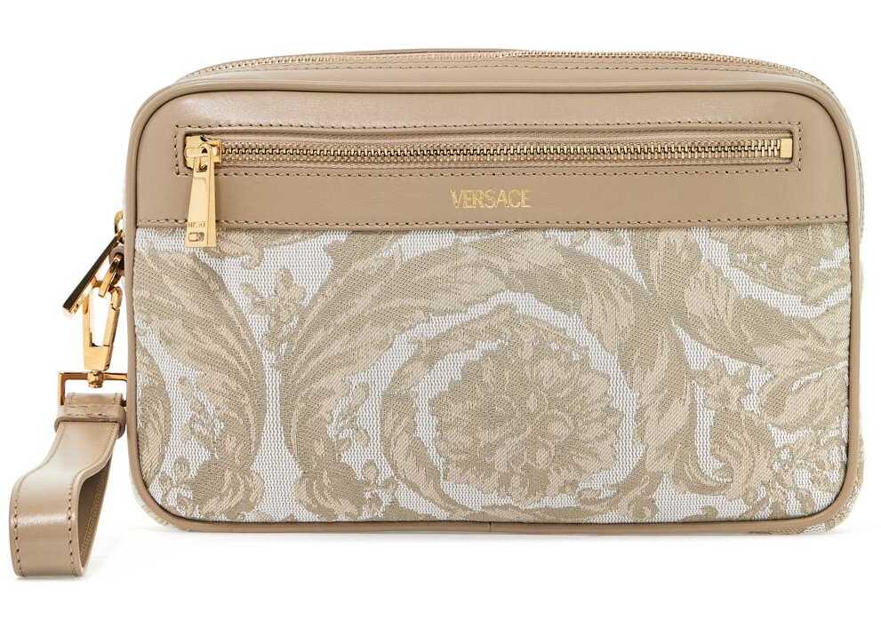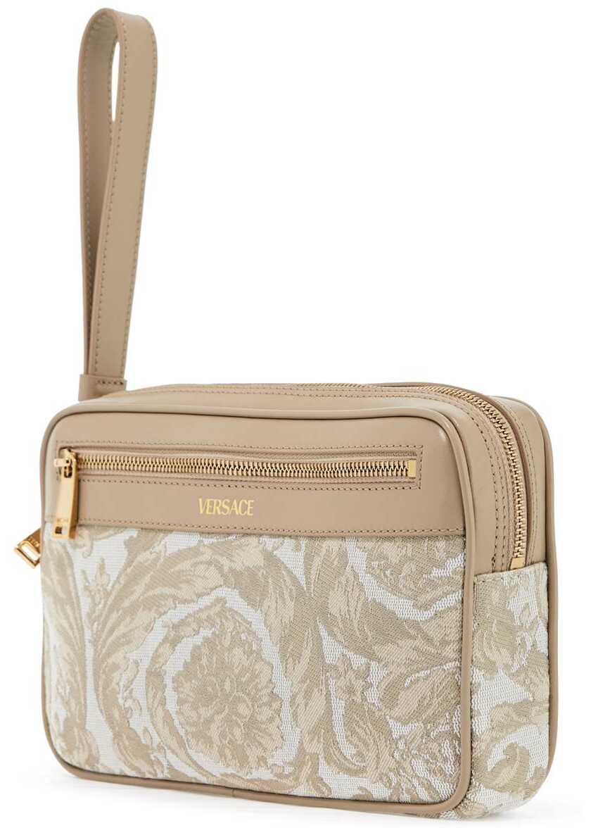 This Versace pouch is made of jacquard Barocco fabric with leather inserts. It features a zip closure and a cotton-lined interior with six leather credit card slots, an additional front pocket, and a removable wrist strap. The metallic accessories have a gold finish.