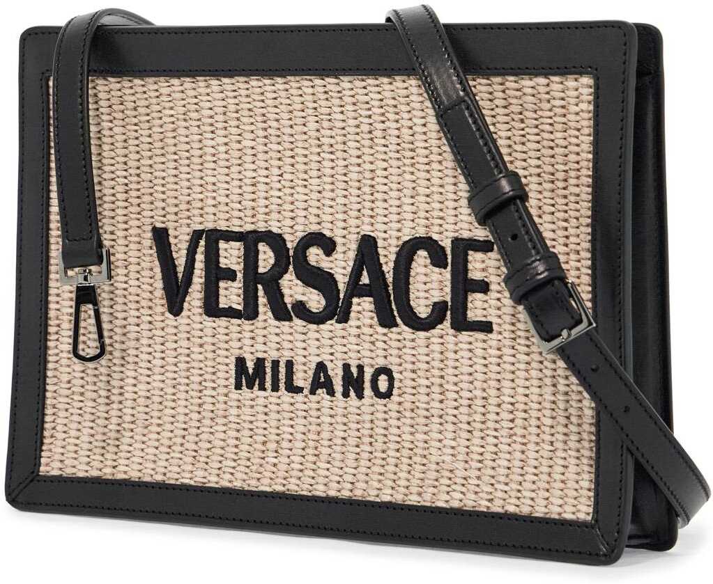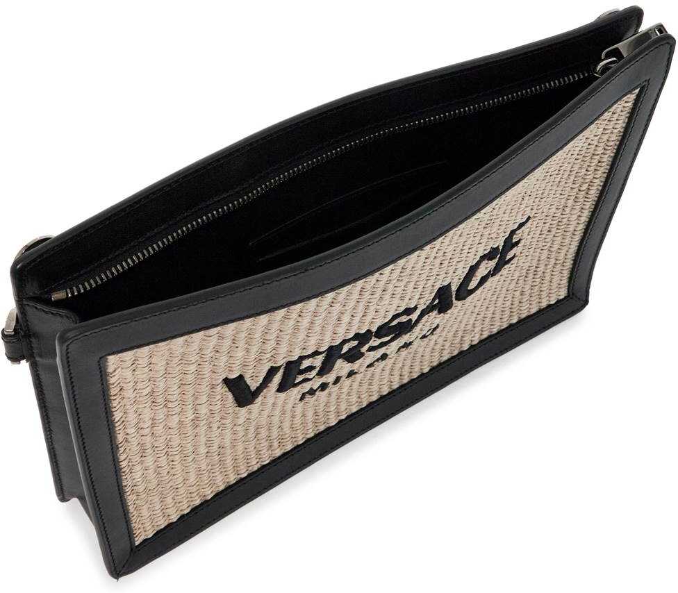 Versace raffia pouch with contrasting leather trims and embroidered logo lettering on the front. Zip closure, fabric interior with three credit card slots and adjustable/removable wrist strap. Equipped with adjustable/removable shoulder strap.