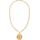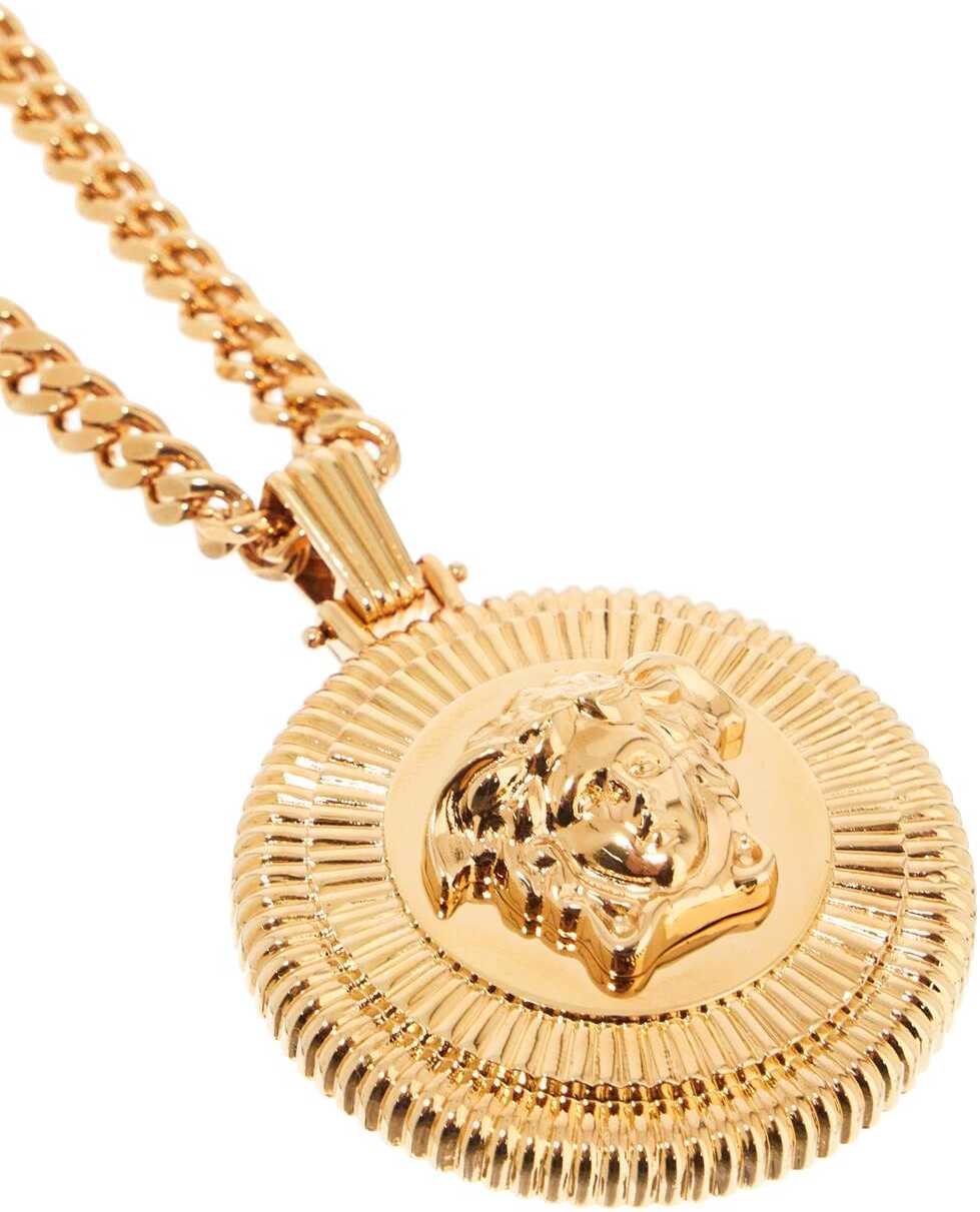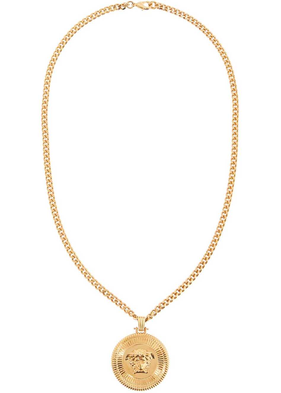 This necklace is made of brass with a Versace gold finish, featuring a chain and a maxi Medusa Biggie pendant. It is nickel and lead-free, with an adjustable clasp closure.