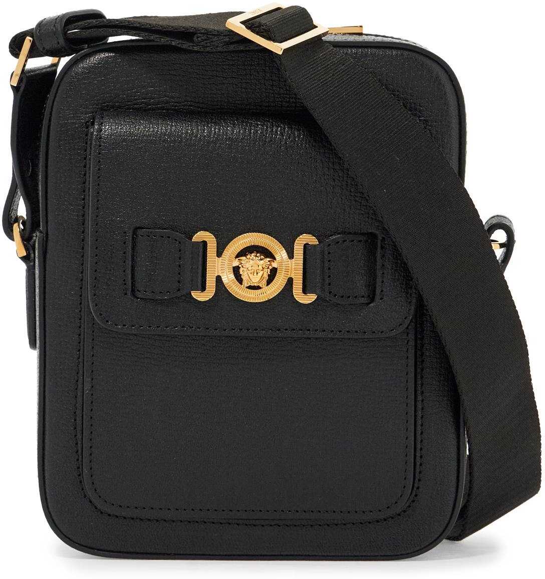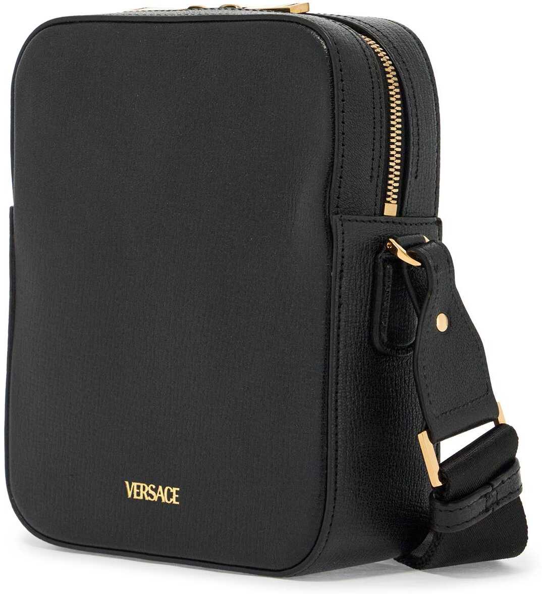 This Versace shoulder bag is made of textured leather with a gold metal Medusa Biggie detail applied on the front pocket flap. The main compartment has a double zip closure and the interior is lined with nylon, featuring an open pocket and an adjustable strap in ribbon.
