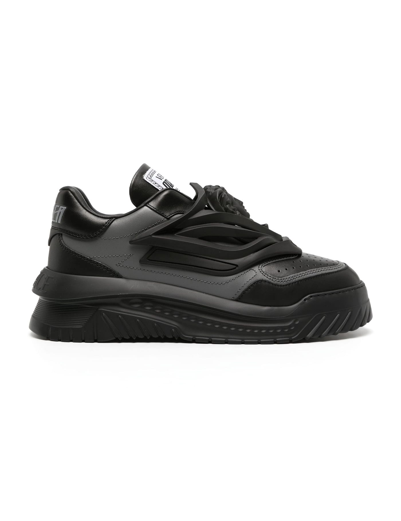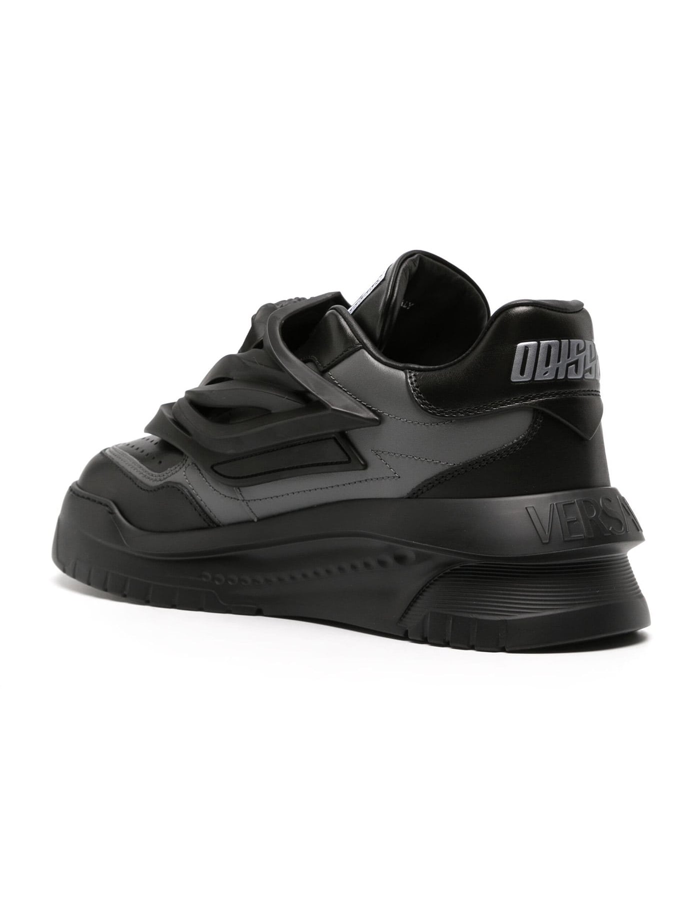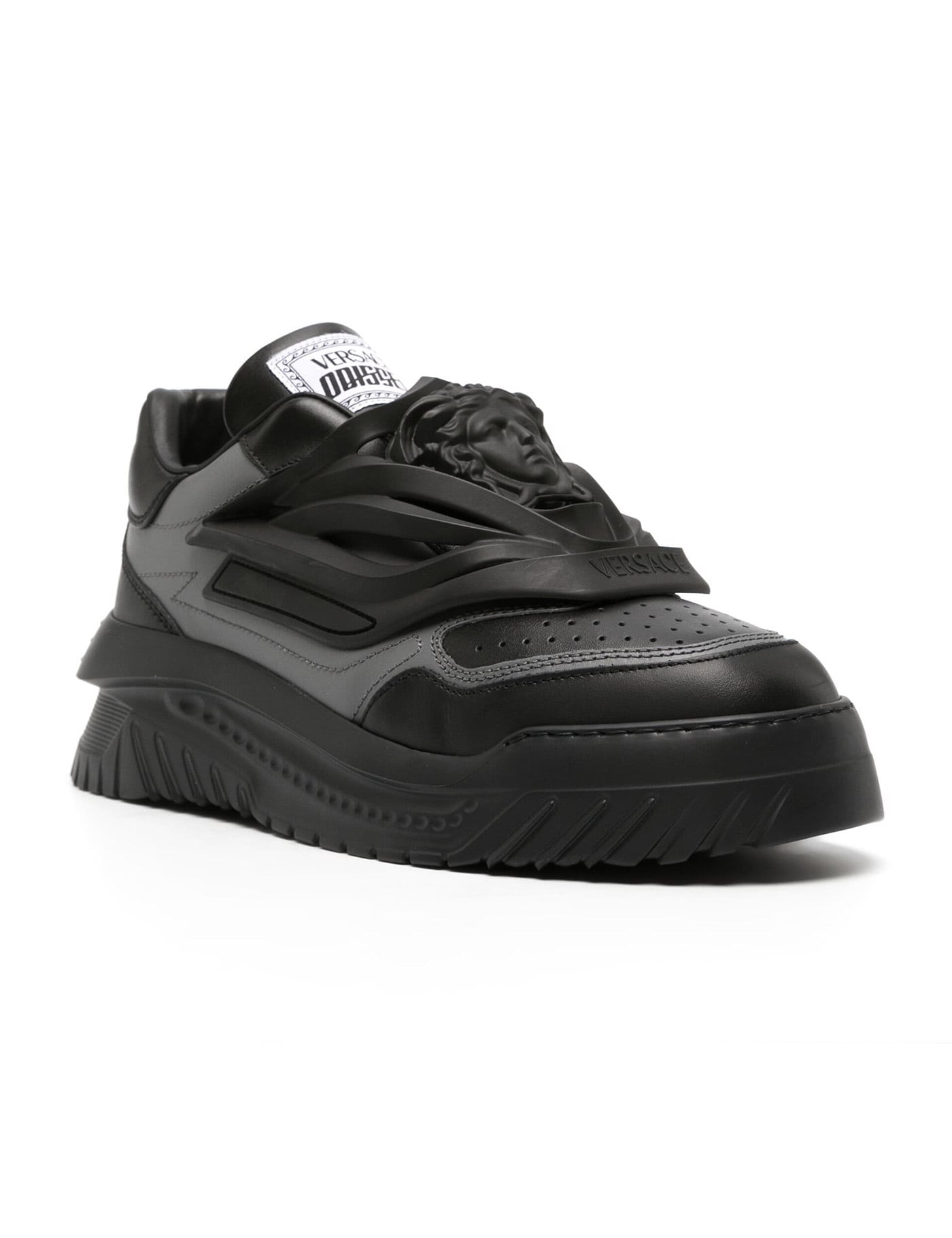 Odissea two-tone smooth leather sneakers by Versace, with perforated toe caps and rubberized, tone-on-tone La Medusa on the upper for a three-dimensional effect. Slip-on design featuring Odissea logo patch on the tongue and a printed version on the heel tab, leather interior with removable insole and lightly oversized rubber sole with embossed lettering logo.
