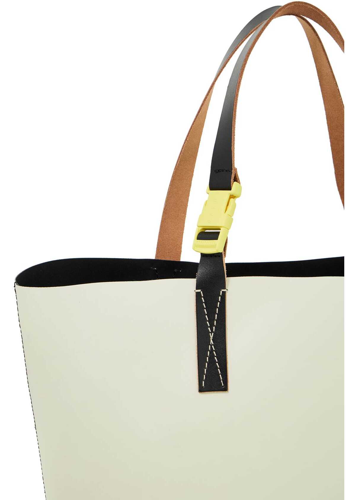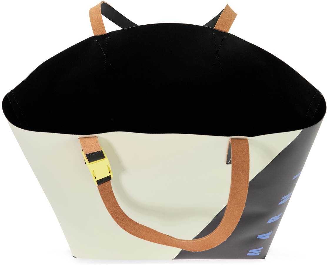 The Marni Tribeca N/S tote bag is made of color block PVC with contrasting logo lettering and leather handles, one of which is decorated with a branded buckle. This stylish bag is perfect for everyday use and adds a touch of sophistication to any outfit. The spacious interior allows you to carry all your essentials while the durable materials ensure long-lasting quality. With its unique design and attention to detail, this tote bag is a must-have accessory for any fashion-forward individual. Elevate your style
