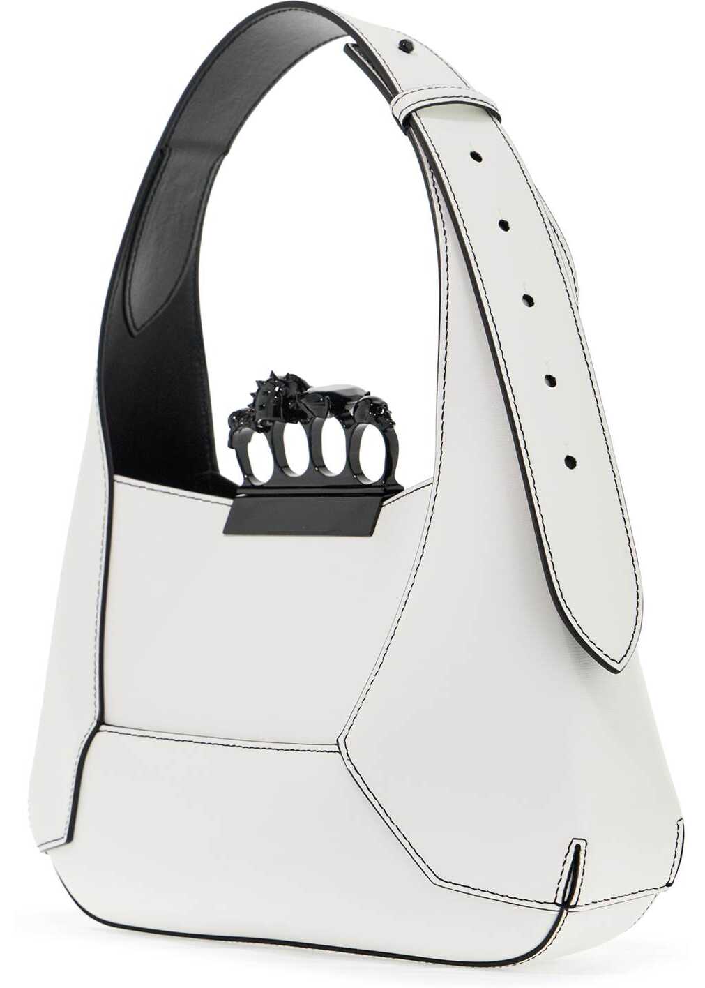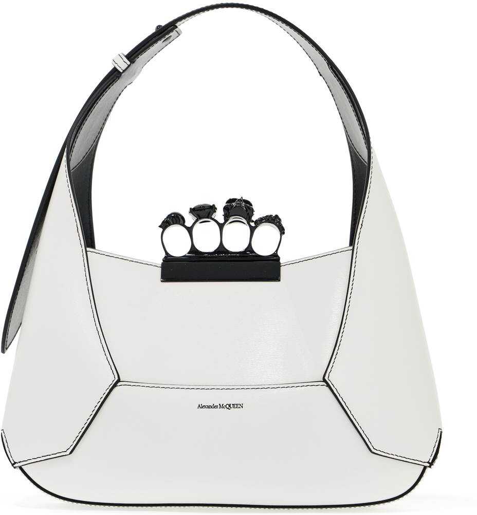 The Alexander McQueen Jewelled Hobo Bag is made of smooth leather and features an original silhouette, inspired by the faceted stones of the Skull Four Ring model. The panels have been cut and assembled together to create a unique design, with contrasting stitching and edges. It also boasts the iconic Knuckle handle. The bag has a magnetic closure, smooth leather interior, and a branded pouch with flap and snap button. All accessories are in black metal.
