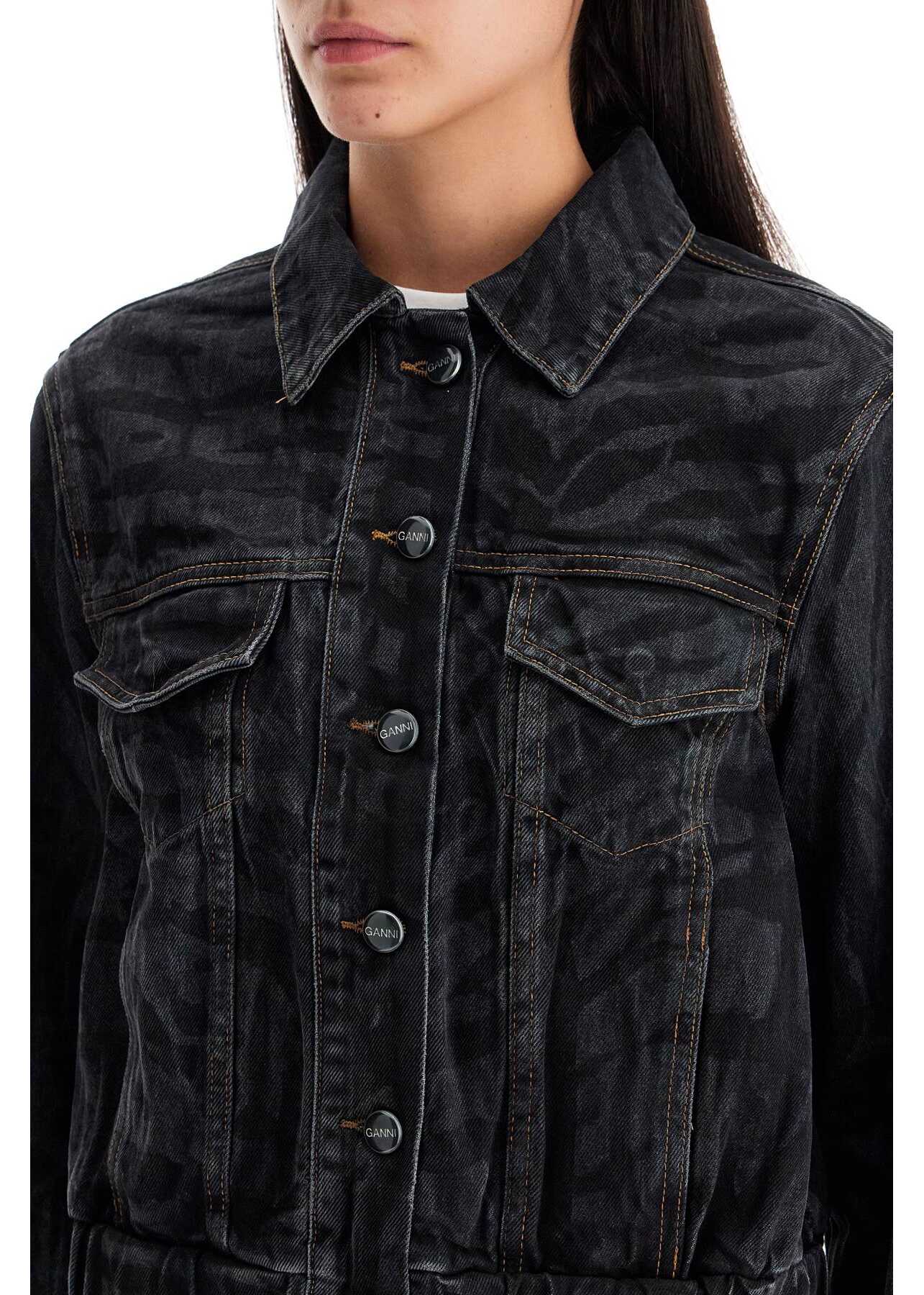 The short cut with elasticized bottom and all-over laser print give a distinctive touch to this denim jacket by Ganni. Made of organic cotton, it features a classic shirt collar, branded buttons, and four pockets. Regular fit. The model is 177 cm tall and wears size EU 34.