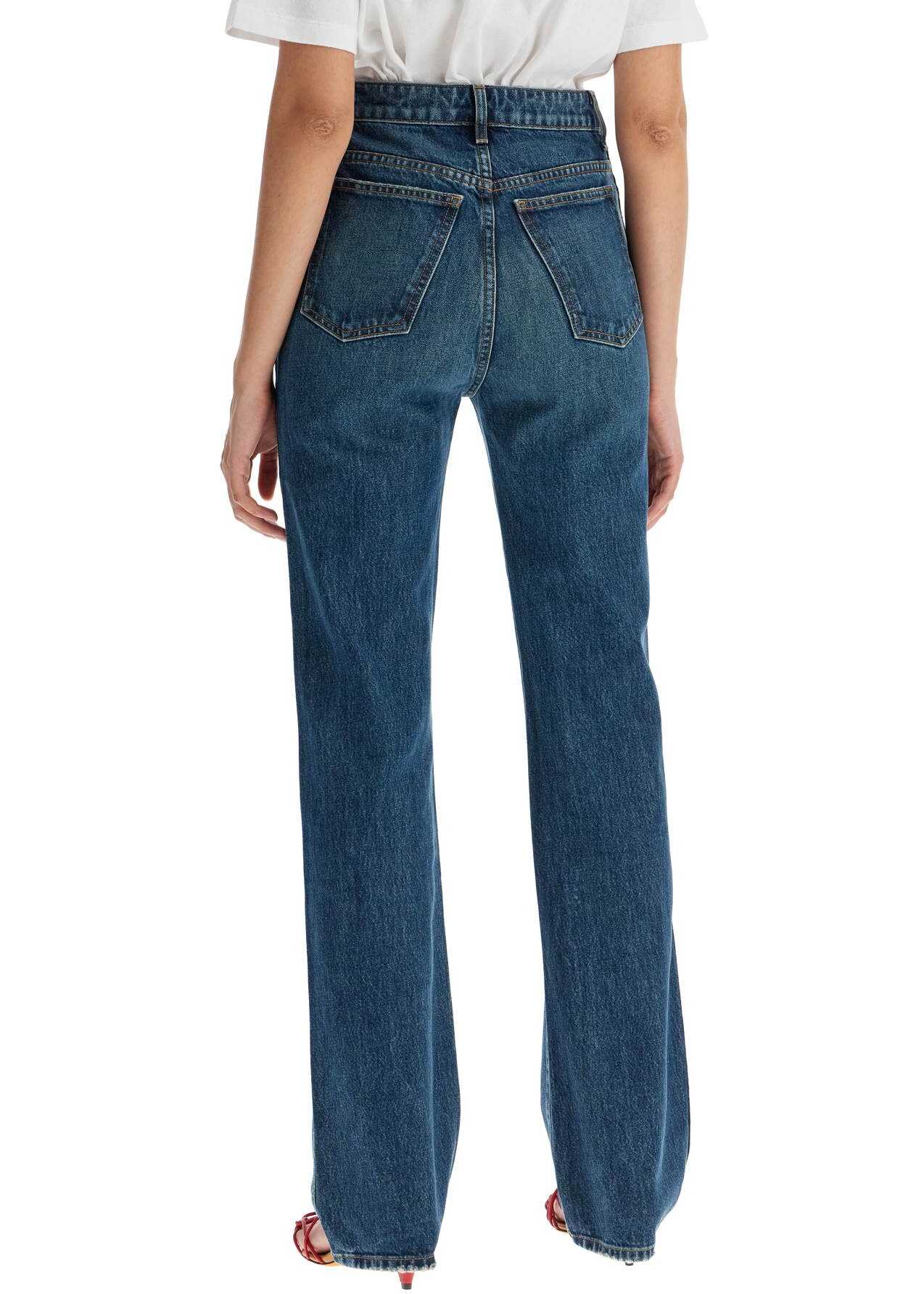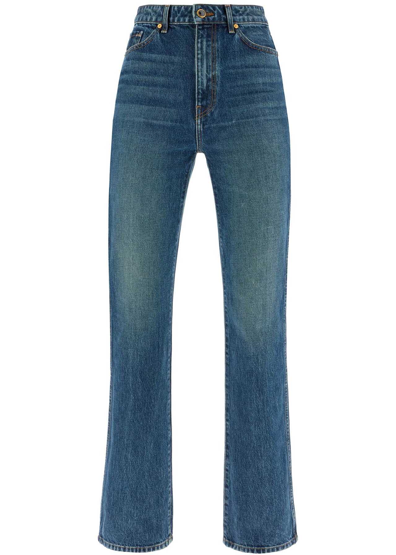 The Khaite Danielle jeans are made of cotton denim with a dark and worn Stinson wash. The five-pocket design, with belt loops and zip and button fly, features a high waist, straight leg, and slim fit. The model is 177 cm tall and wears size 26.