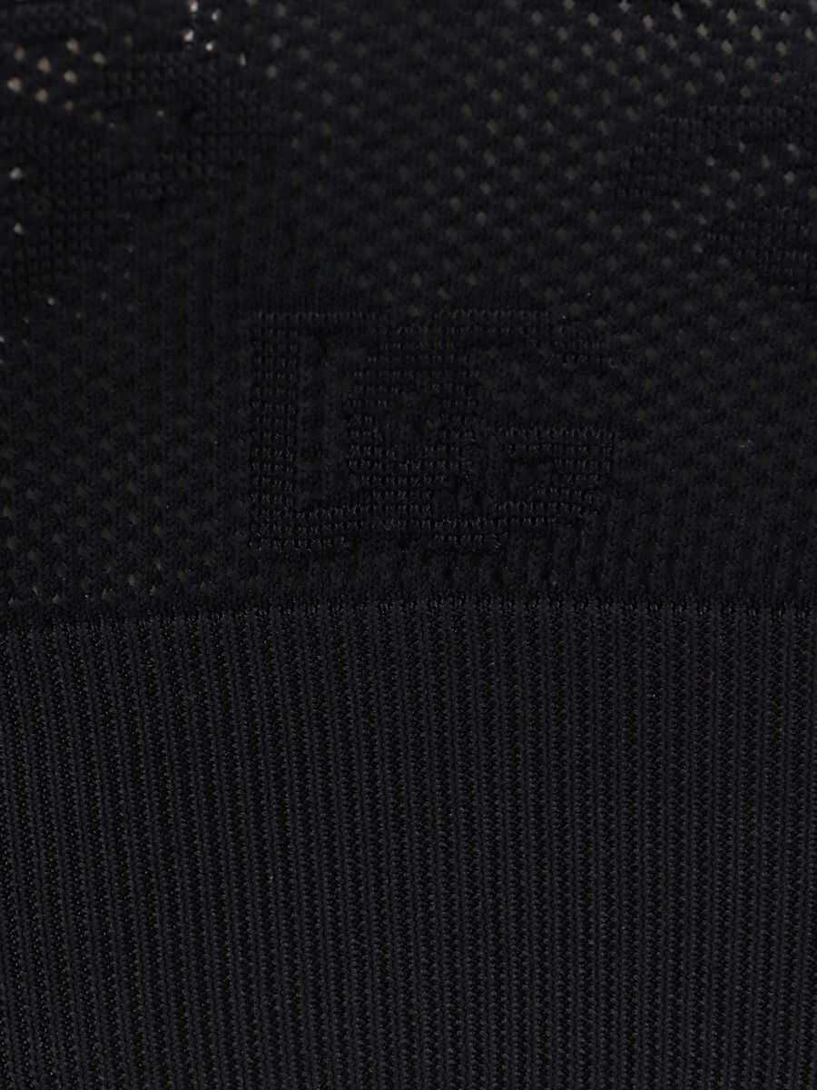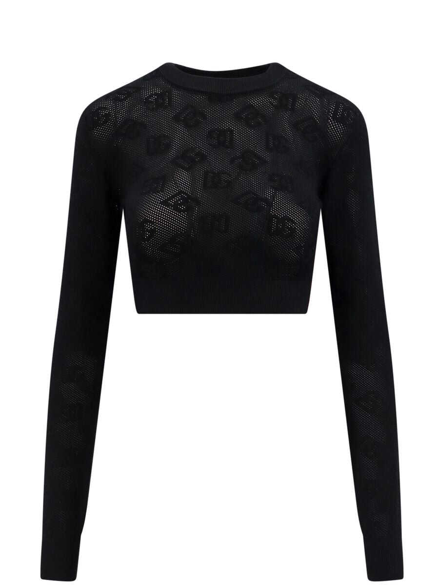 Black viscose blend top from Dolce & Gabbana featuring crew neck, long sleeves, open knit, all-over logo print, ribbed cuffs and hem and straight hem.