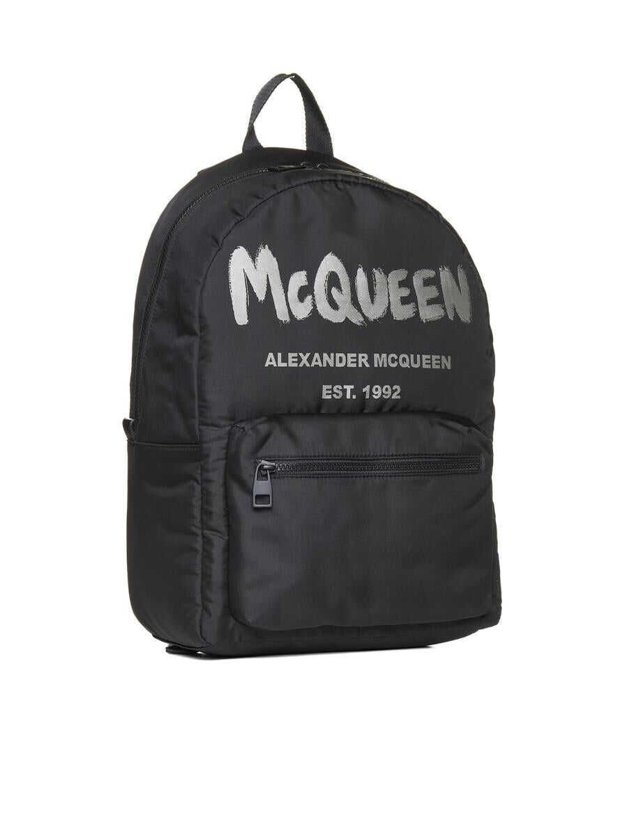 Alexander McQueen’s Metropolitan black nylon backpack featuring a top handle, adjustable rear shoulder straps, black leather details, main compartment and front pocket closed by zip and Graffiti logo printed on the front.