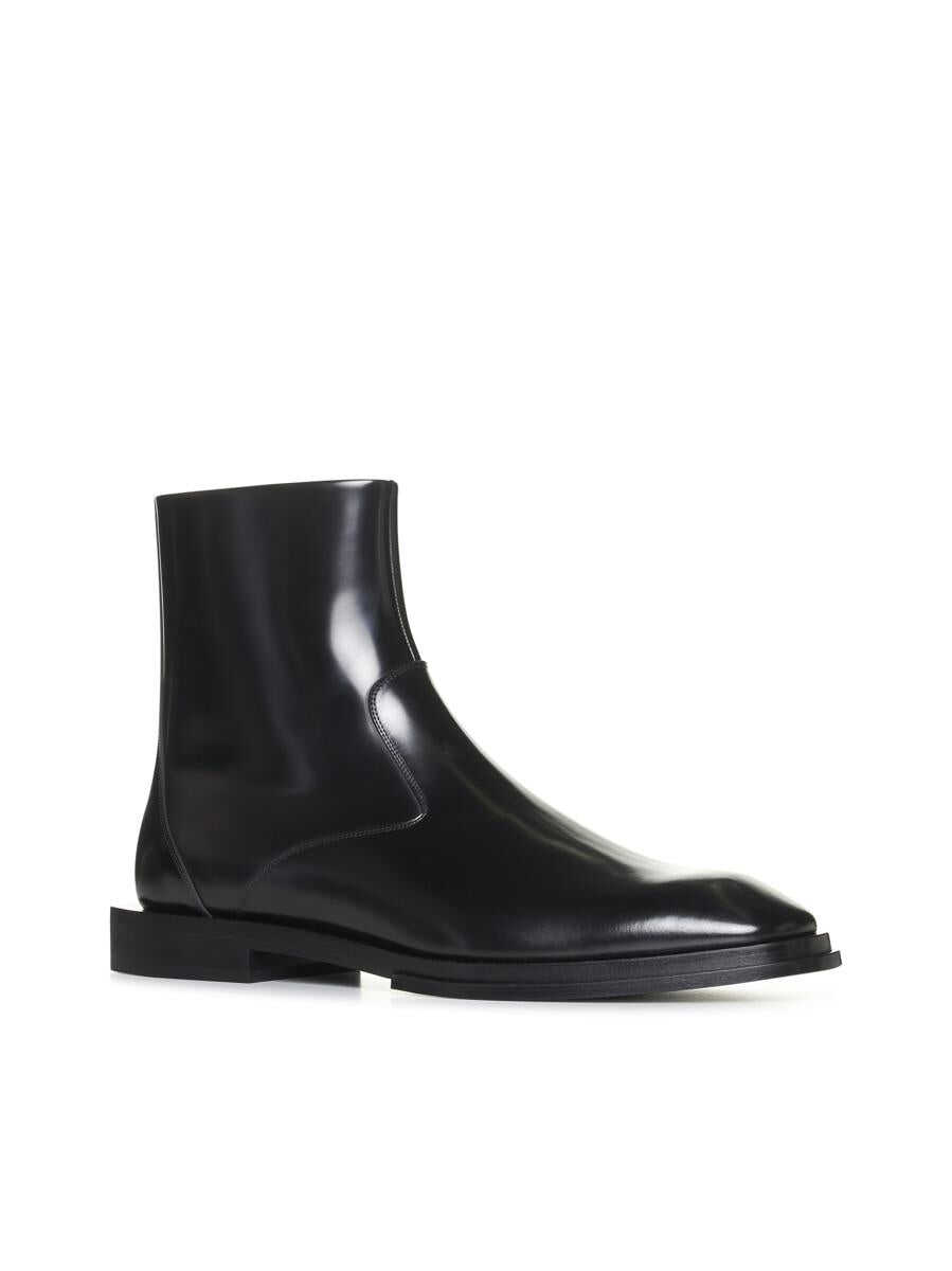 Alexander McQueen’s black brushed leather ankle boots featuring a tapered toe, side zip fastening and leather sole with low square heel and silver-tone metal lettering logo plaque.