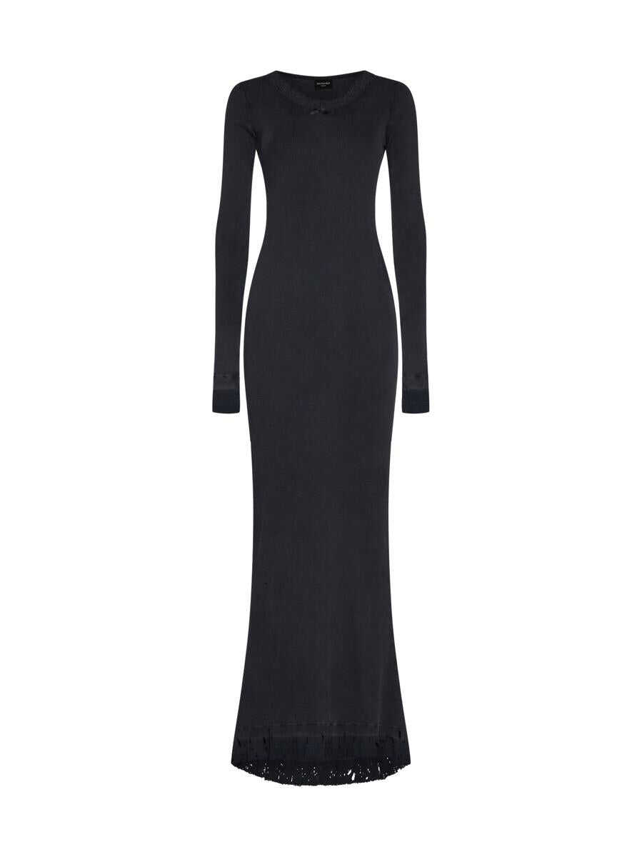 Balenciaga’s long nightgown-style dress in washed black ribbed knit cotton featuring a lace-trimmed wide V-neck with front bow, extra long sleeves, fitted silhouette flared at the hem and all-over distressed effect with holes along the edges.