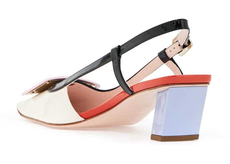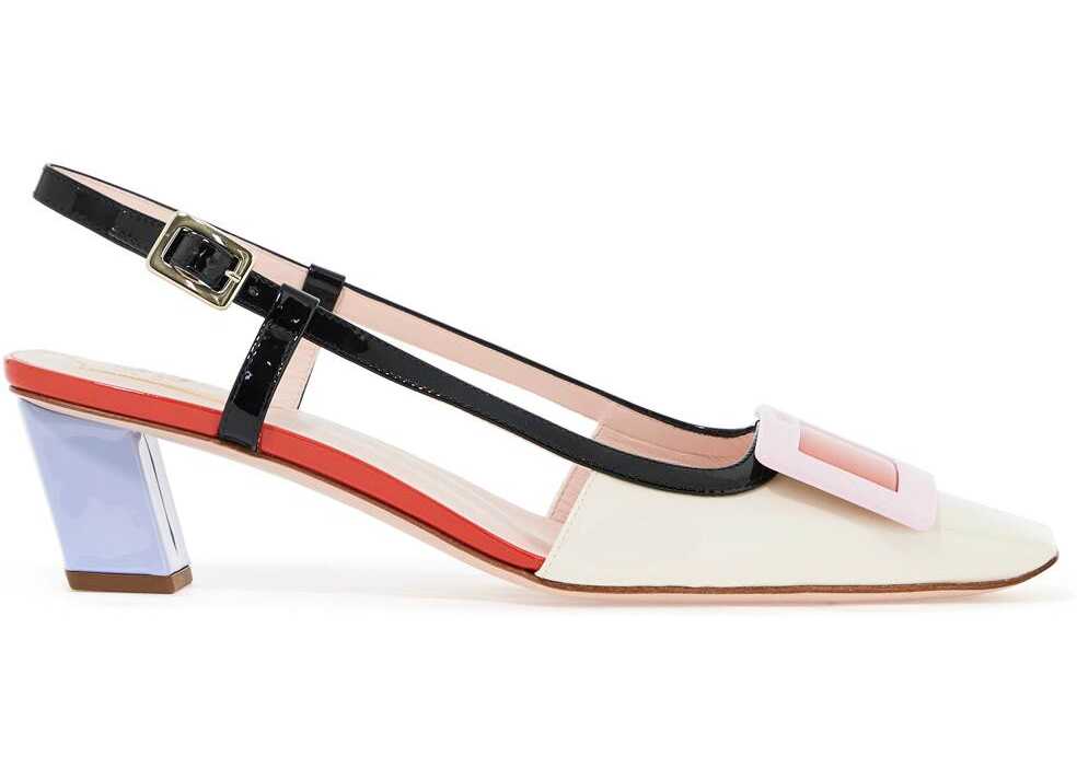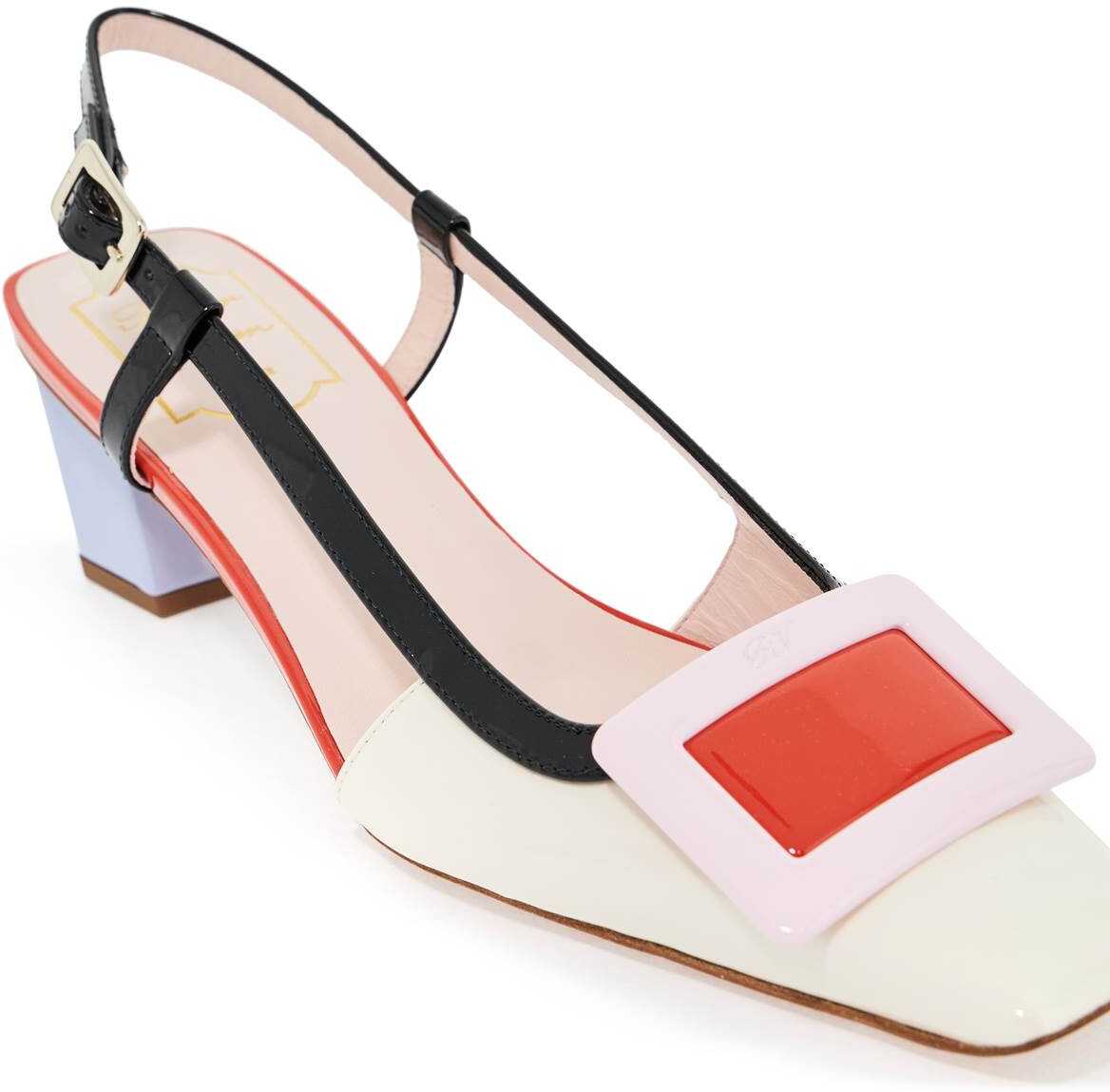 The Belle Vivier slingback pumps by Roger Vivier are made of color block patent leather and feature the iconic buckle and Skyscraper covered heel. The design has a square toe with an adjustable strap, leather lining and insole, and a leather sole.