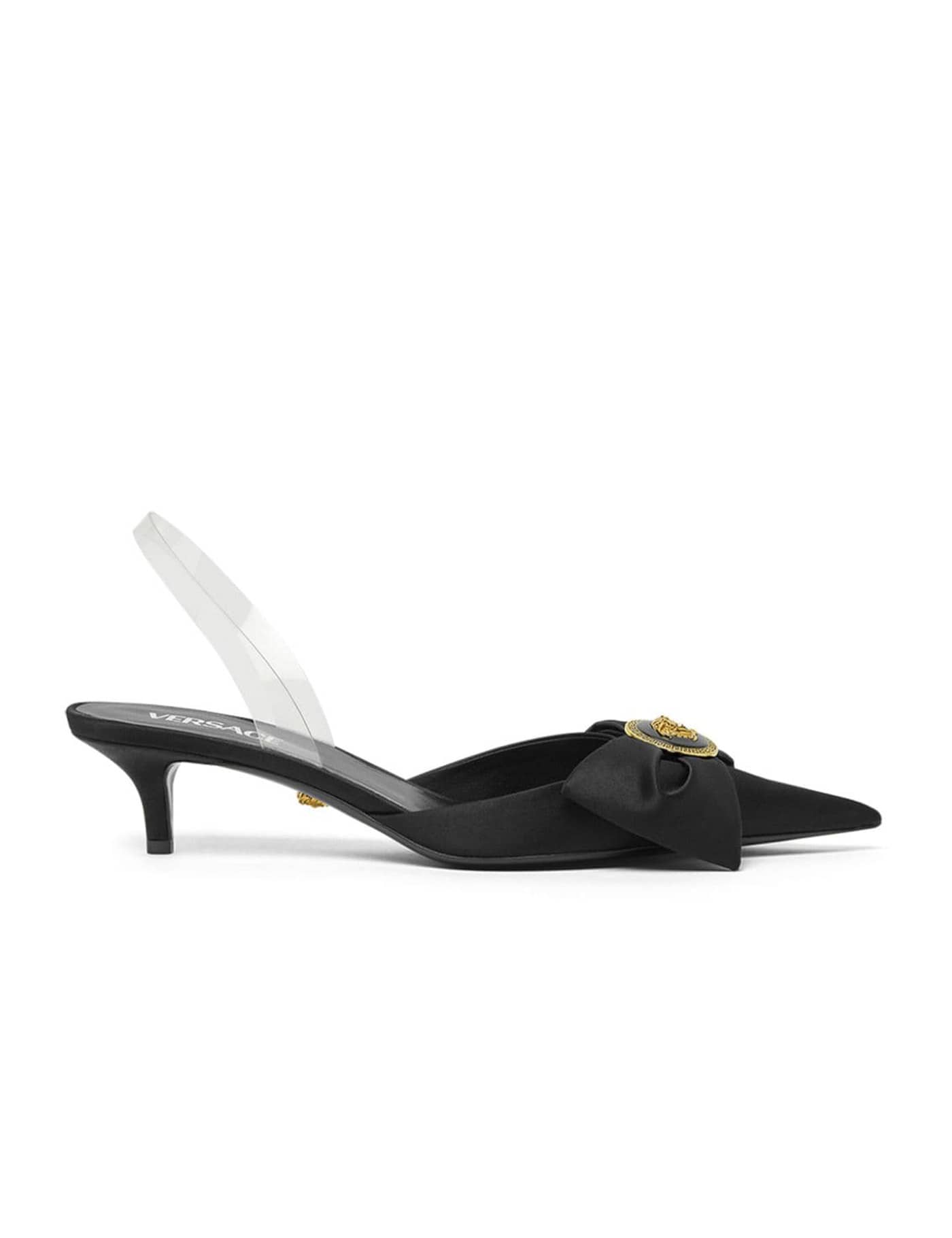 The Alia slingback dé colleté s by Versace are made of satin and feature a glossy Medusa detail on soft maxi bows. They have an ankle strap in PVC, a leather insole, a kitten heel, and a leather sole.