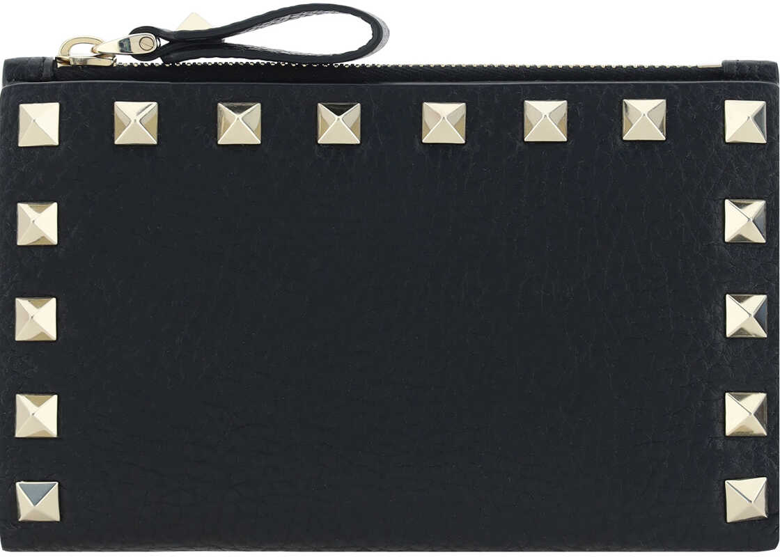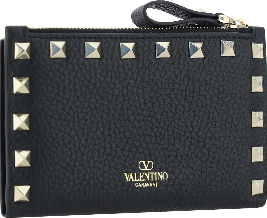 Calfskin Rockstud Wallet by Valentino Garavani, billfold model, grained leather design, beading embellished with iconic brand studs applied on front and back, snap-button closure, iconic brand monogram printed in pressure and contrast on back, billfold compartment, dual internal card slots, coin compartment with zipper for closure.