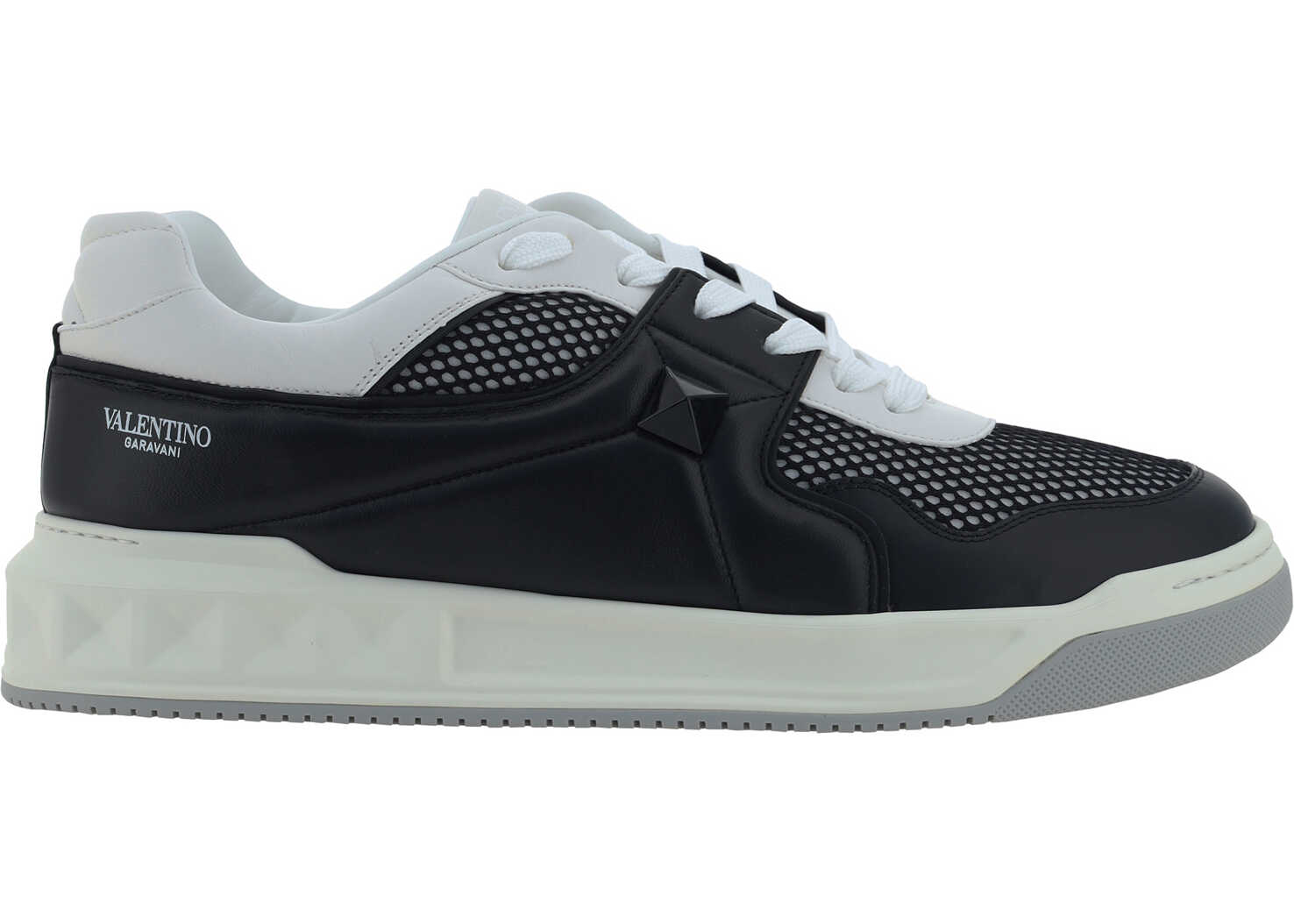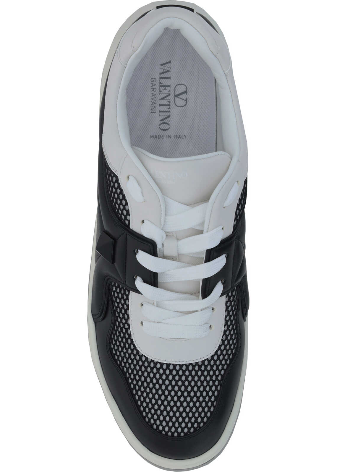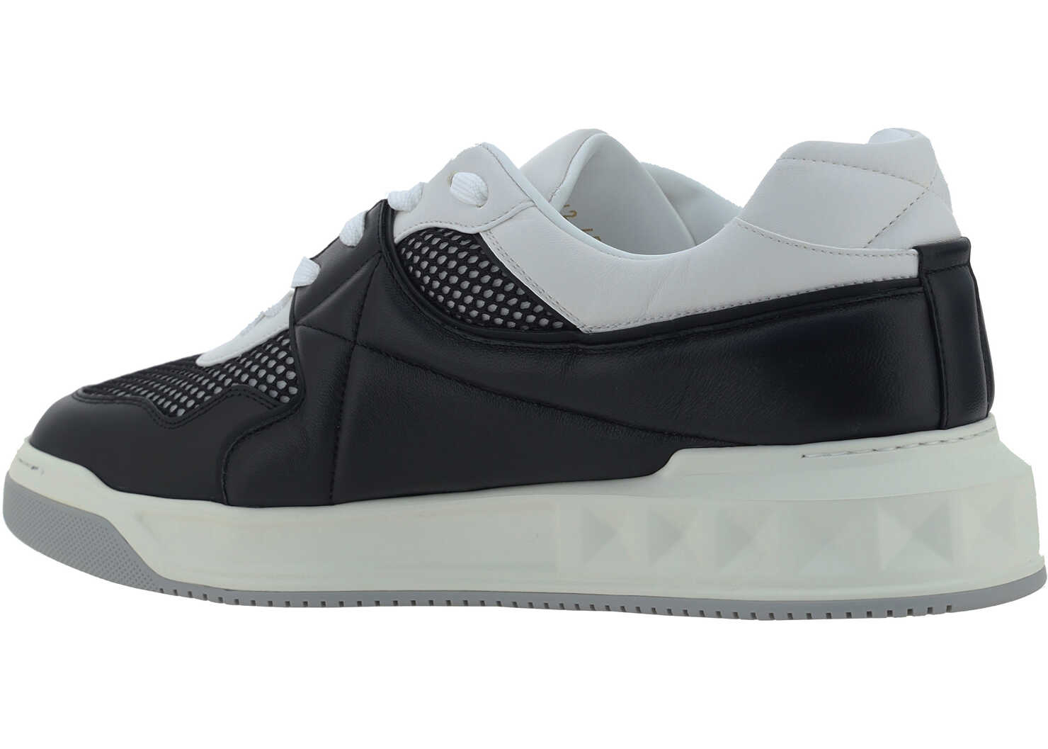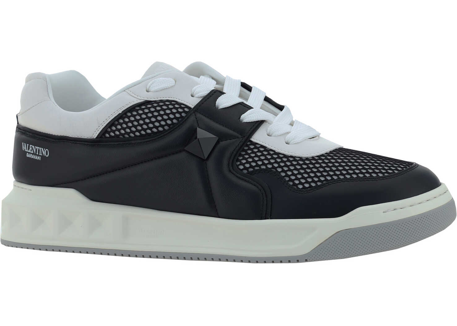 Calfskin One Stud Sneakers by Valentino Garavani, front lace-up closure, flat sole embellished on the heel with the brand's signature conicals and studs, round toe cap with contrast stitching and topstitching, embroidered logo label on front tab.
