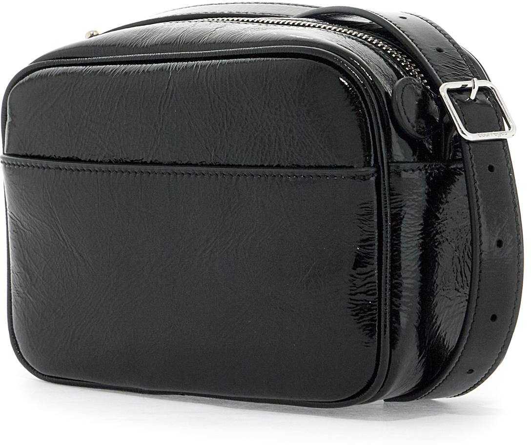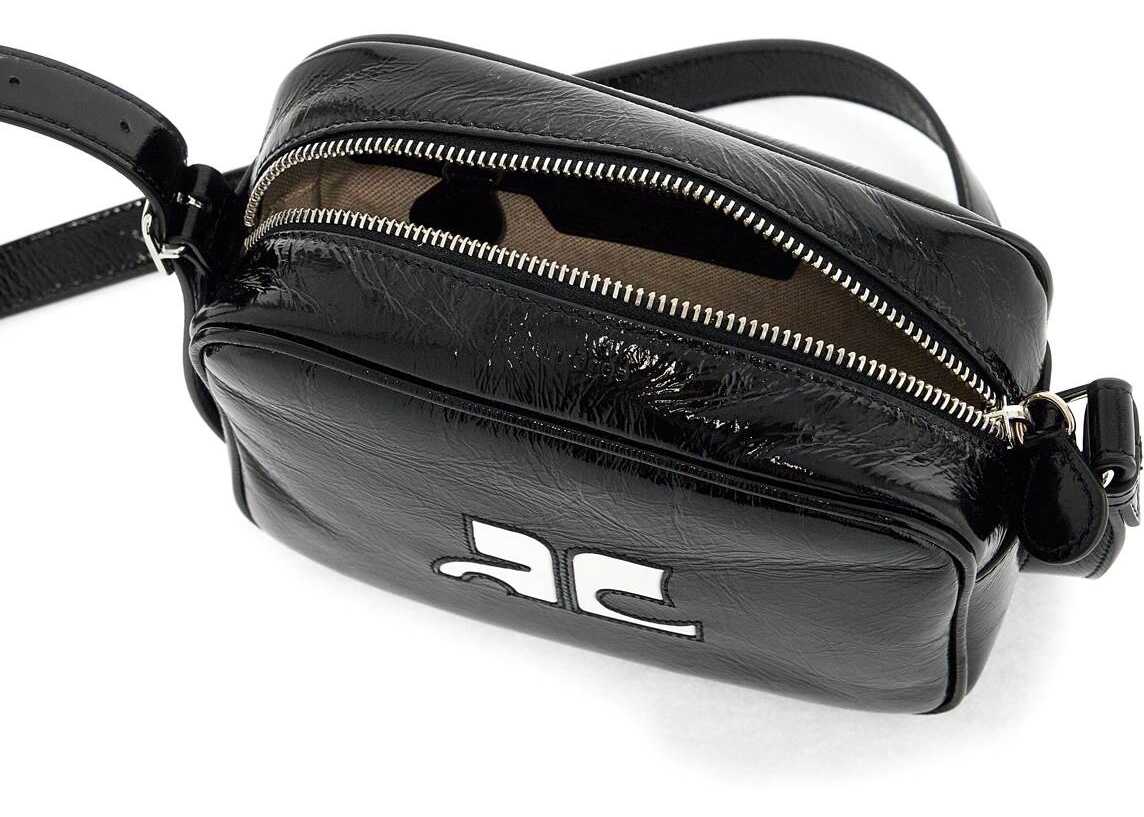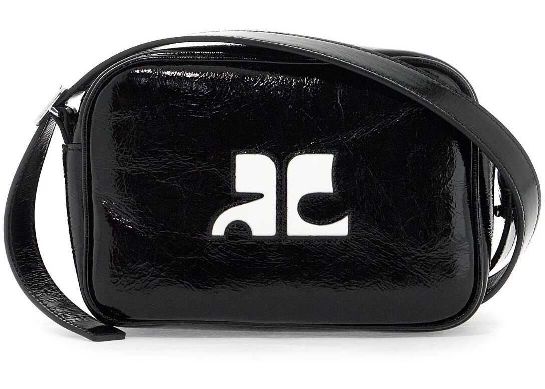 The Reedition camera bag by Courrèges is made of patent leather with a contrasting monogram inlay. It features a zip closure, fabric interior with a zip pocket and an additional flat pocket on the back. The removable and adjustable handle, as well as the extra crossbody strap, allow for versatile styling options. The metal accessories have a silver finish.