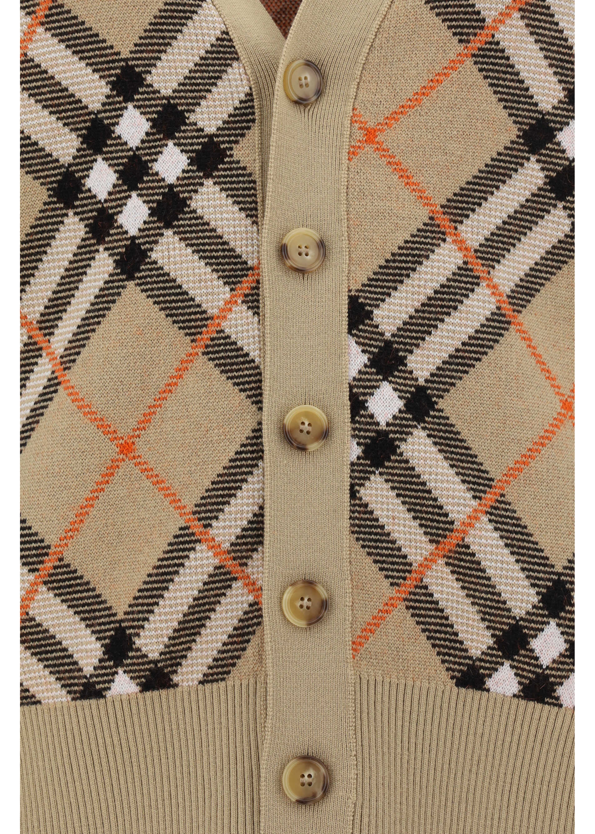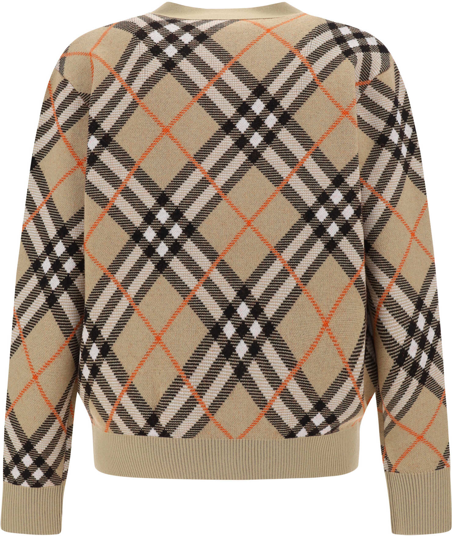 Wool Cardigan by Burberry featuring a V-neck with contrasting buttons for closure, ribbed hem, ribbed cuffs, iconic all-over applied Check pattern, regular fit.