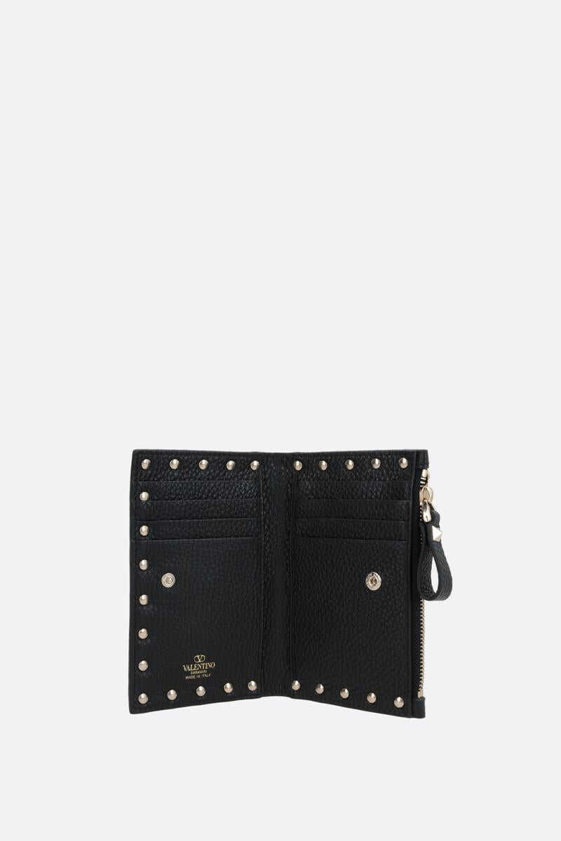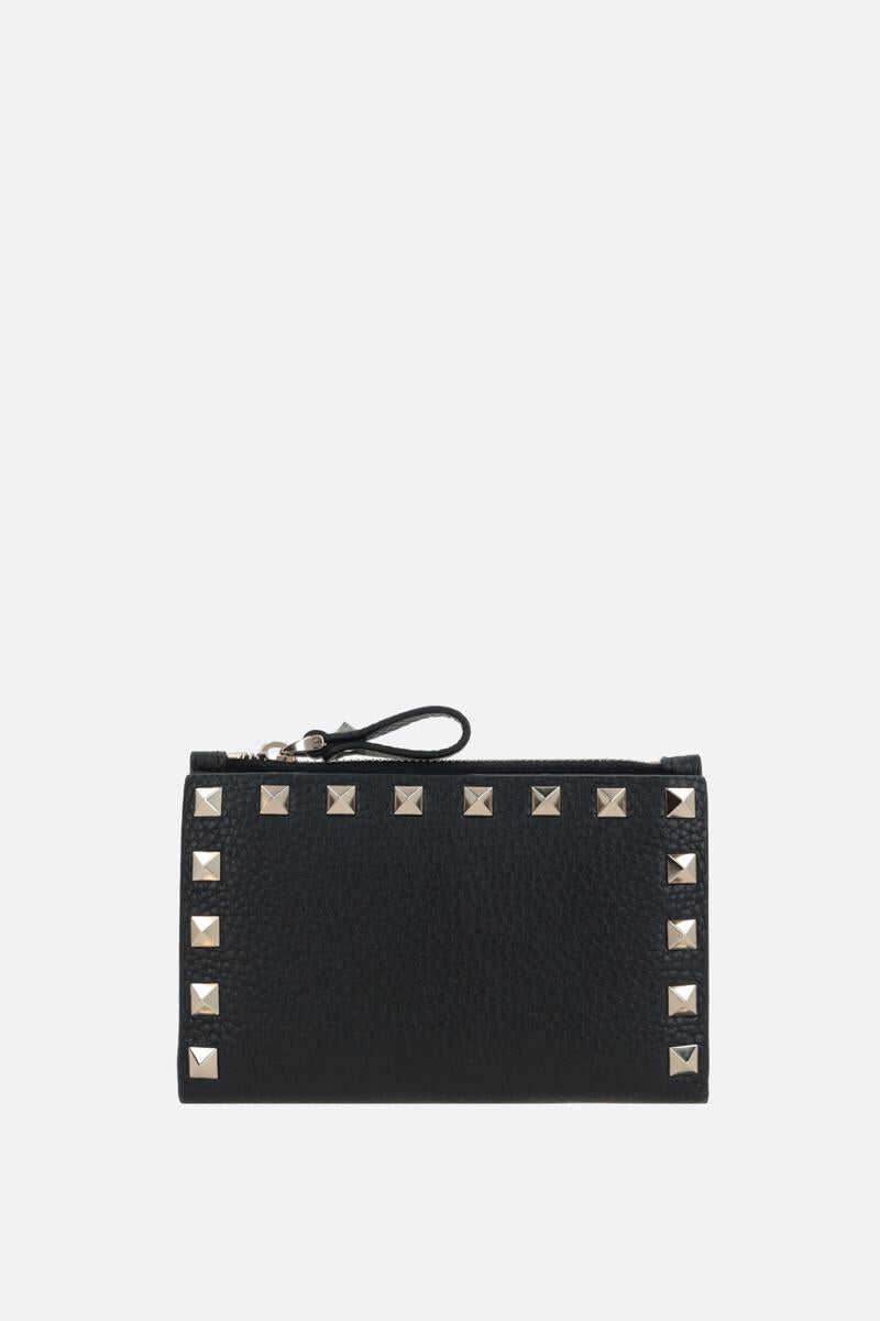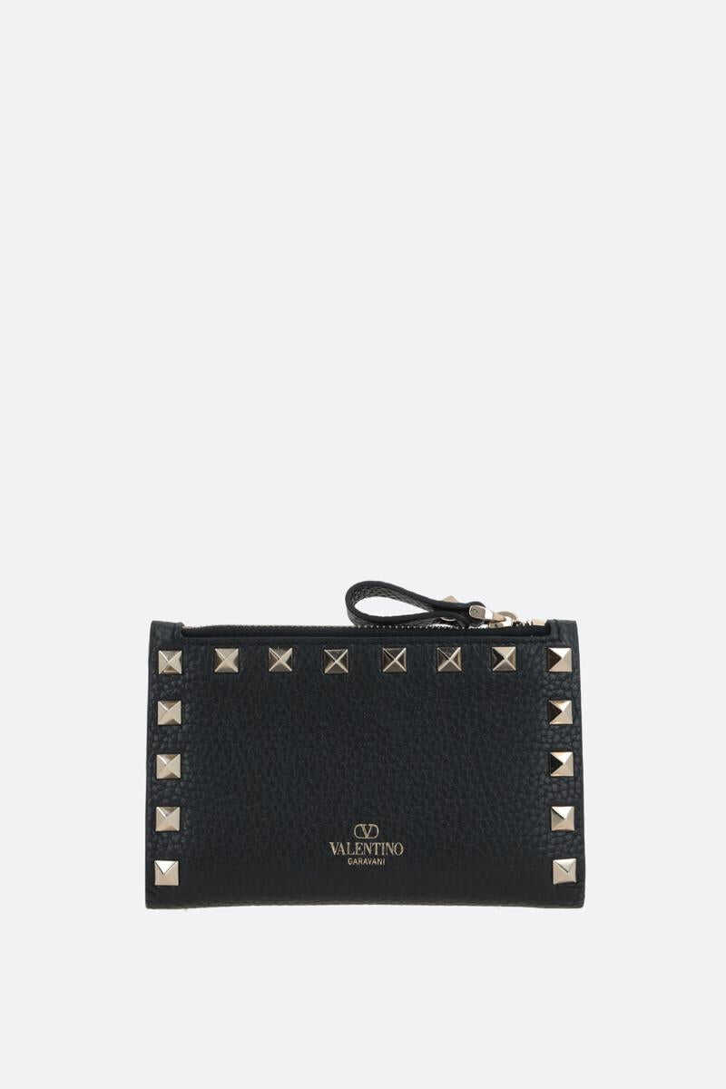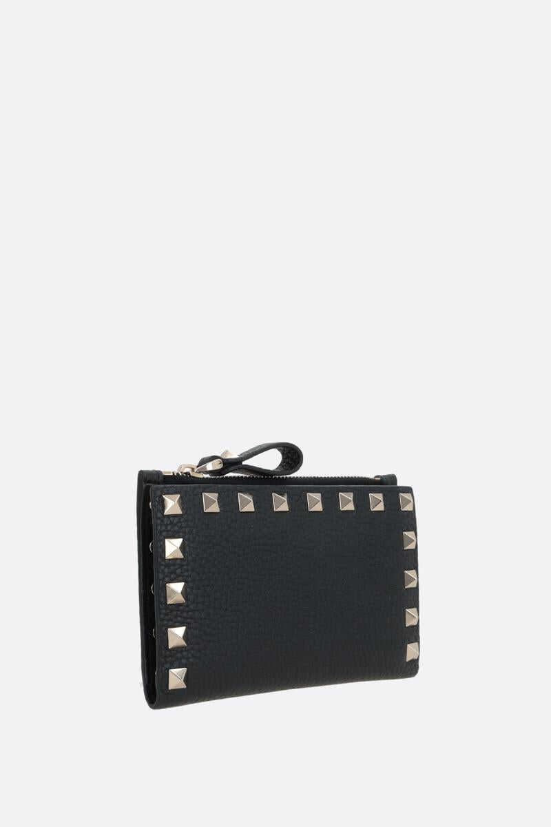 Valentino Garavani's credit card holder crafted in black grained leather adorned with platinum-tone metal studs. It features internal snap-button closure and external zip coin pocket. Leather / fabric-lined interior with two slip pockets and eight card slots. The design is completed by the unmistakable logo embossed at back.