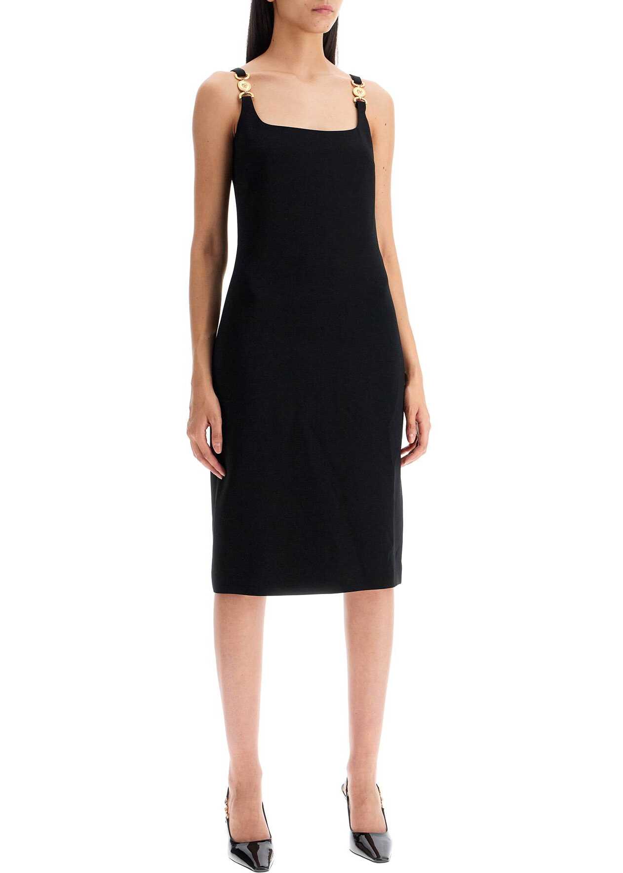This Versace sheath dress in stretch cady features a square neckline with "Medusa '95" elements in gold metal on the straps. It is an elegant and essential design with a knee-length hemline and back slit. The dress has an invisible zip closure and is fully lined. The model is 177 cm tall and wears size IT 40.