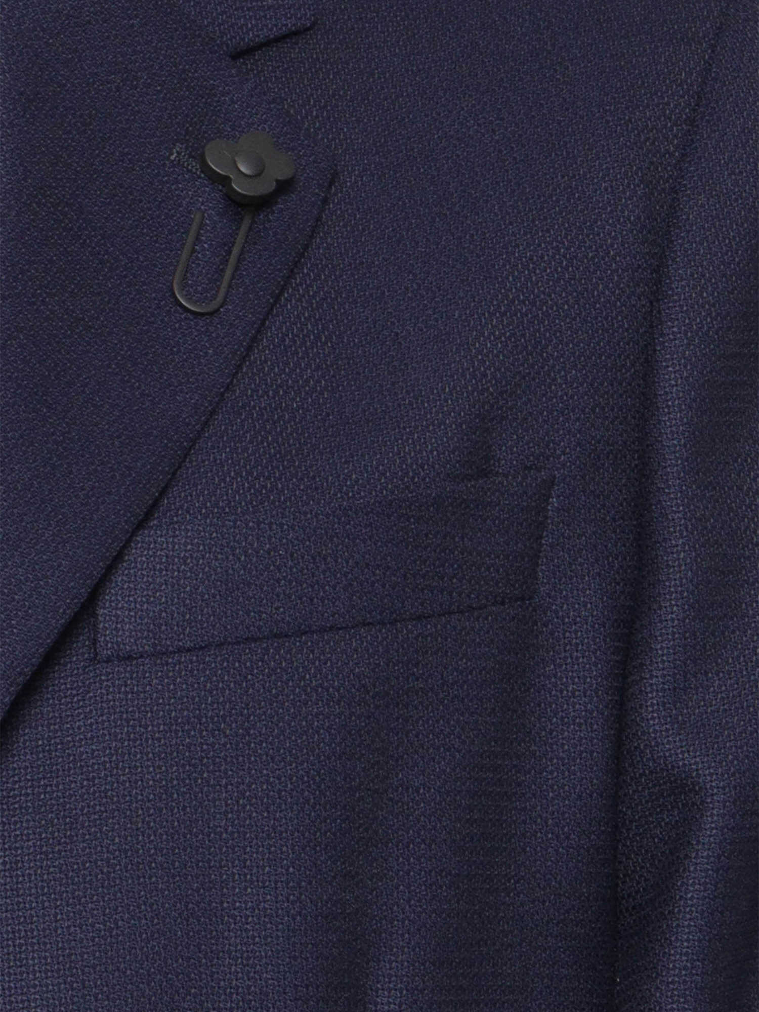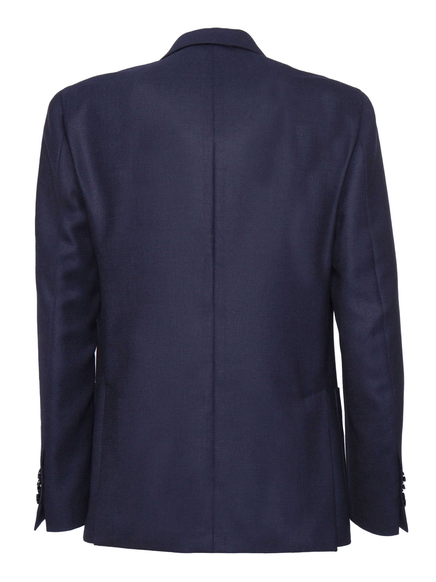 Blue blazer in cool wool with front buttons, large pockets on the front, lapel collar.