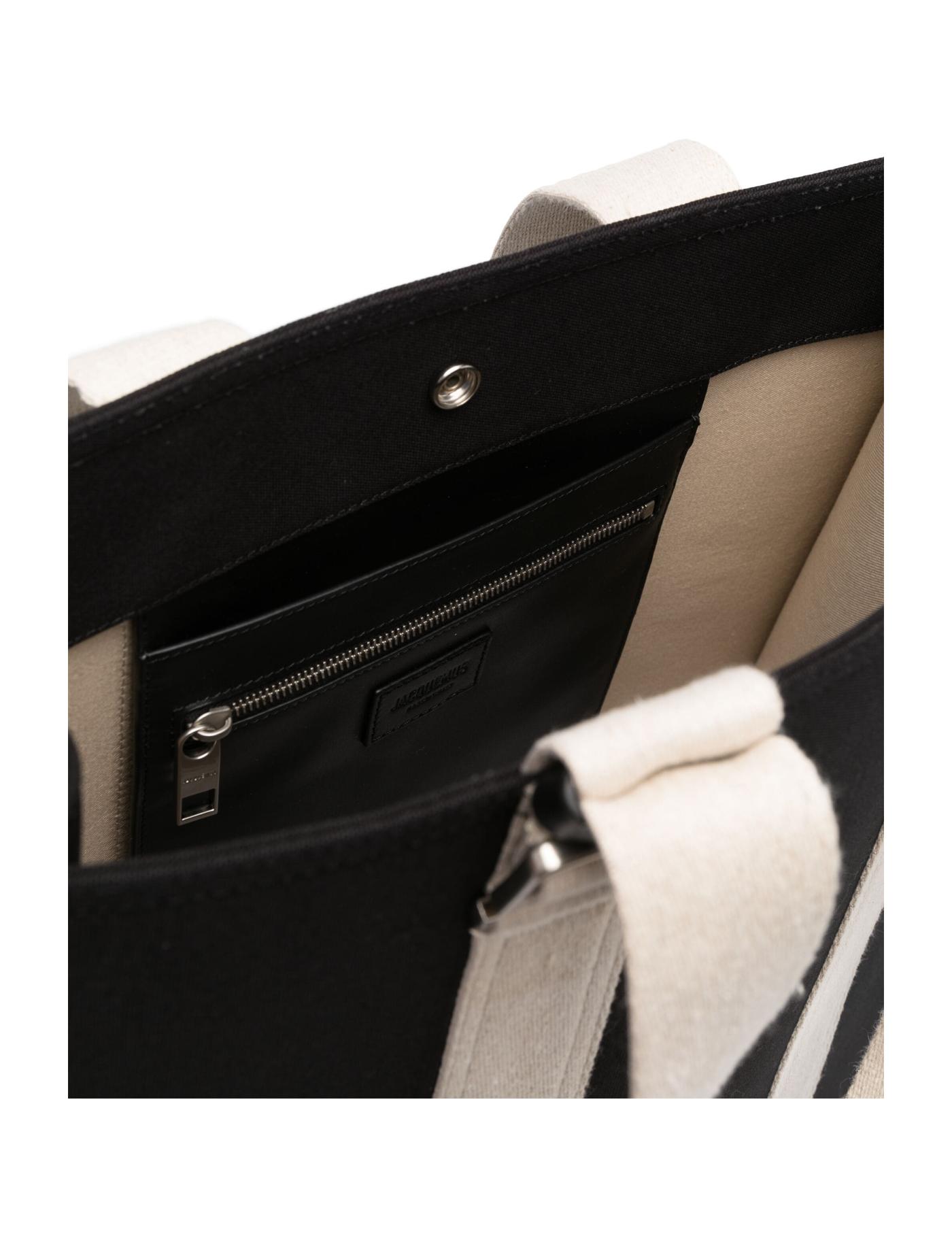 Presented in large size, Jacquemus' Le Cabas Cuerda tote bag features a structured silhouette in black canvas. Enhanced by a spacious main compartment, it is adorned with contrasting shoulder straps and subtle logo lettering, adding an iconic branding element.
