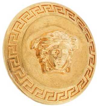 Versace stud earrings in brass with Gold Tribute finish, featuring the iconic Greek Key engraved around the circumference and a raised Medusa head. Back closure with butterfly clasp. For pierced ears. Lead and nickel free.