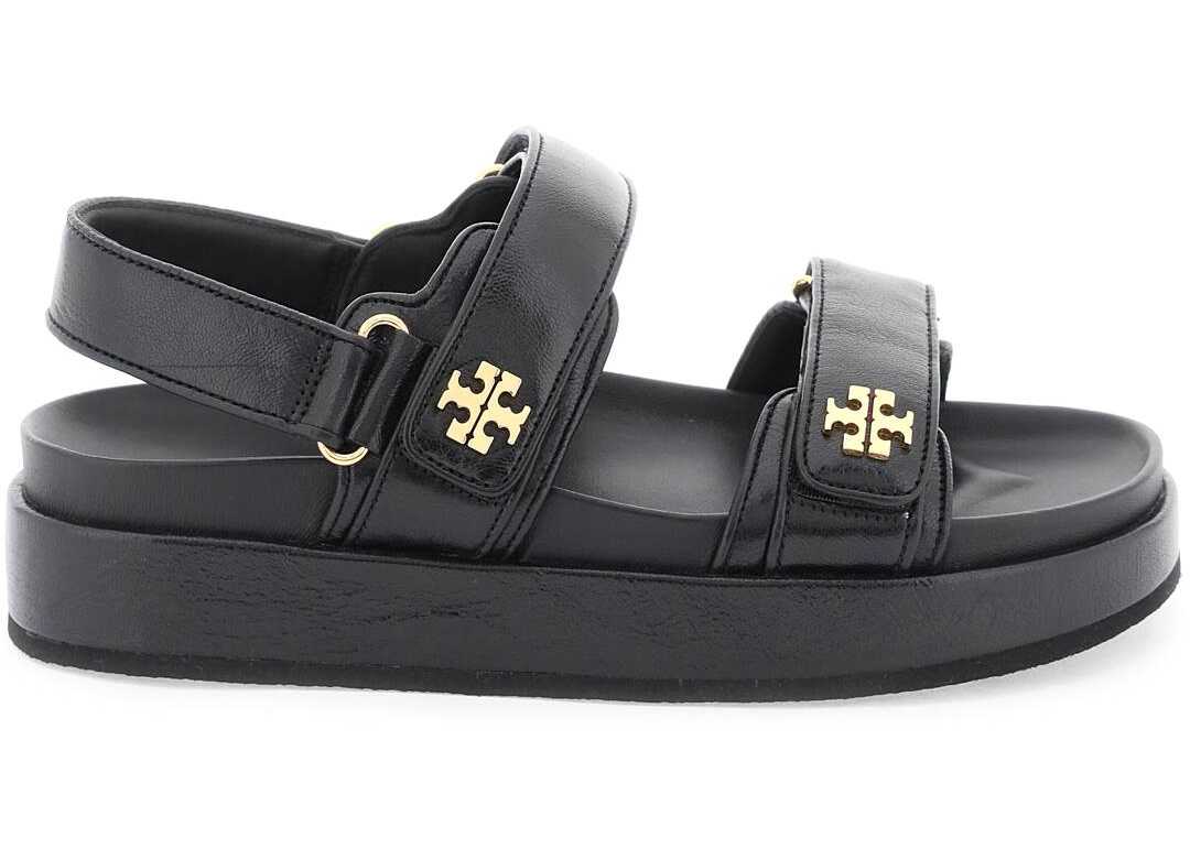 Tory Burch Kira sport sandals made of soft leather with adjustable Velcro straps embellished with iconic double-T monogram. Leather insole featuring gold-tone lettering logo print, rubber sole.