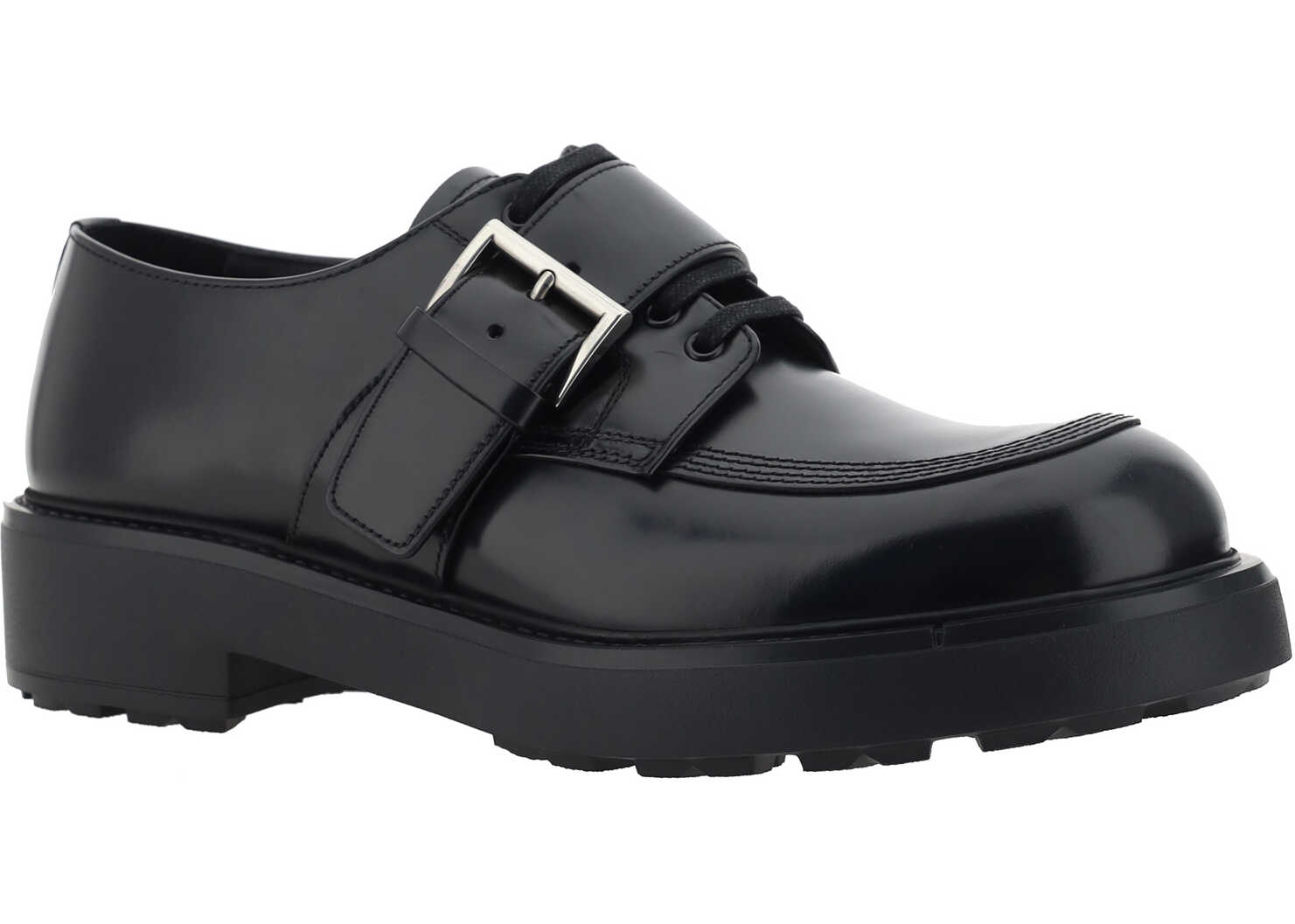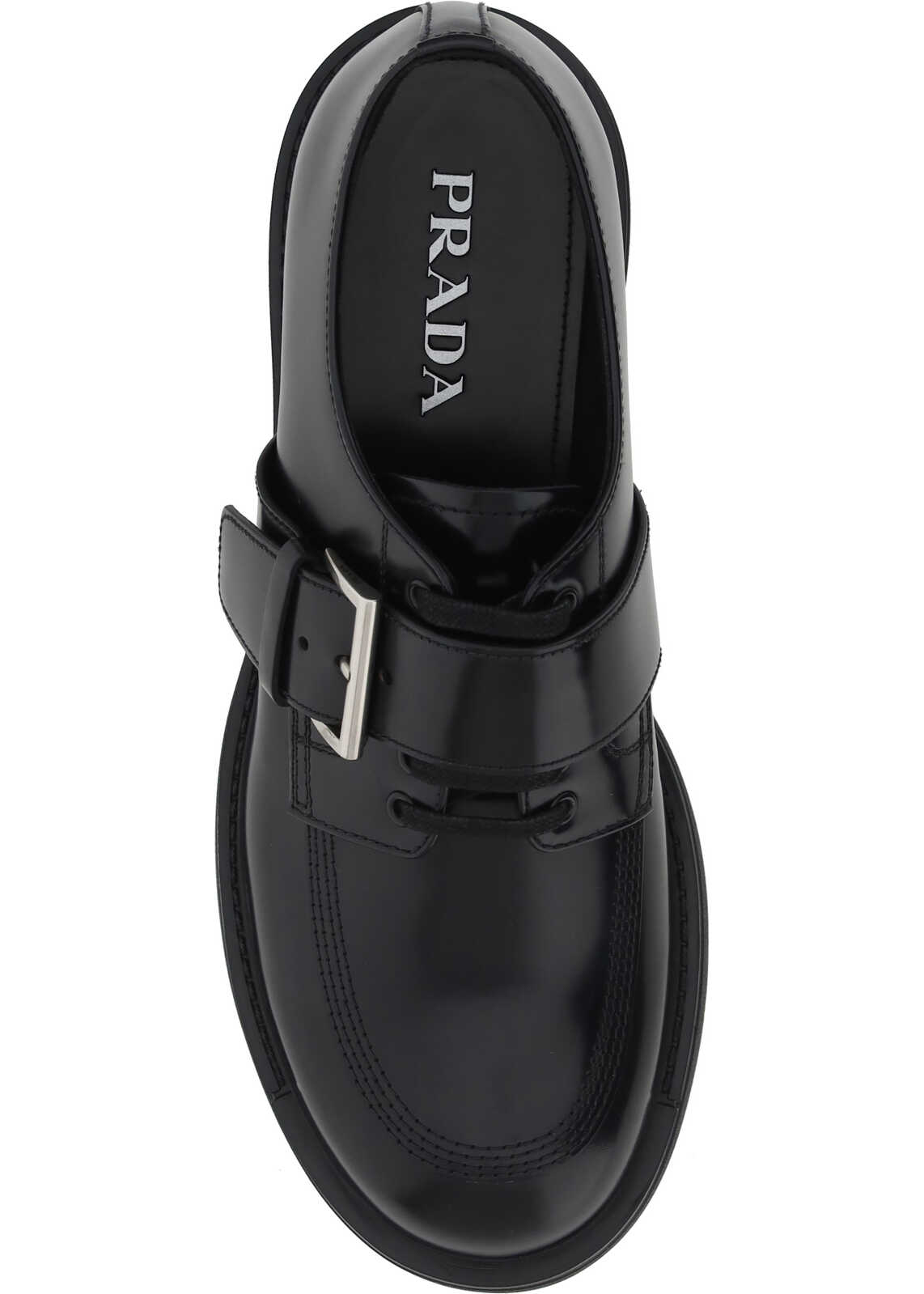 Calfskin Loafers by Prada, round toe, block heel and non-slip sole, leather front tray with adjustable metal buckle, press-stamped logo insole, patent leather design.
