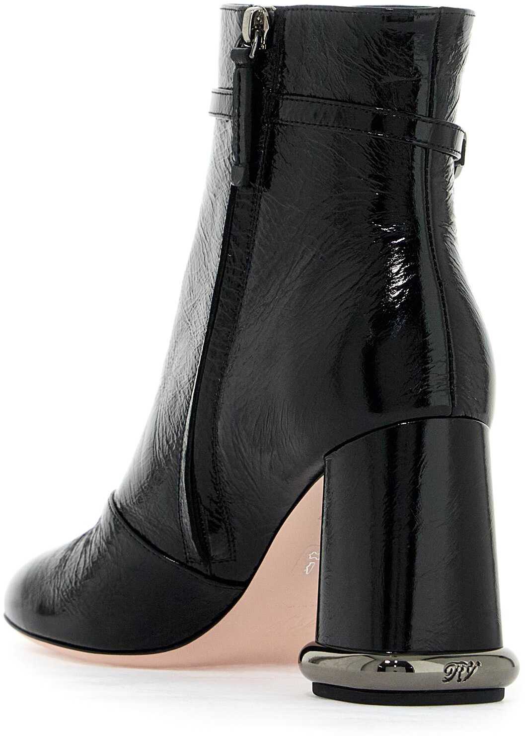 The Roundytoe ankle boots by Roger Vivier are made of crinkled patent leather and adorned with a Viv' Choc buckle in ruthenium-finished metal on the trapezoid heel. They feature an adjustable ankle strap, round toe, side zip closure, leather lining, and leather sole.