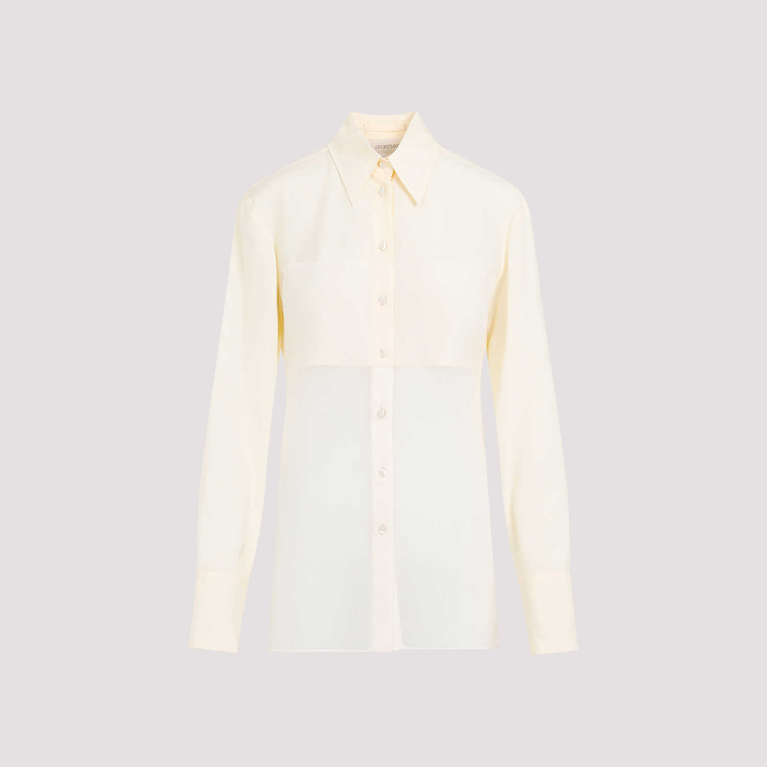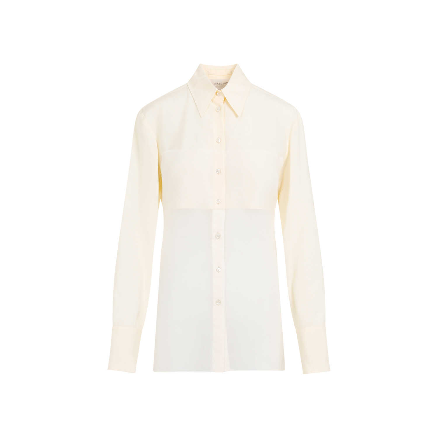 Sportmax Vanilla White Viscose Boa Shirt. Vanilla viscose, sheer panel on bottom, classic collar, long sleeves, front button fastening, buttoned cuffs, straight hem.