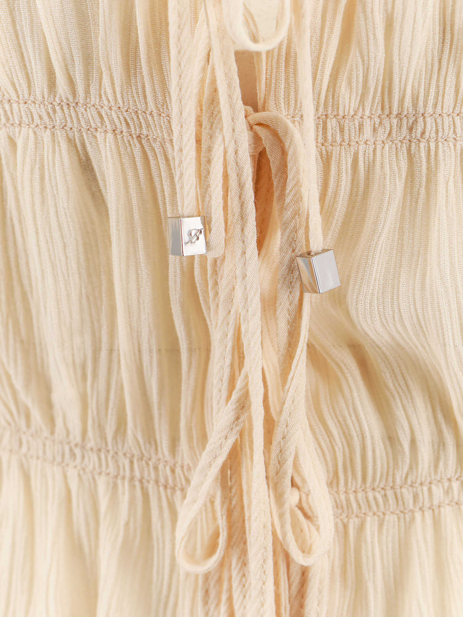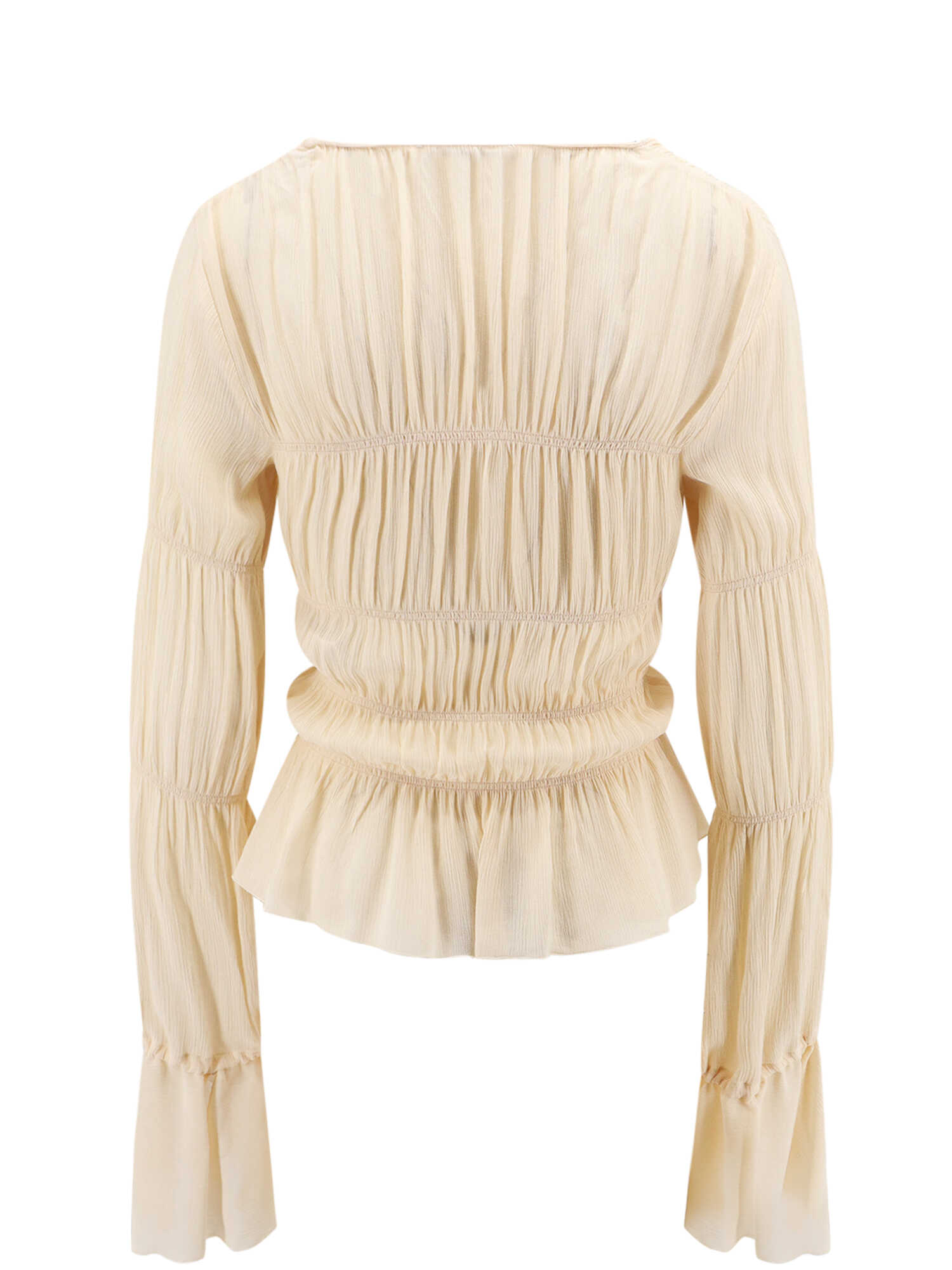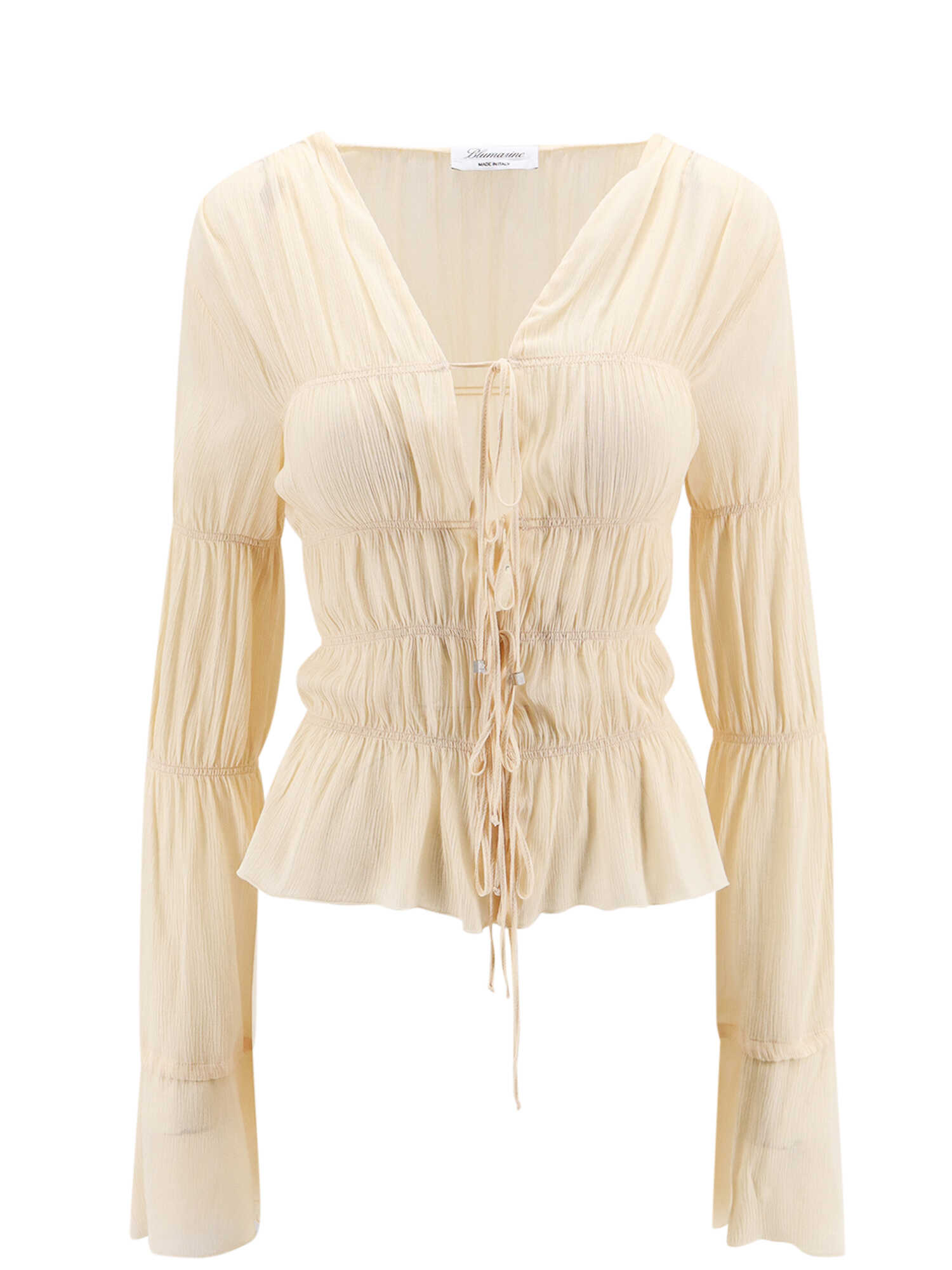 Closure with silk laces, V-neckline, Long sleeve with maxi cuff and lace, made in Italy, 100% silk