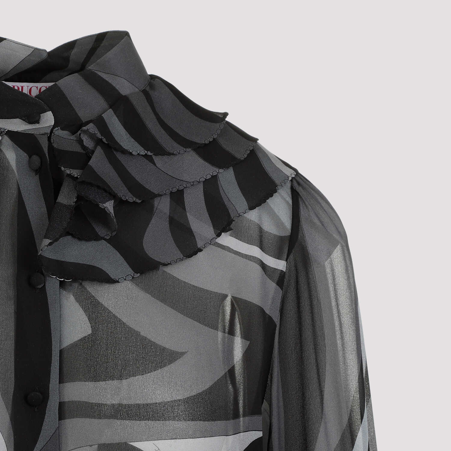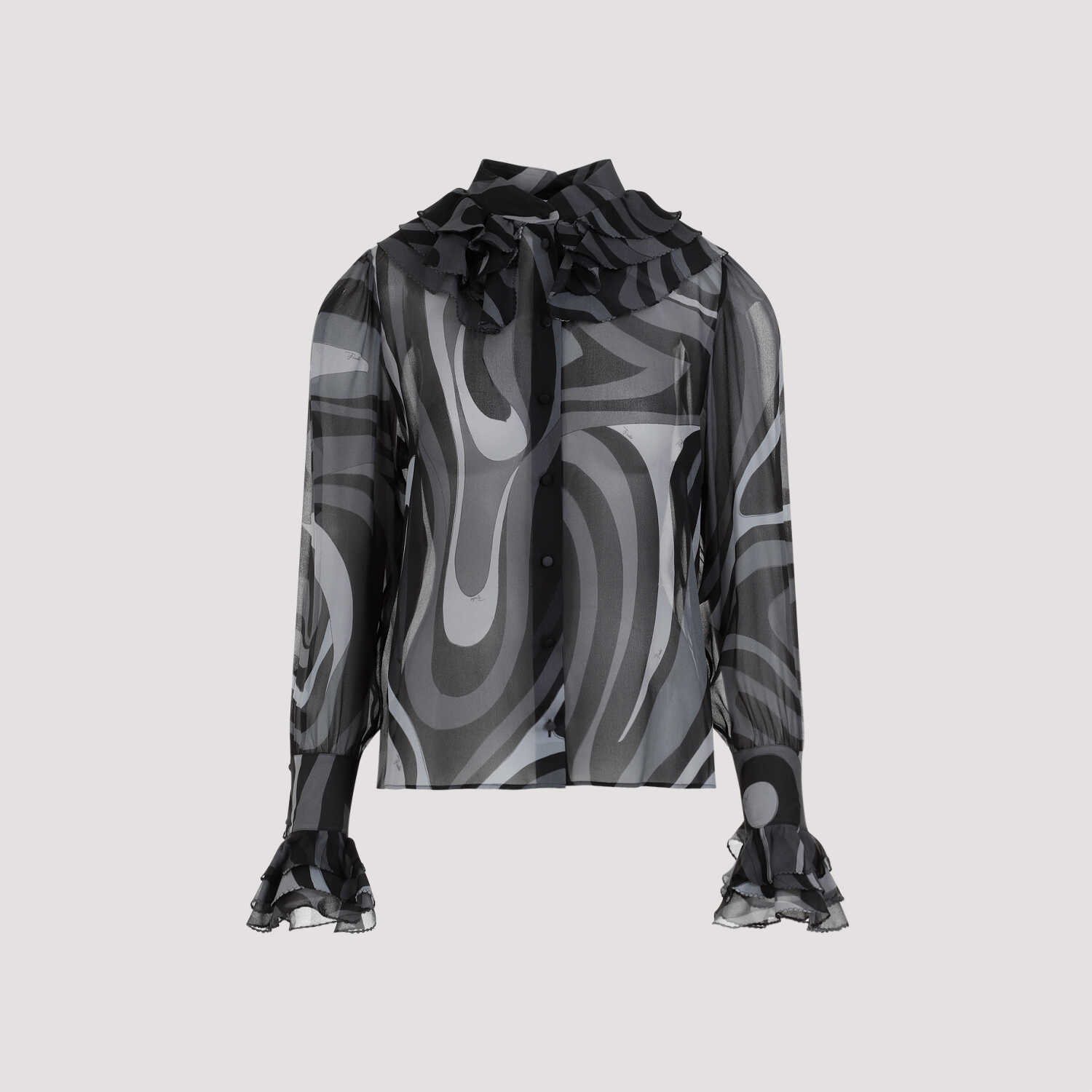 Pucci LS Grey Black Silk Shirt. Pure black and grey silk, waved pattern all over, closure on front with covered tonal buttons, Korean collar, ruffles embellishment on the neck and on the cuffs, straight hem.