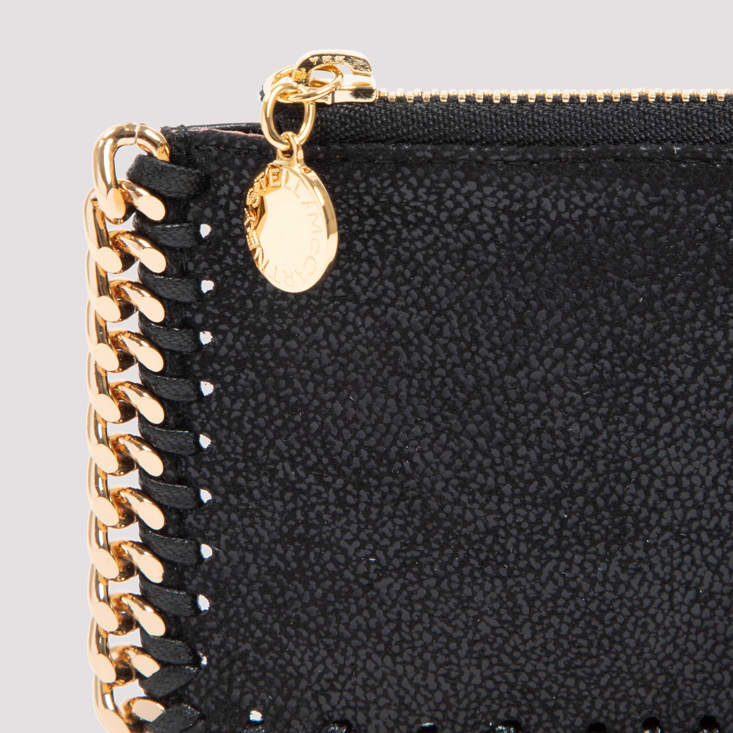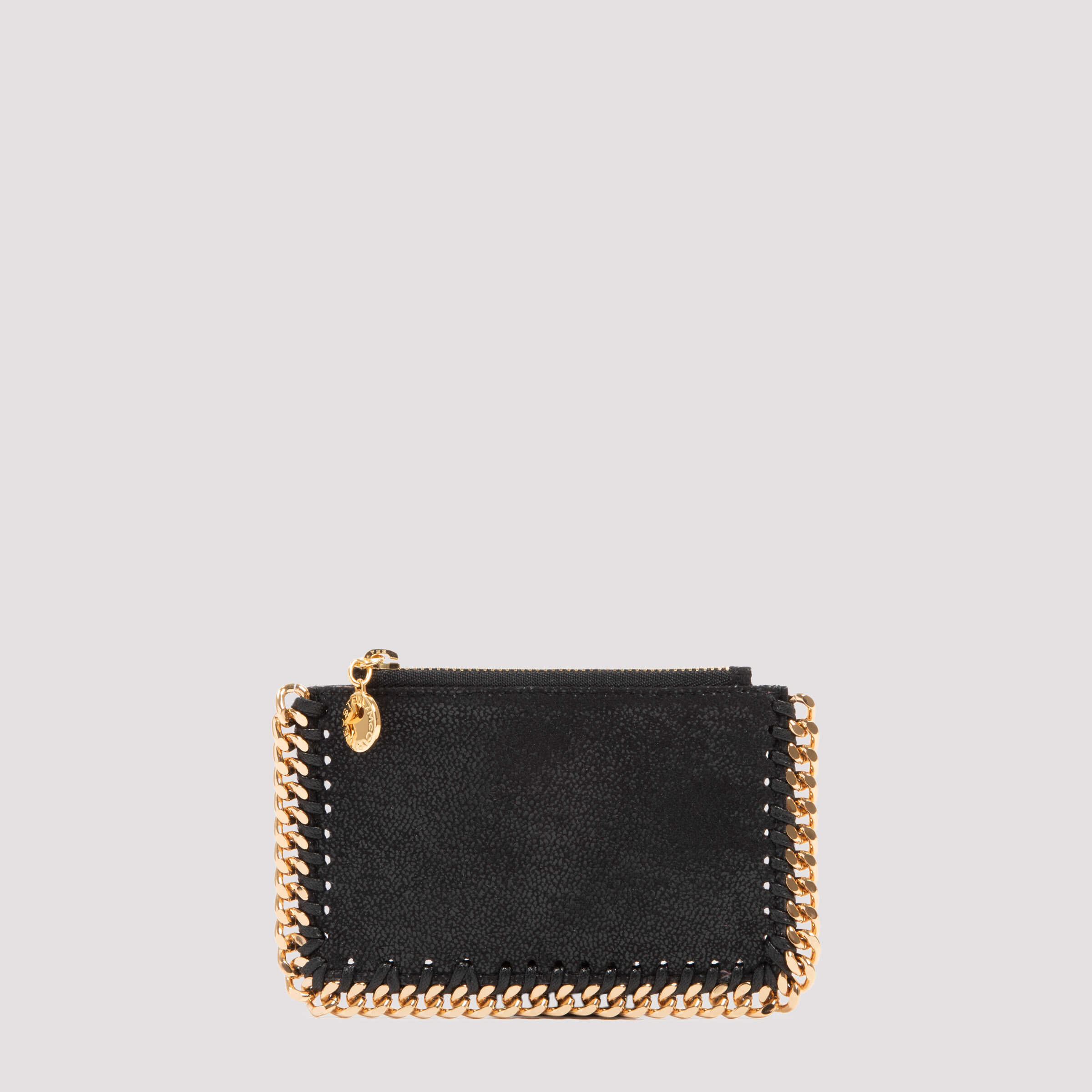 Stella McCartney Black Falabella Cardcase. Black alter-leather with signature bronzer-tone diamond-cut chain trims, Stella McCartney disc logo, zipped coin compartment and back card slots.