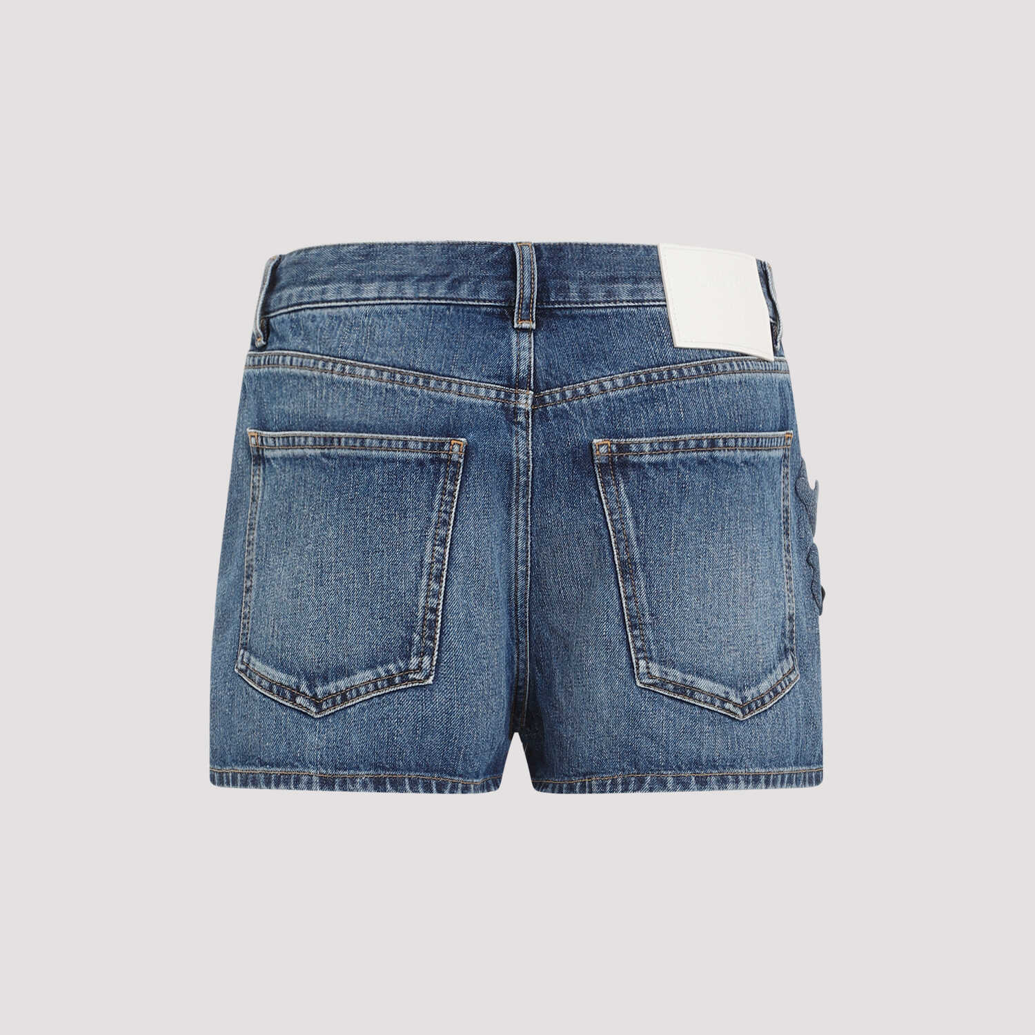 Valentino Ricamo Medium Blue Cotton Shorts. Medium blue cotton denim, used effect, belt loops, branded rivets, button and zipper closure, 5-pockets design, signature Altorilievo flower embroidery, branded label at the back waist, straight hem.