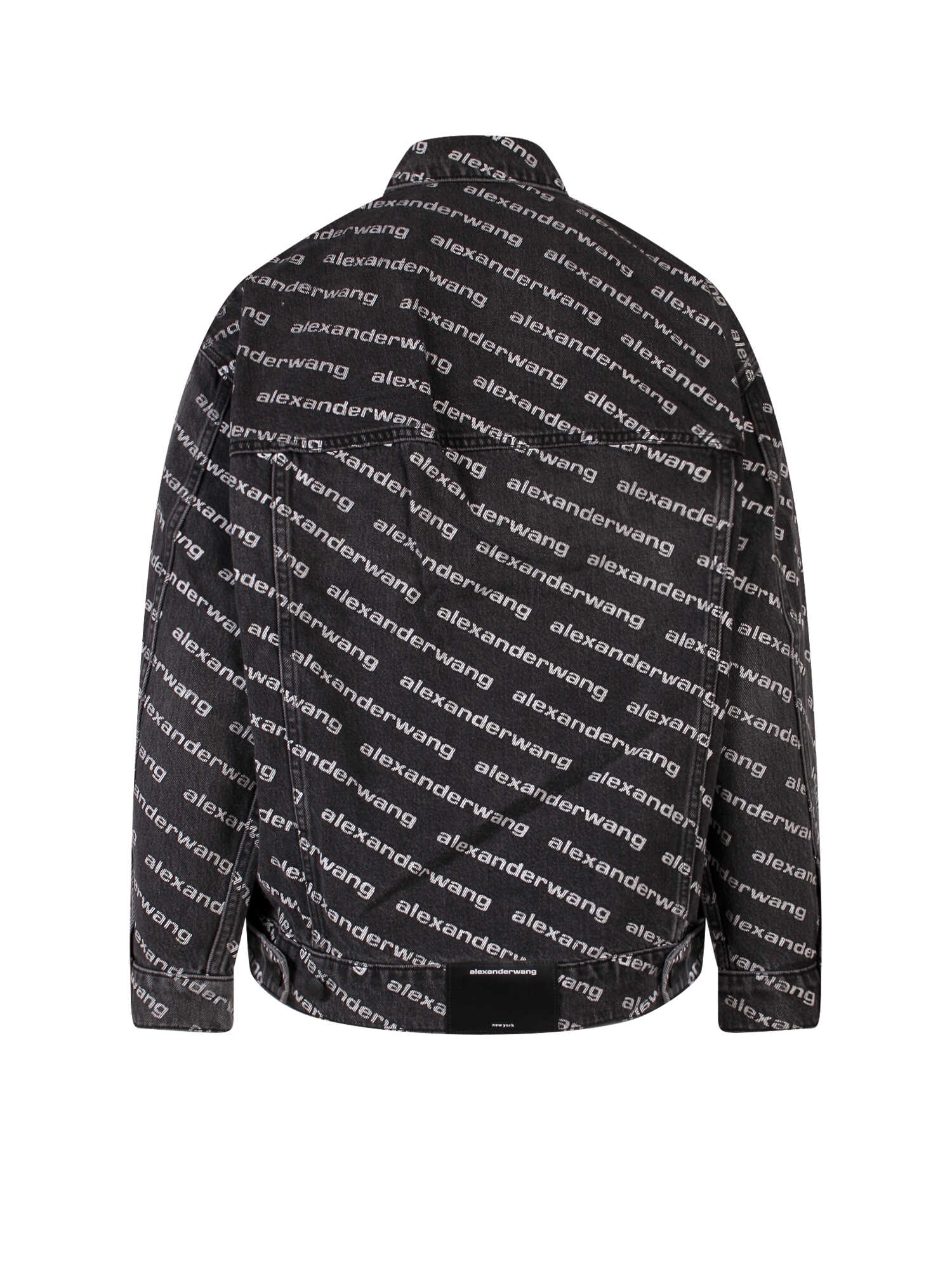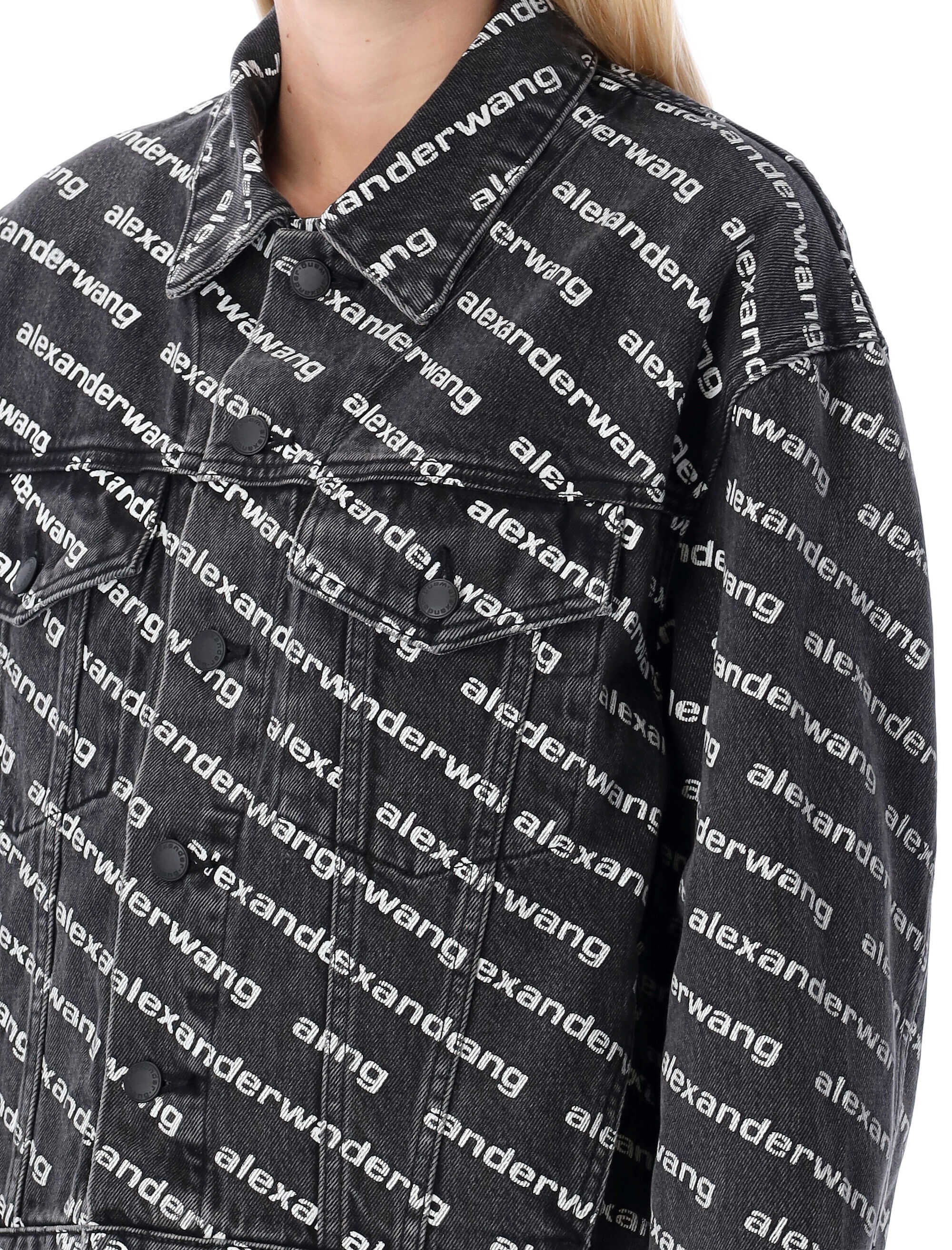 Stay stylish and comfortable with this black denim jacket from ALEXANDER WANG T. Made from 100% cotton, it features an all-over logo and applied pockets on the front. The pointed collar and metal logoed button closure add a touch of elegance to this trendy jacket. Available in LETTERS: 0 cm size range, it's perfect for women who love stylish jackets and coats. Get yours today!