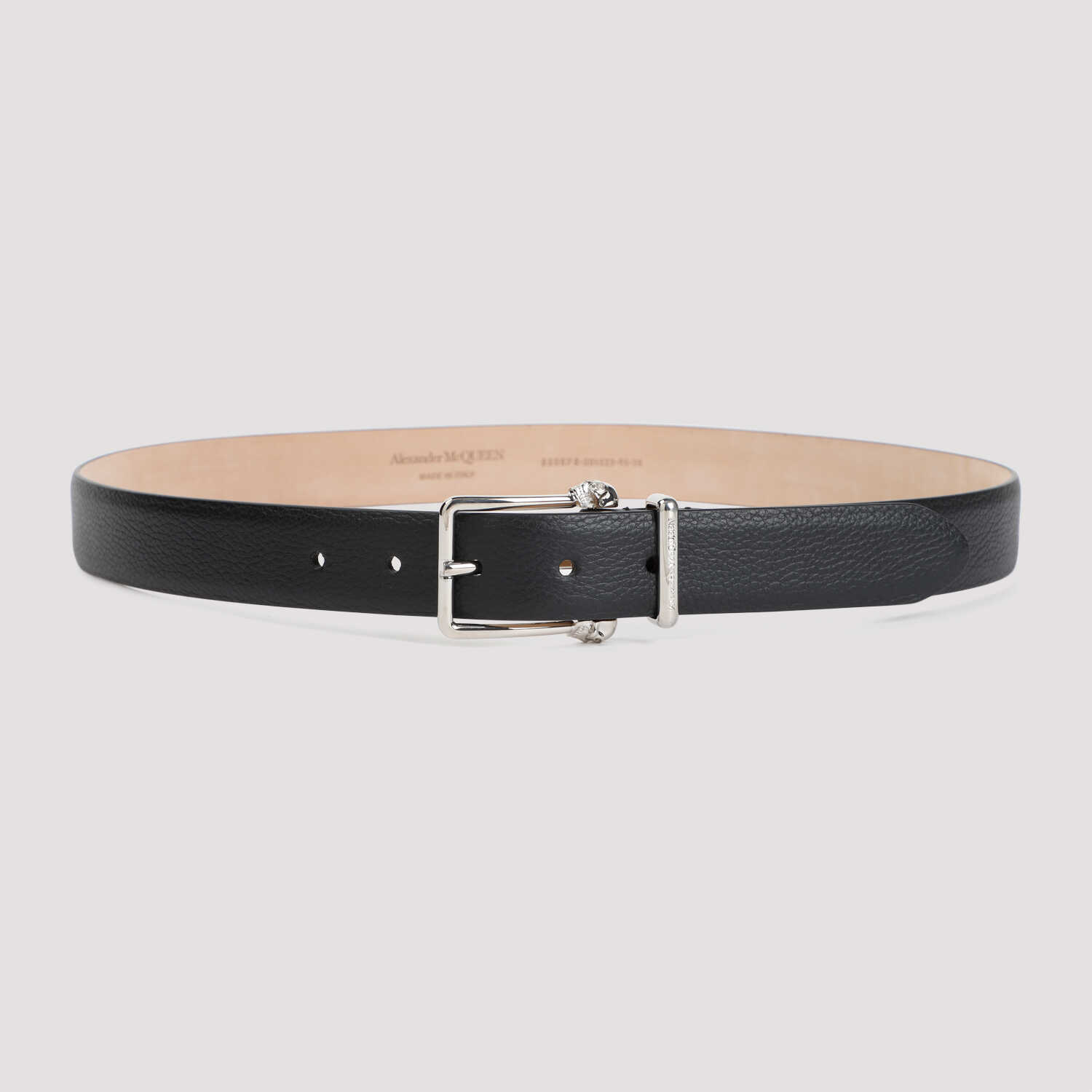 Alexander McQueen Thin Twin Skull Black Grained Leather Belt. Black grained leather, silver-tone hardware, buckle with signature skulls embellishment, metal belt loop with embossed logo, adjustable fit.