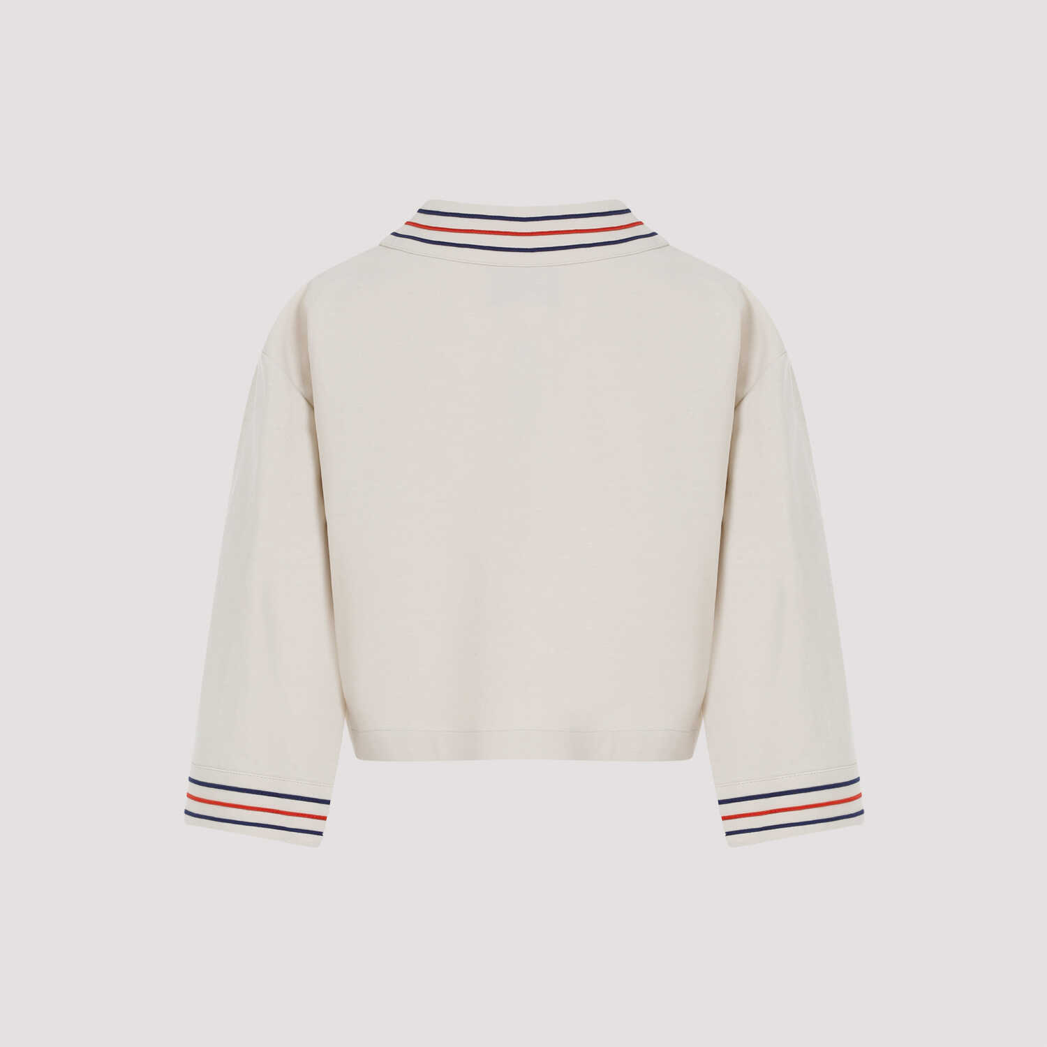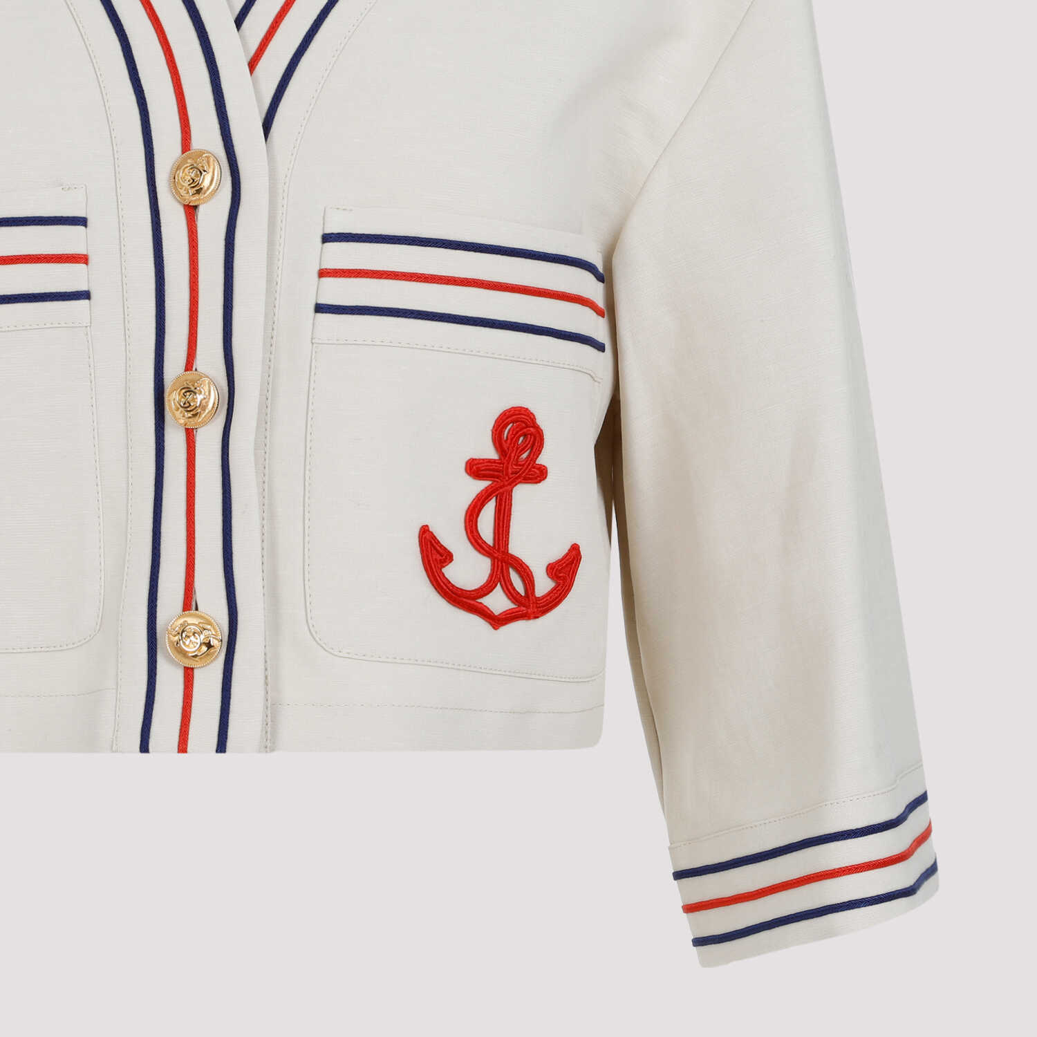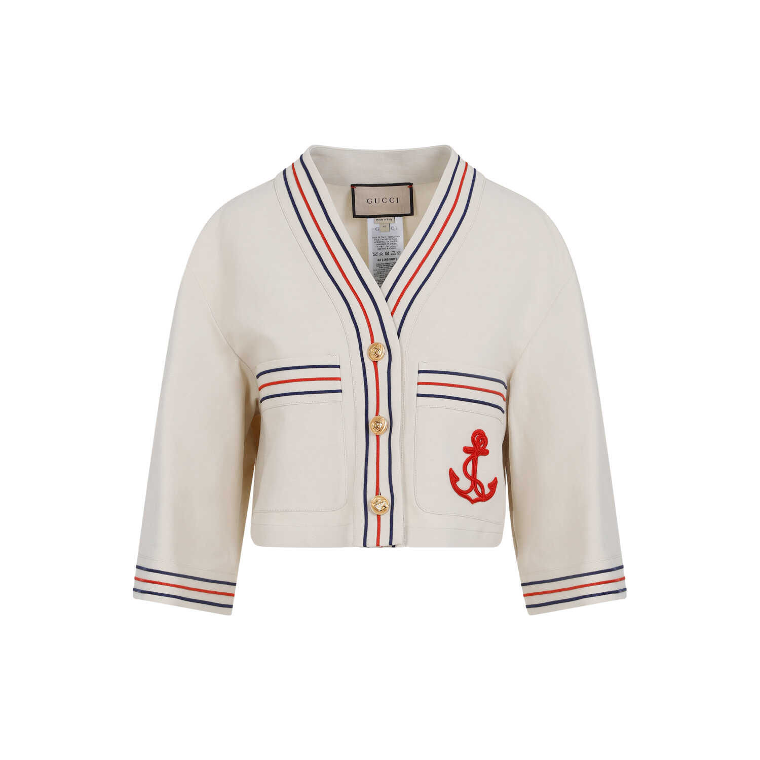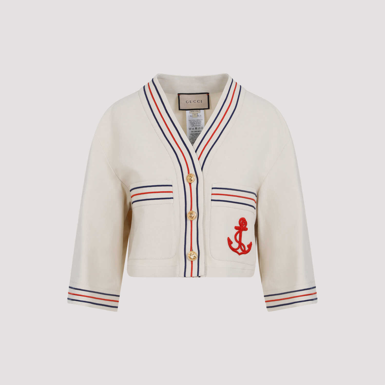Gucci White Gardenia Cotton Shirt. Crafted in cotton and linen blend. V-neck, front buttoned fastening, two front pockets, front red embroidered anchor, dropped shoulder, long sleeves, cropped design, straight hem. Blue and red stripes on the trims.
