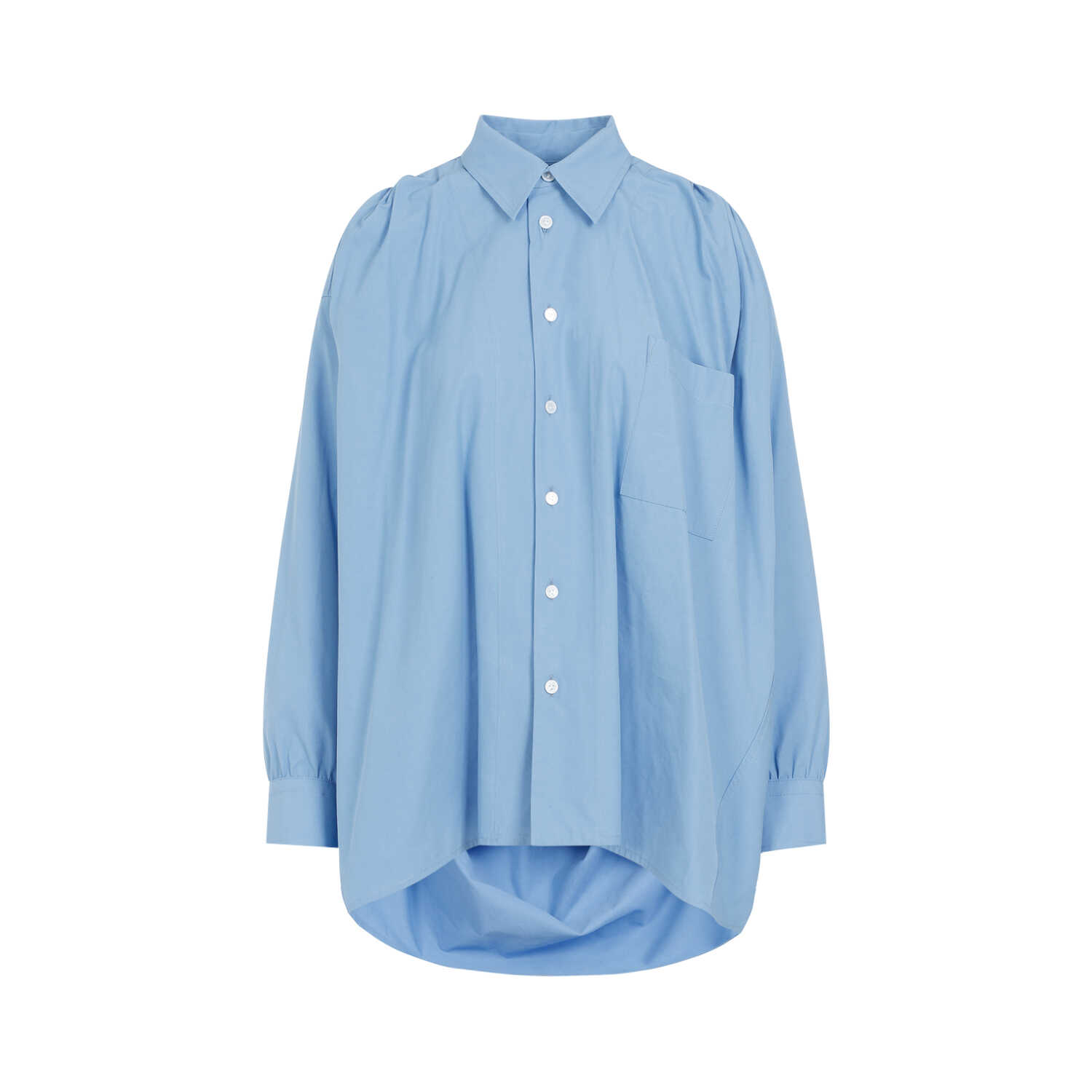 Bottega Veneta Light Blue Cotton Shirt. Crafted in light blue tech compact cotton, classic shirt collar, front button closure, patch pocket at the breast, dropped shoulders, buttoned cuffs, pleated at the back, round hem, oversized fit.