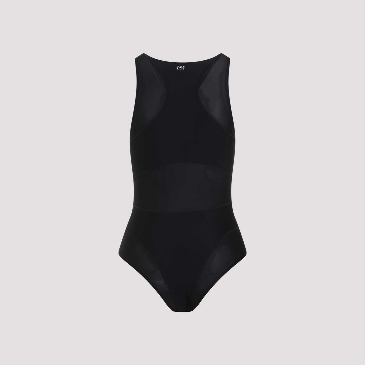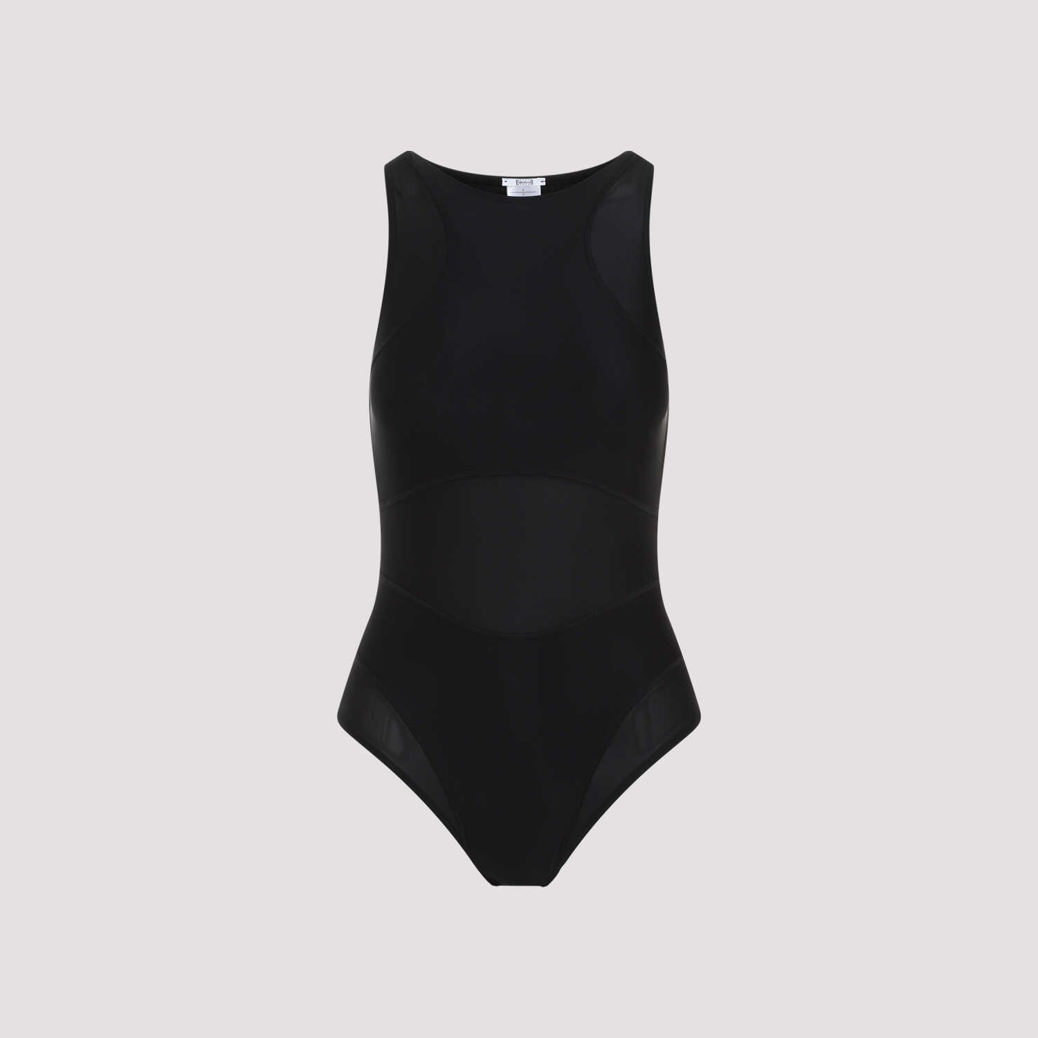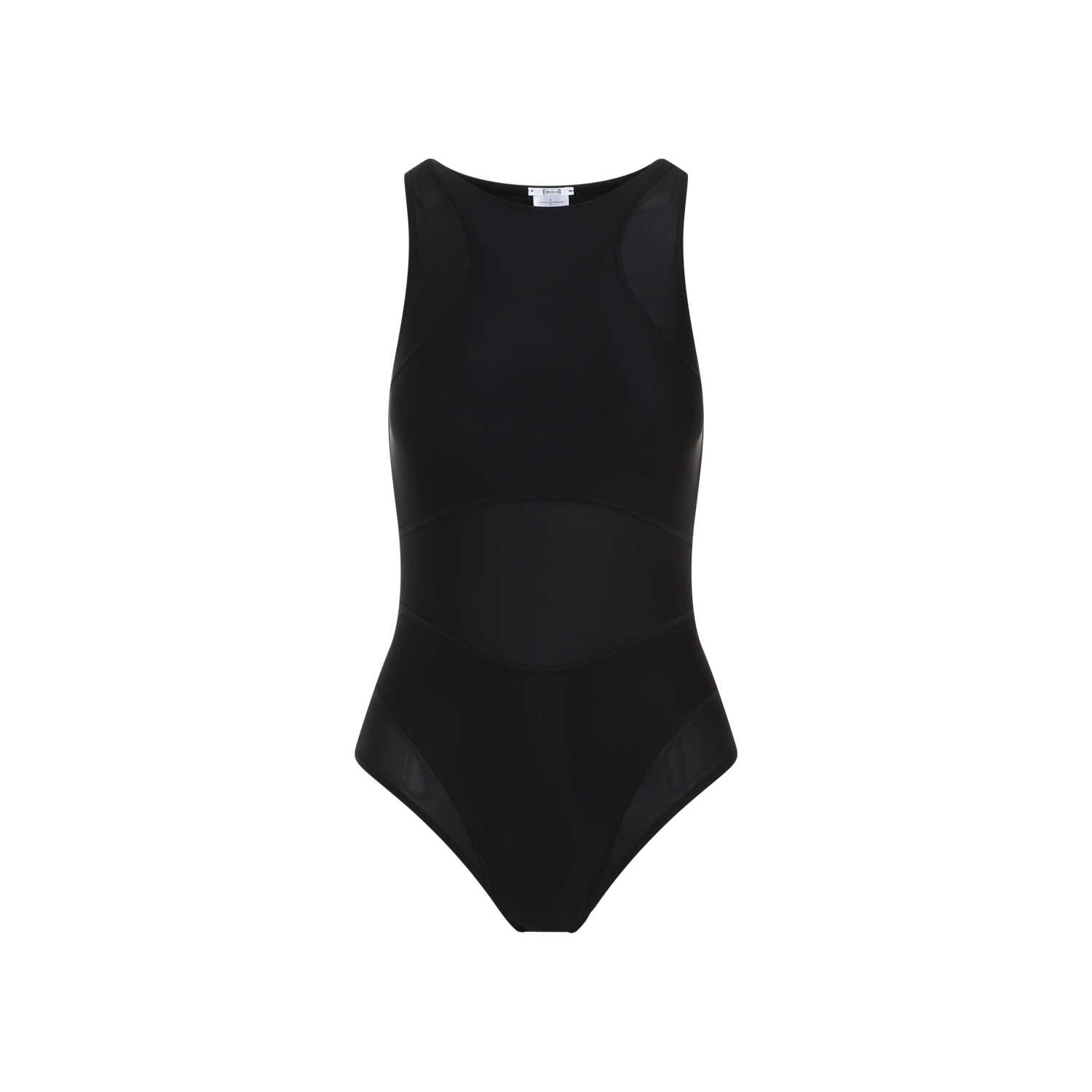 Wilford Active Flow Black Polyamide Body. Crafted from black tech fabric, semi-sheer lurex panels, round neckline, sleeveless, button tab closure on the brazilian slip.
