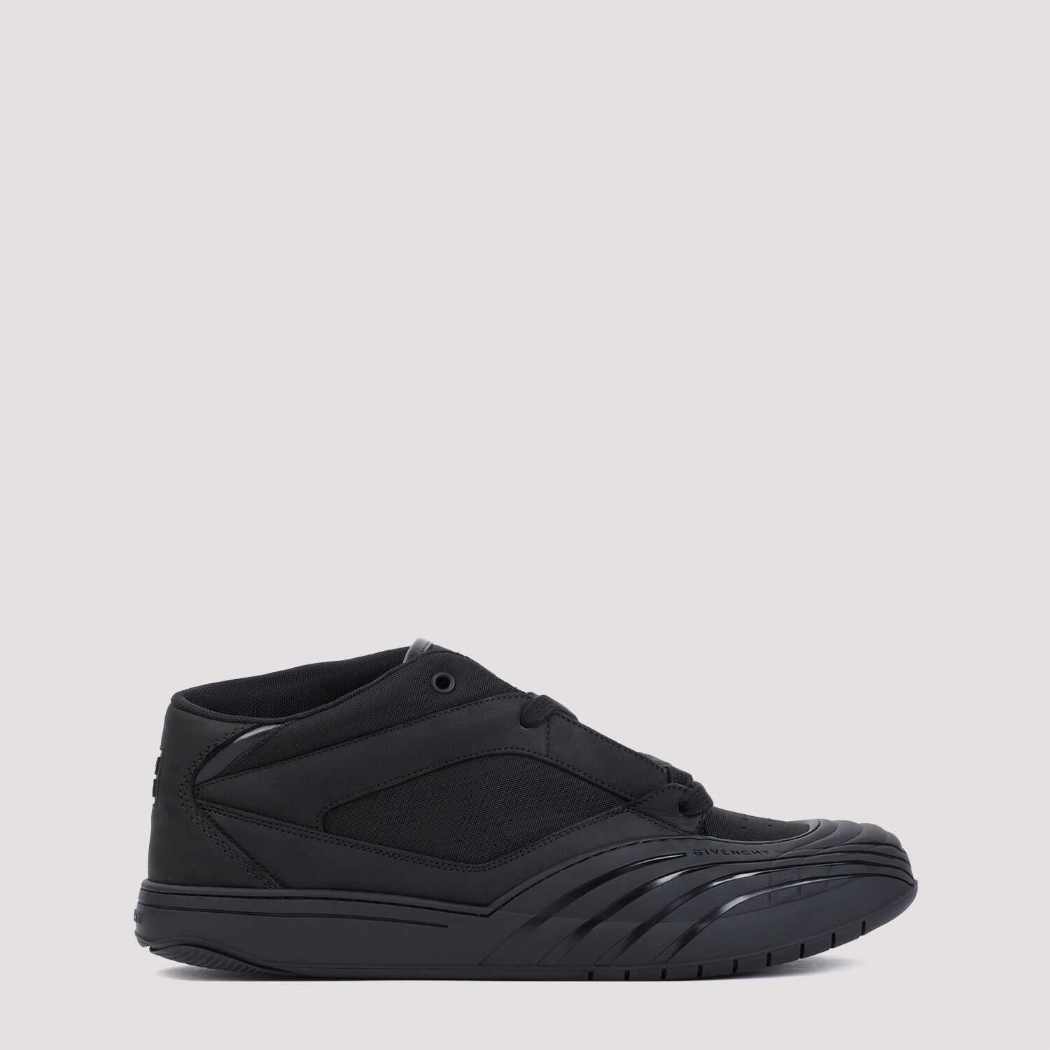 Givenchy Black Calf Leather New Line Men Shoes Mid-Top Sneakers. Pure black calf leather sneakers, rubber logoed details on the toe, top lace-up fastening, signature logo embossed on the heel, rubber detail with 4G logo on the back, inner insole with 4G signature logo, tonal sole.