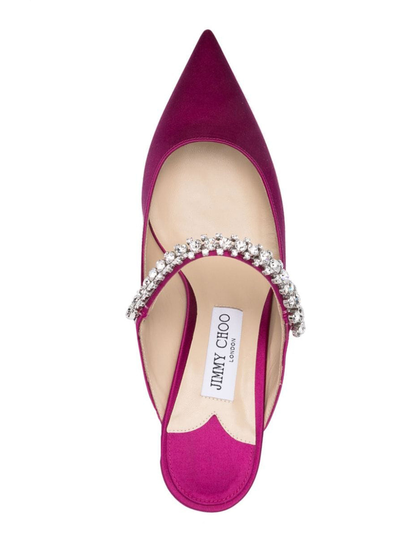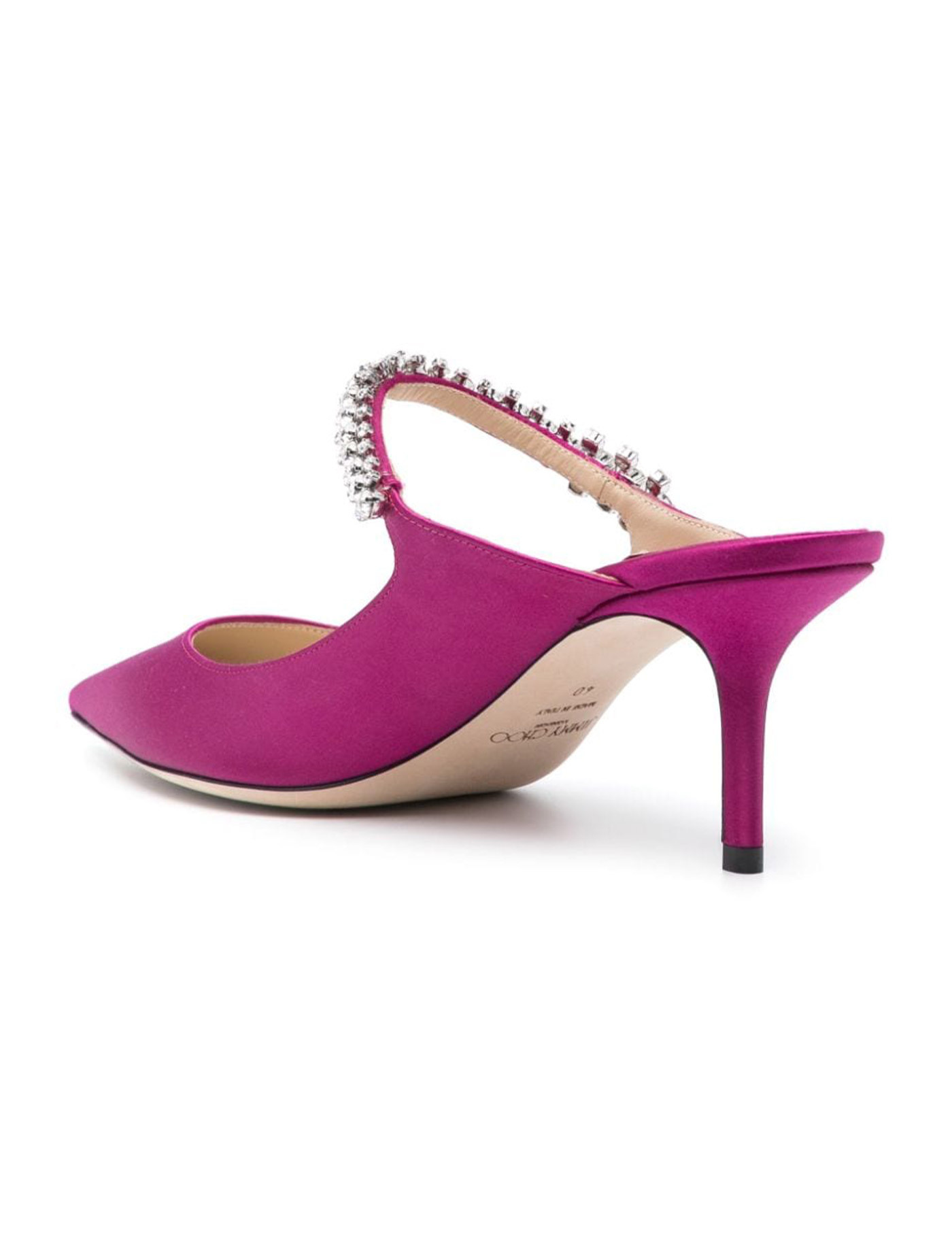 Bing satin mules by Jimmy Choo, decorated with embedded crystals on the front strap. Covered heel, leather lining, leather sole.