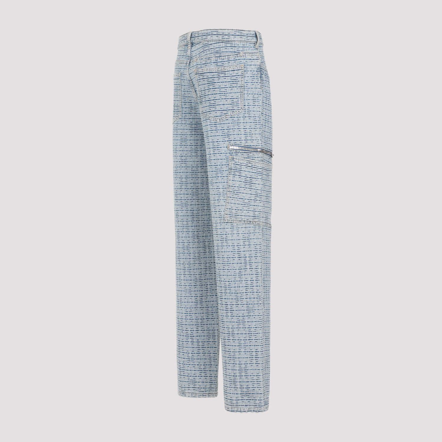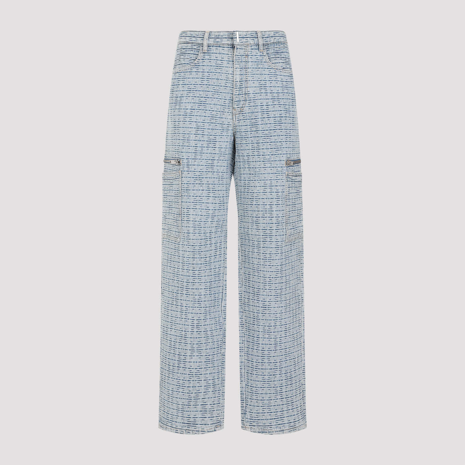 Givenchy Light Blue Cotton Pants. Pure light blue pants, front concealing zipped fastening, front logoed hook fastening, belt loops, two lateral pockets, two back pockets, two zipped pockets on the legs, wide leg, straight hem. Blue background with 4G light blue logo pattern all-over.