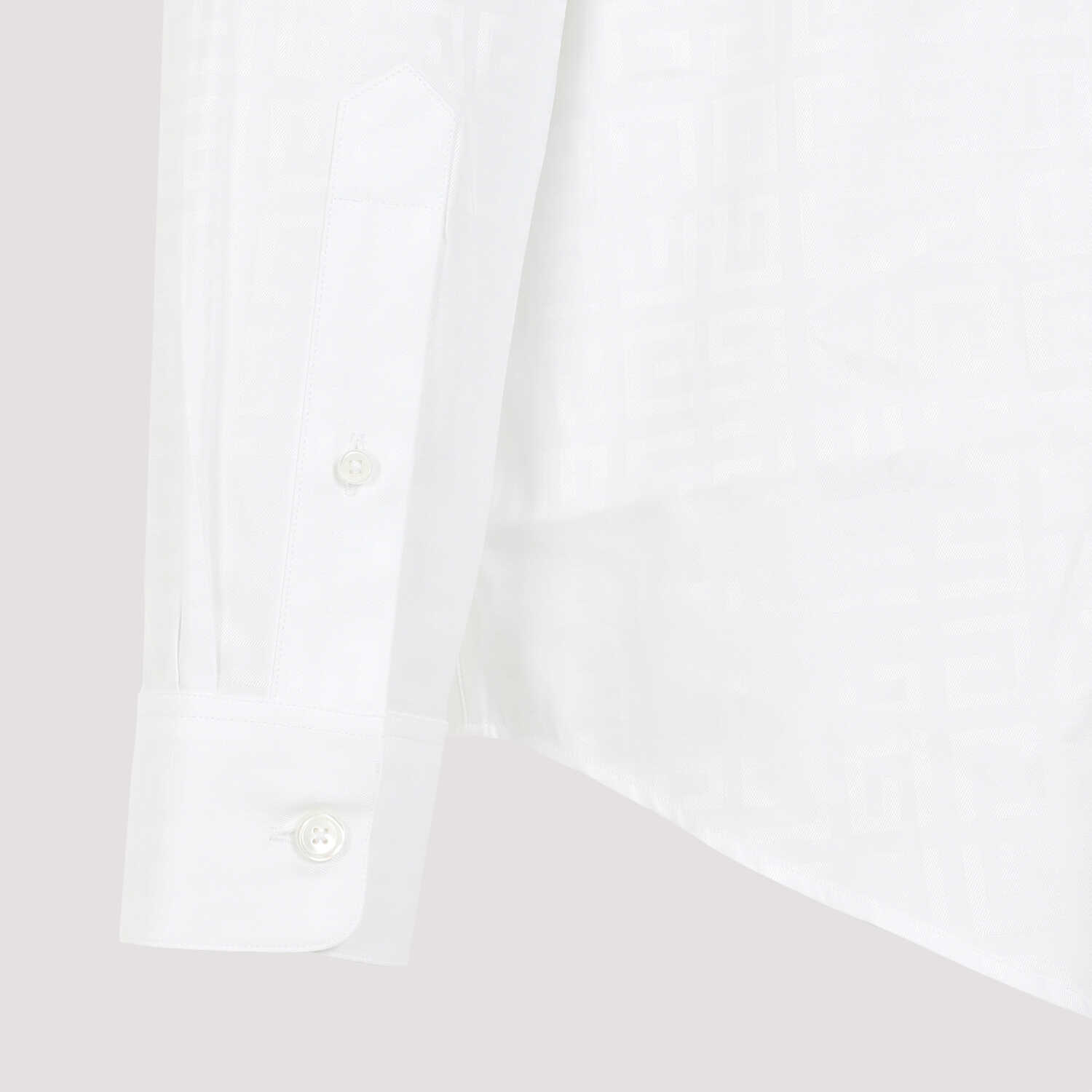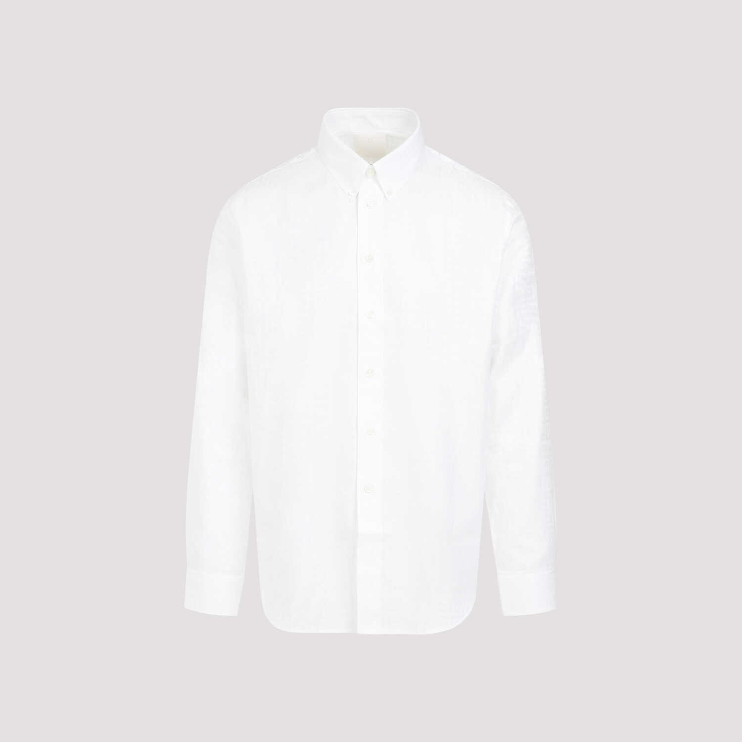 Givenchy White Cotton Shirt. Pure white cotton shirt, pointed collar, front buttoned fastening, long sleeves, buttoned cuffs, round hem. Tonal 4G logo pattern all-over.