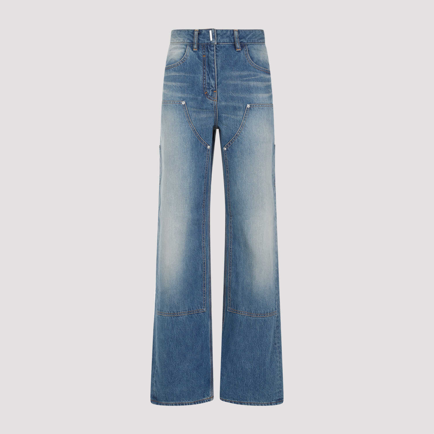 Givenchy Deep Blue Cotton Jeans. Deep blue cotton denim, distressed effect all over, belt loops, front closure, pockets on the front and two patch pockets with branded stud embellishment on the back, tonal inserts on the front, straight hem.